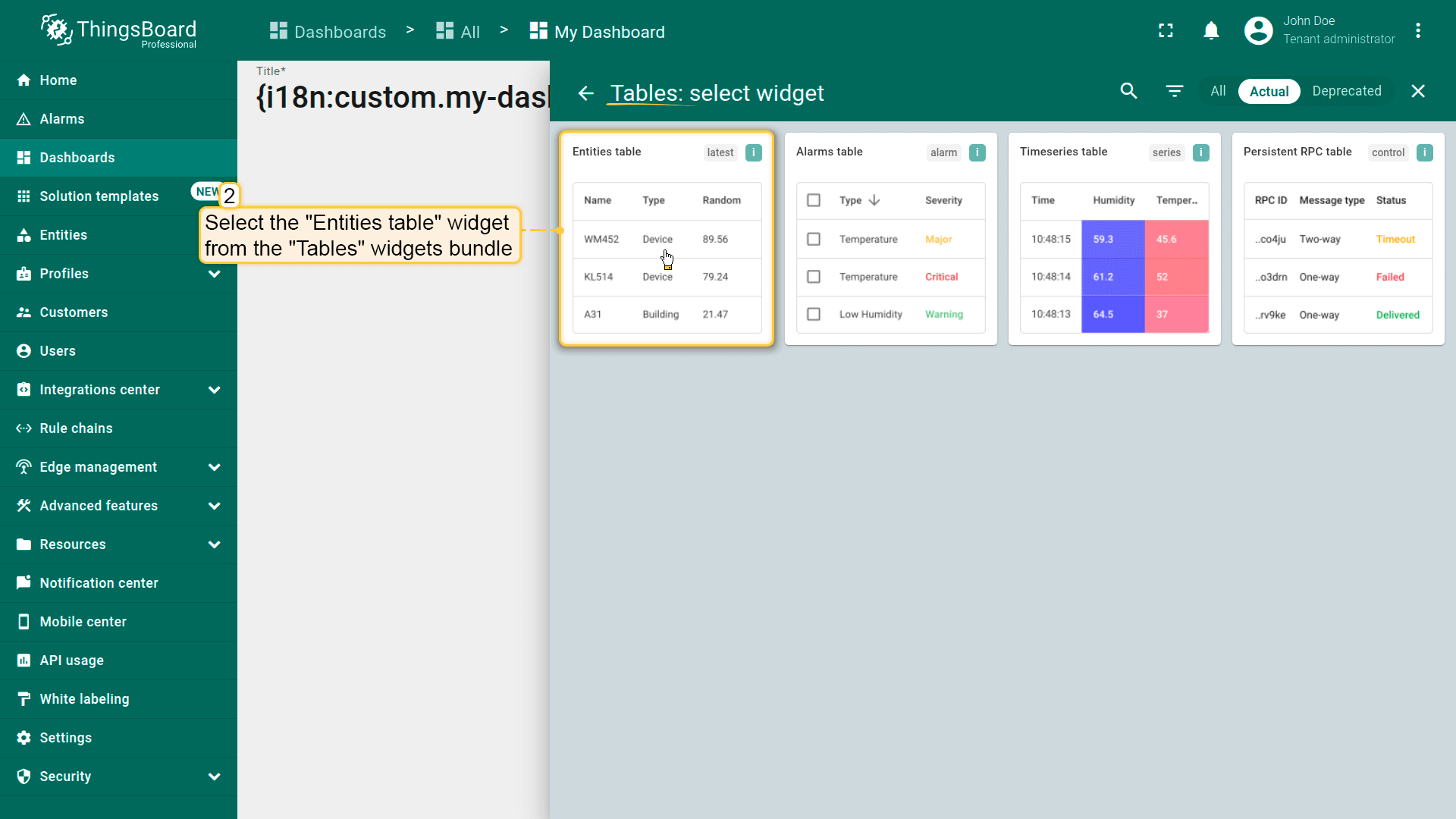Select the “Entities table” widget from the “Tables” widgets bundle.