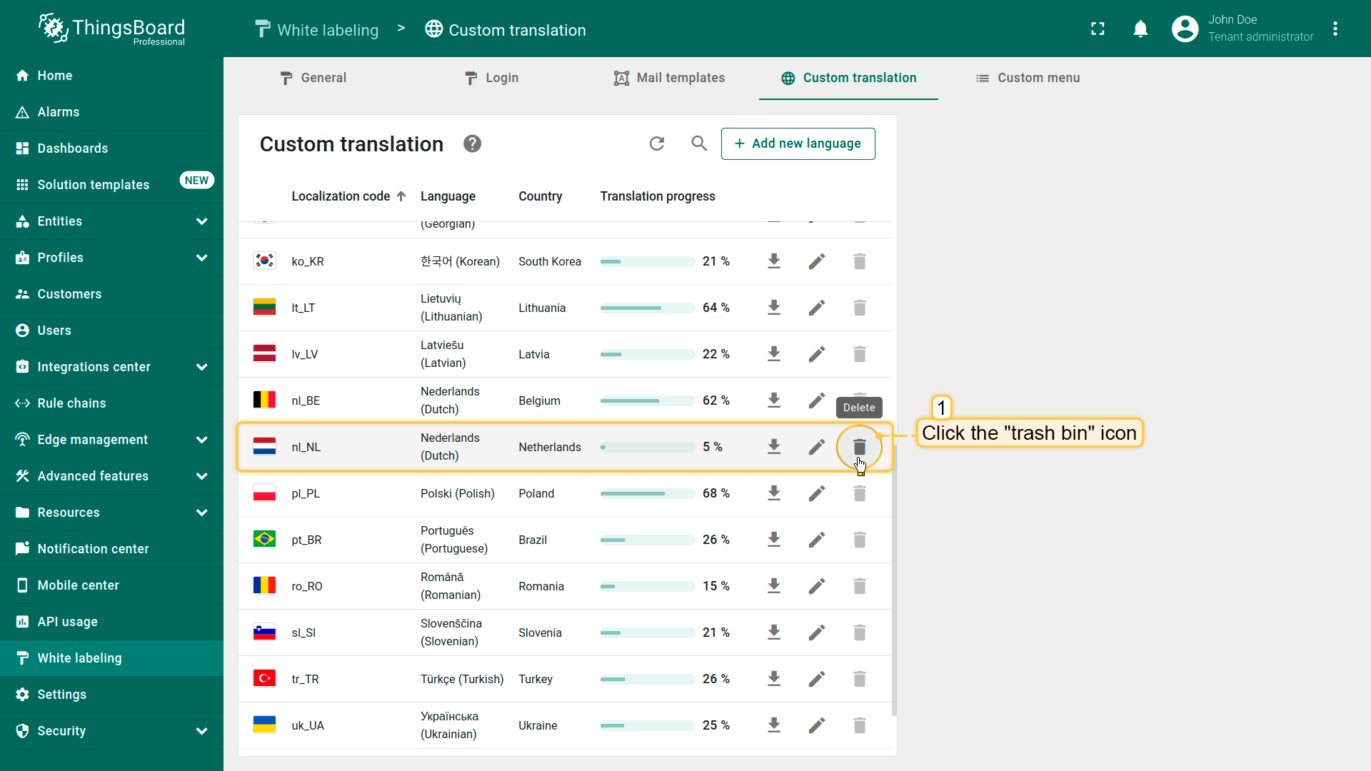 Tto delete a language or reset its translations to the default version, simply click the trash bin icon next to the corresponding language.