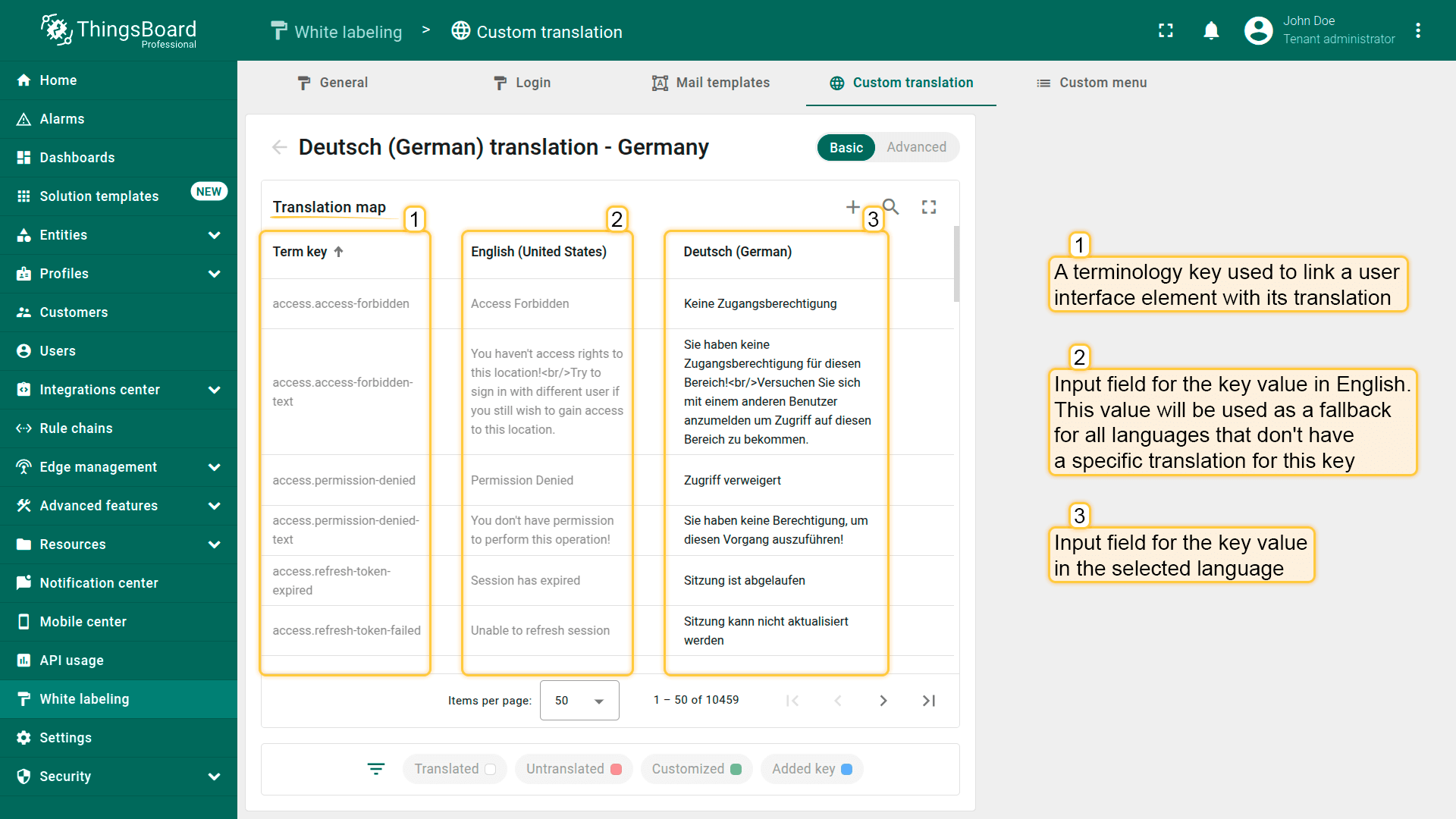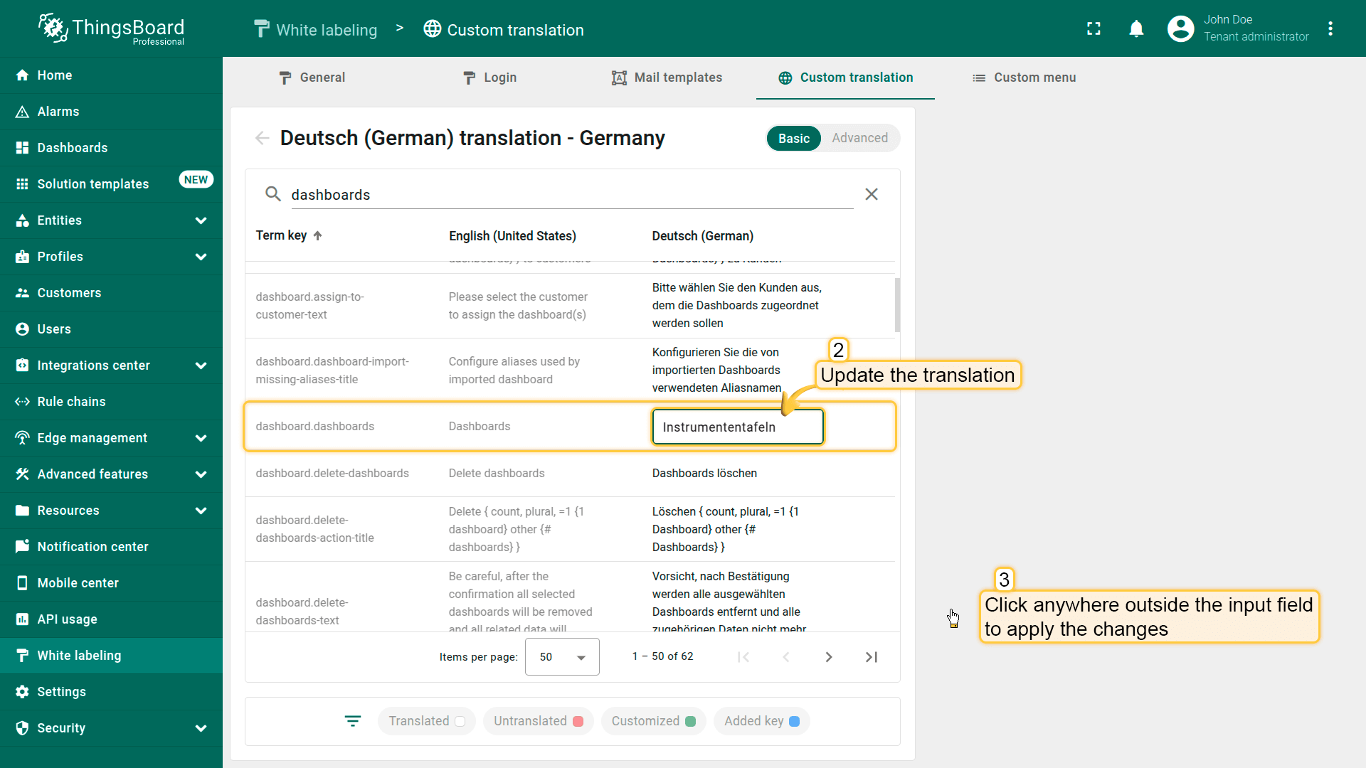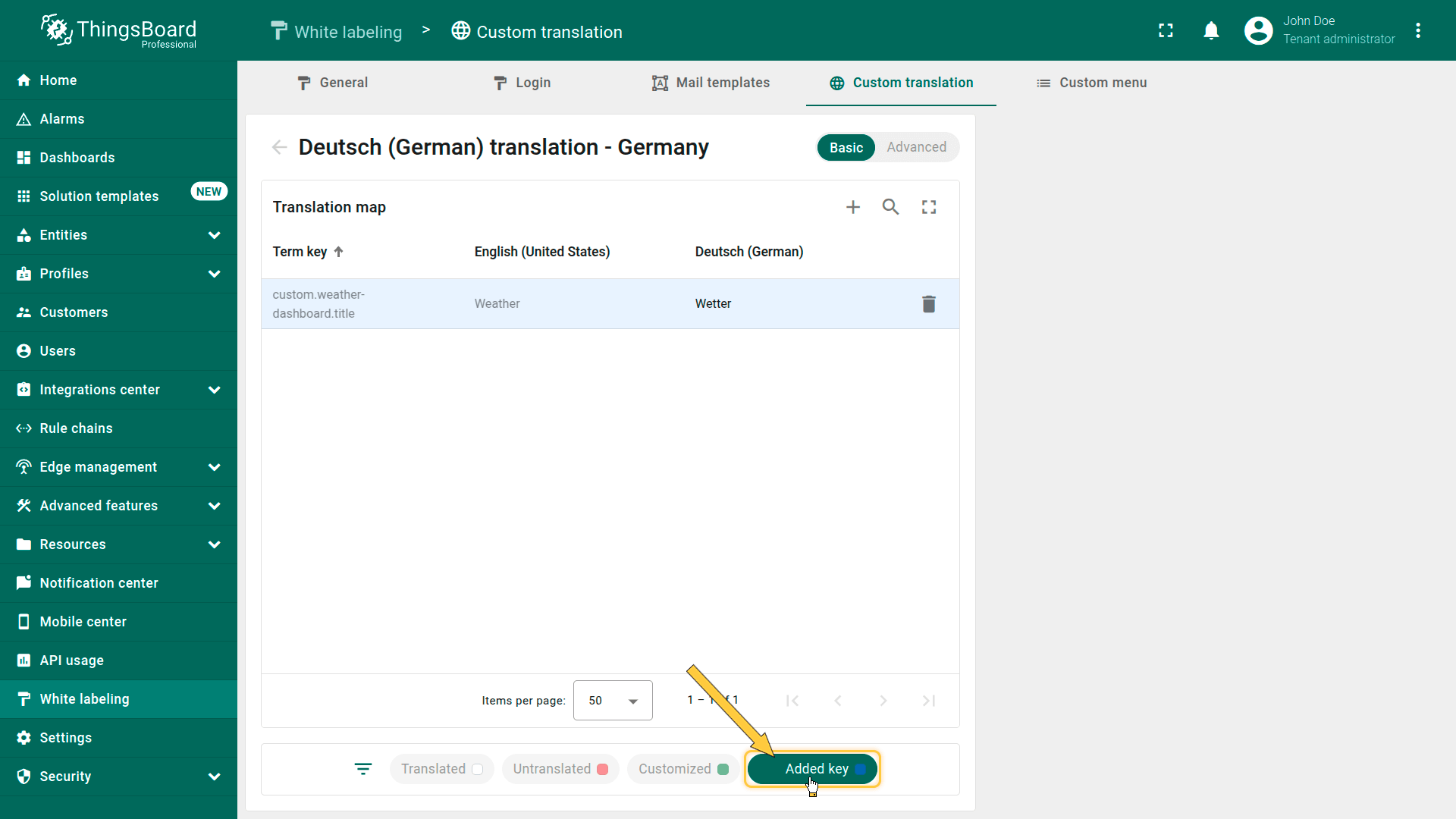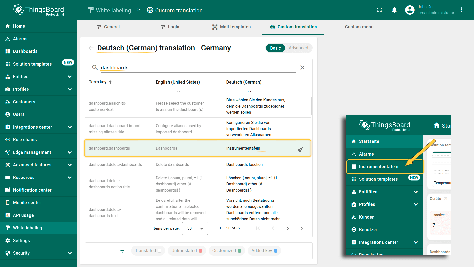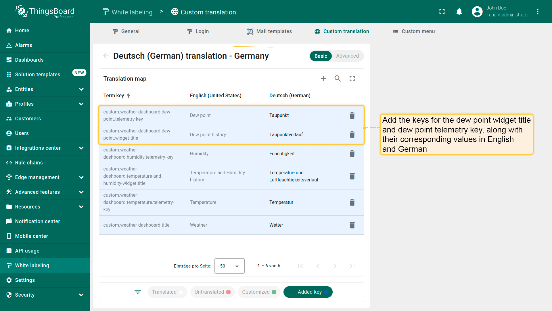 可使用i18n格式的翻译键,为新自定义菜单项或单个UI元素(如仪表板标题、部件名称、设备名称、数据键等)提供自定义翻译。