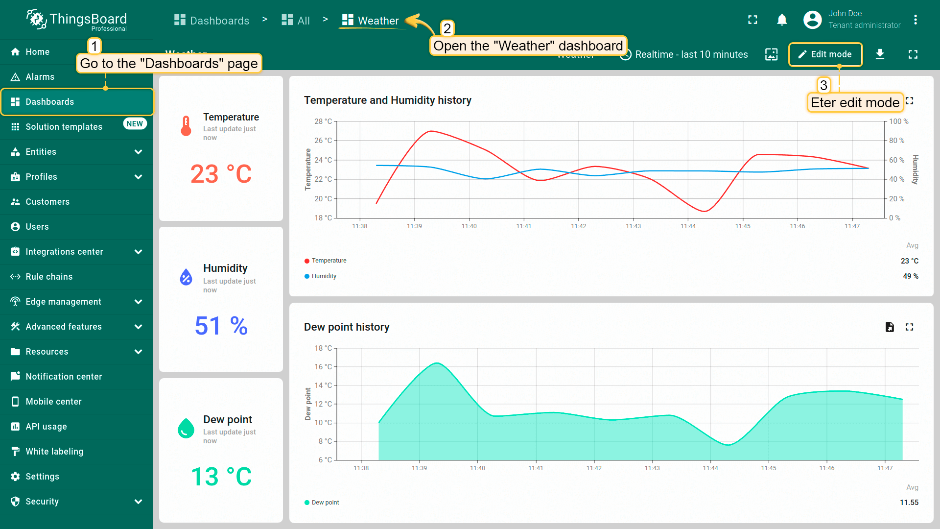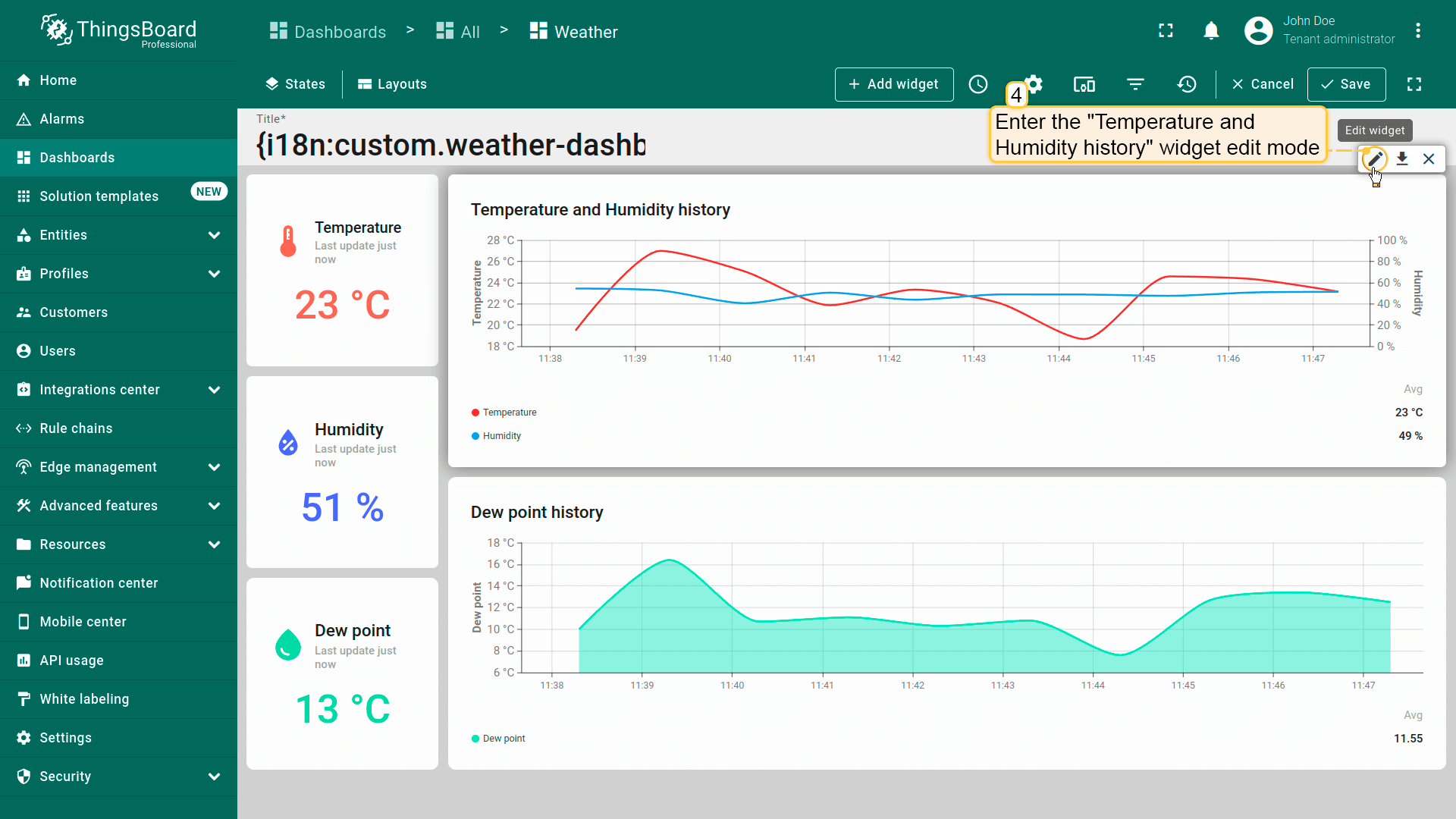 现在进入”Weather”仪表板,打开”Temperature and Humidity history”部件的编辑模式。