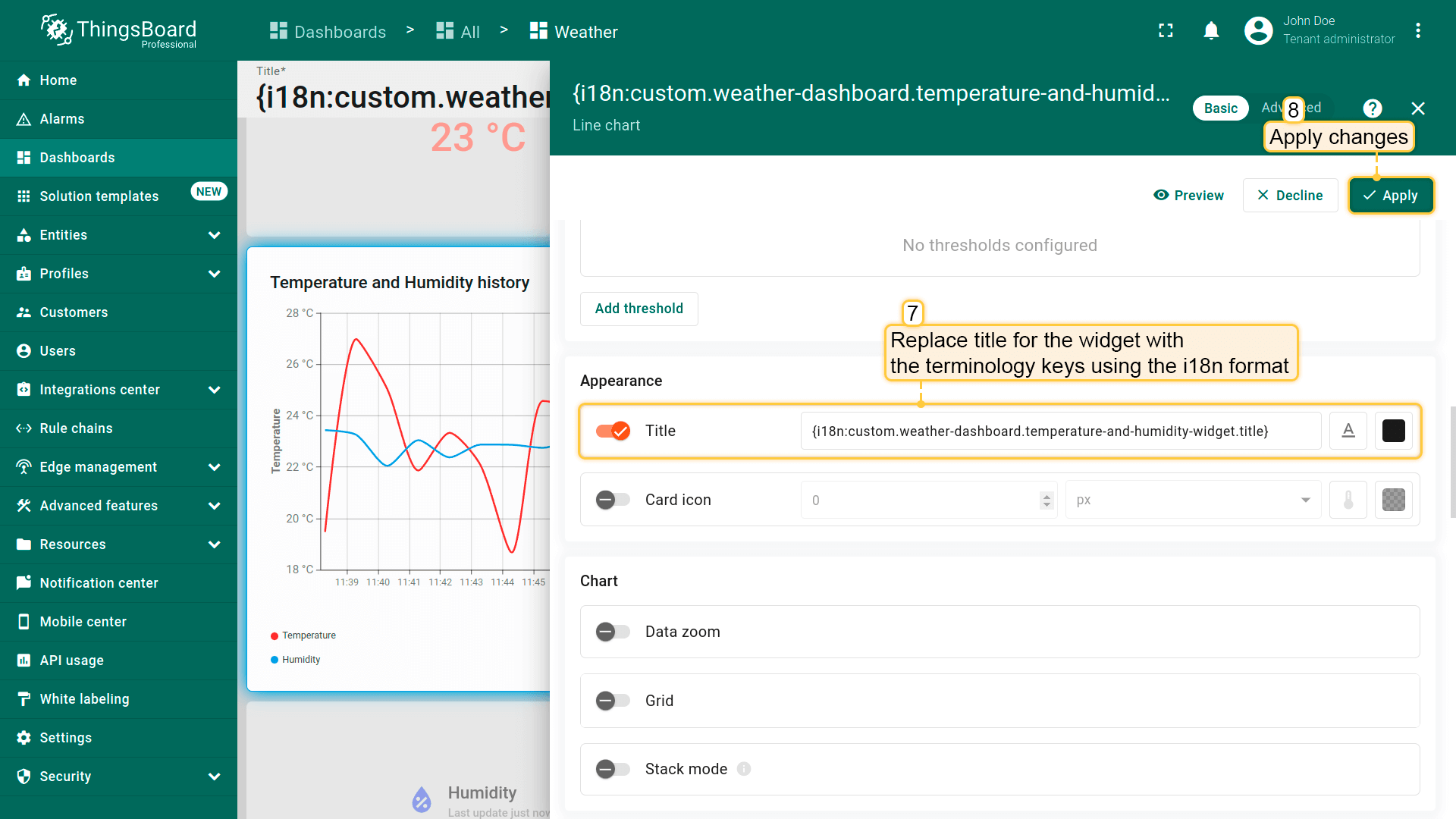 Assign the added internationalization keys as labels for the temperature and humidity telemetry keys.