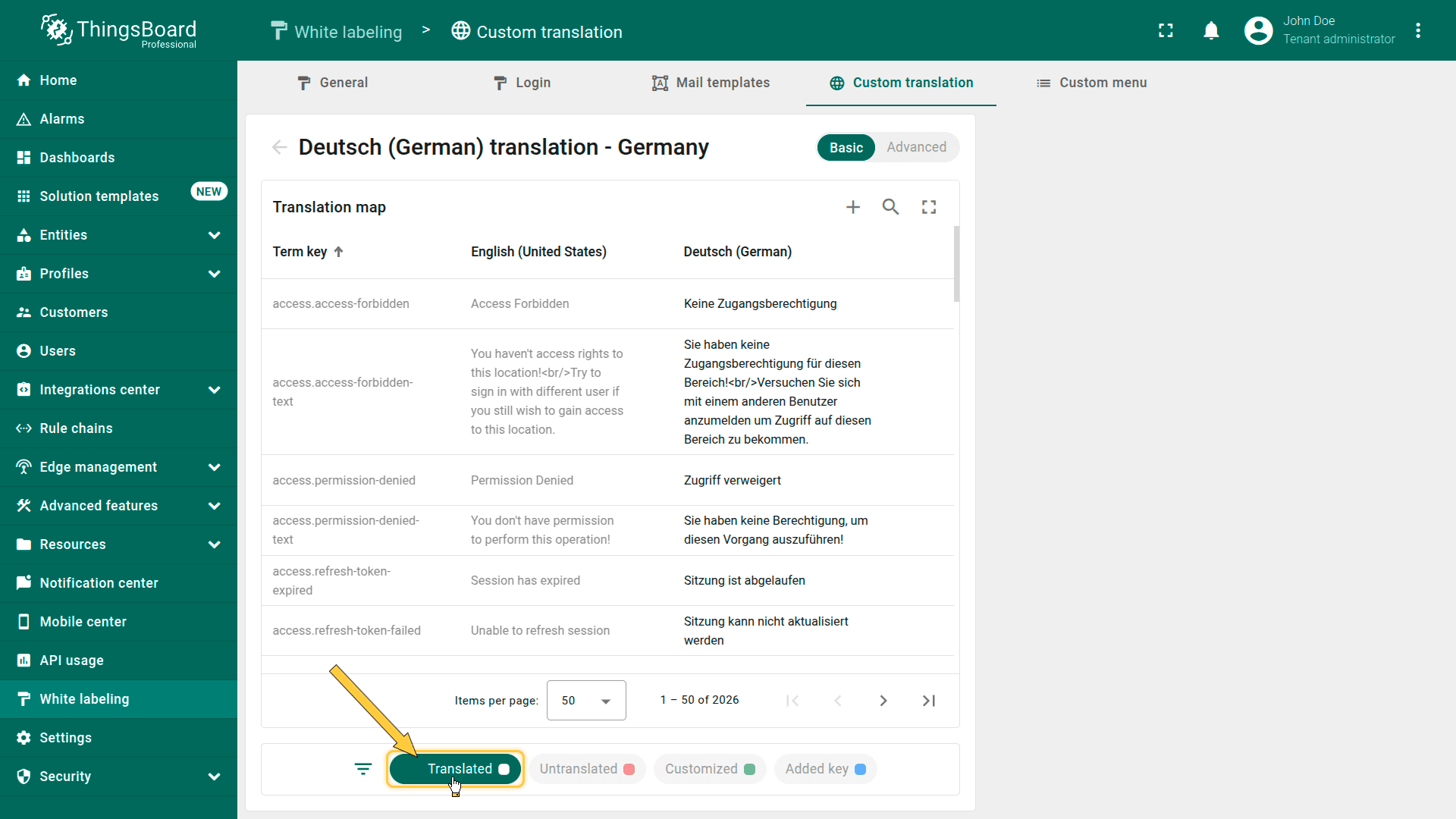 The “Translated” filter displays keys that already have a translation for the selected localization.