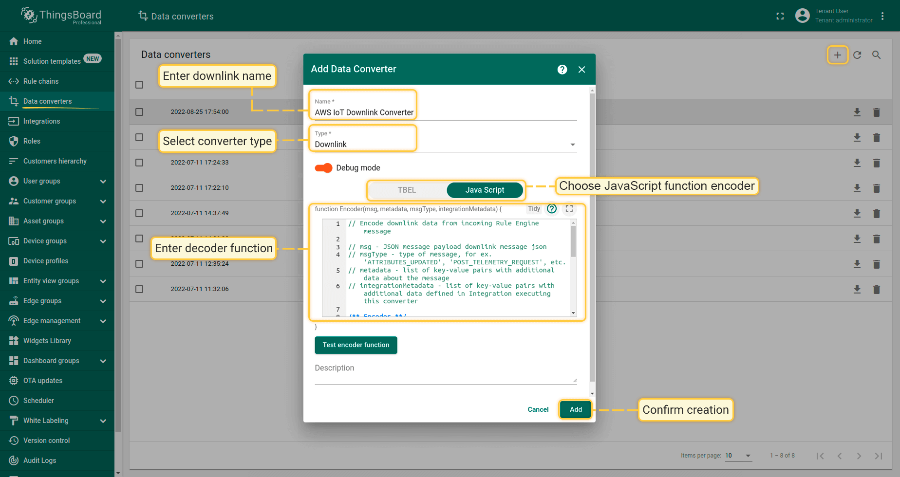 在创建集成之前,您需要在Data converters中创建一个上行数据转换器(Uplink converter)。上行数据转换器用于将设备传入的数据转换为ThingsBoard所需的显示格式。点击”加号”按钮,然后点击”Create new converter”。要查看事件,请启用Debug模式。在函数解码器字段中指定脚本,可以复制上行转换器示例,或使用自定义配置来解析和转换数据。
