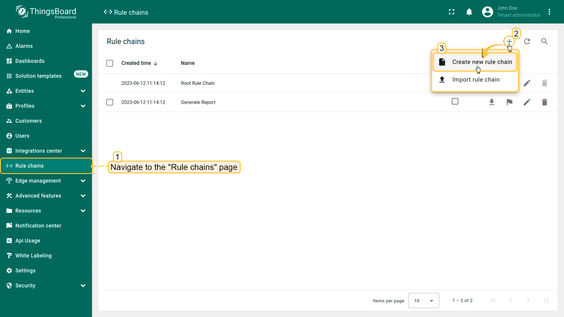 - Navigate to the "Rule chains" page. Then click on the "plus" icon in the upper right corner, and select "Create new rule chain";