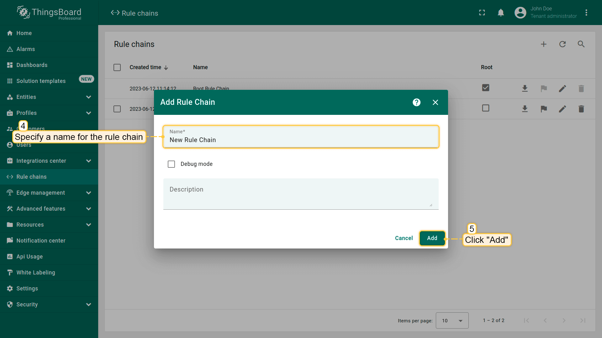 - Specify a name for the rule chain. If necessary, enable "Debug mode". Click "Add";