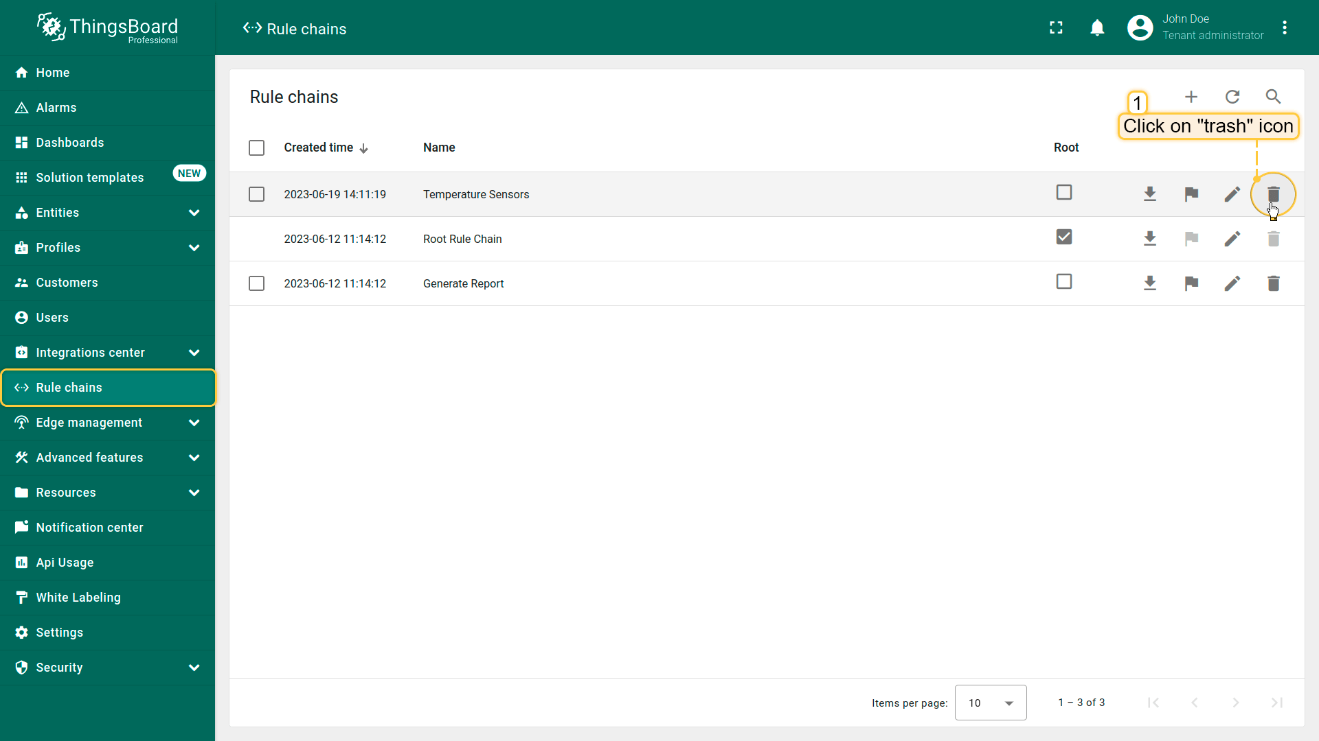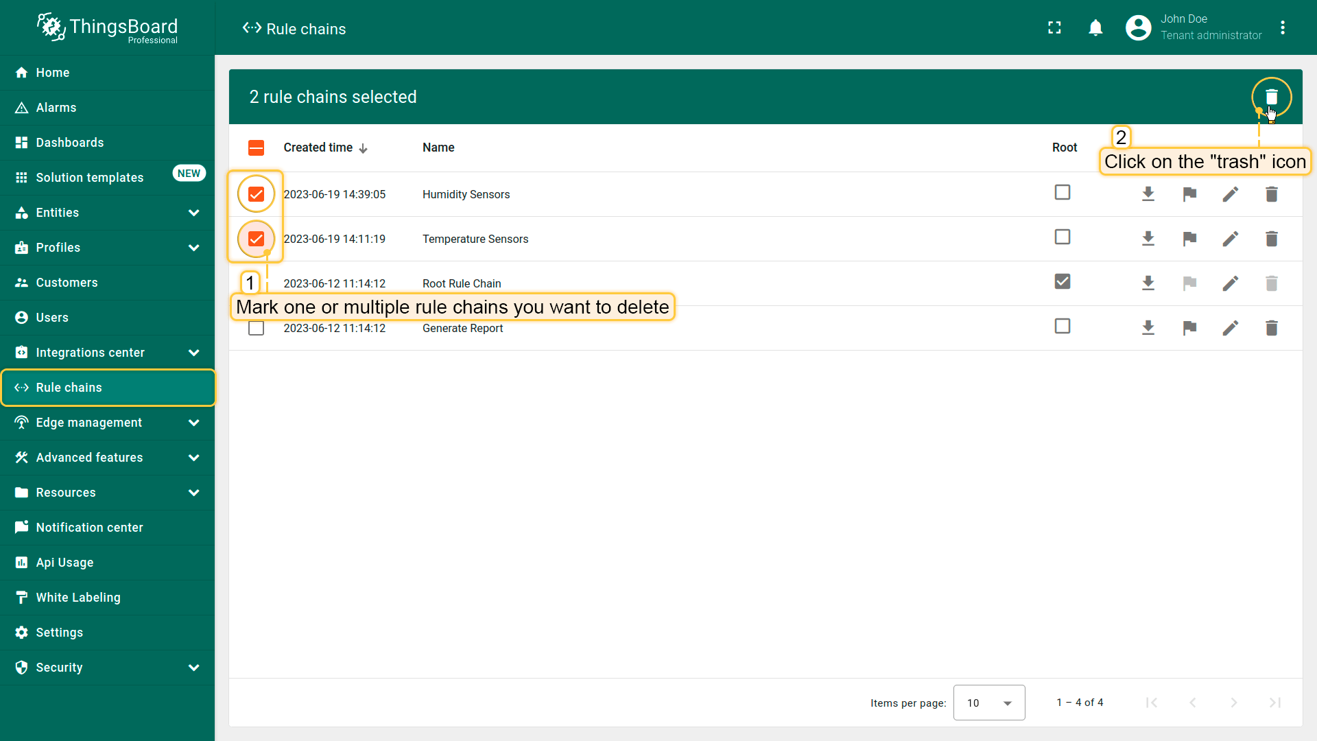 - Mark one or multiple rule chains you want to delete. Click on the trash bin icon in the top right corner;