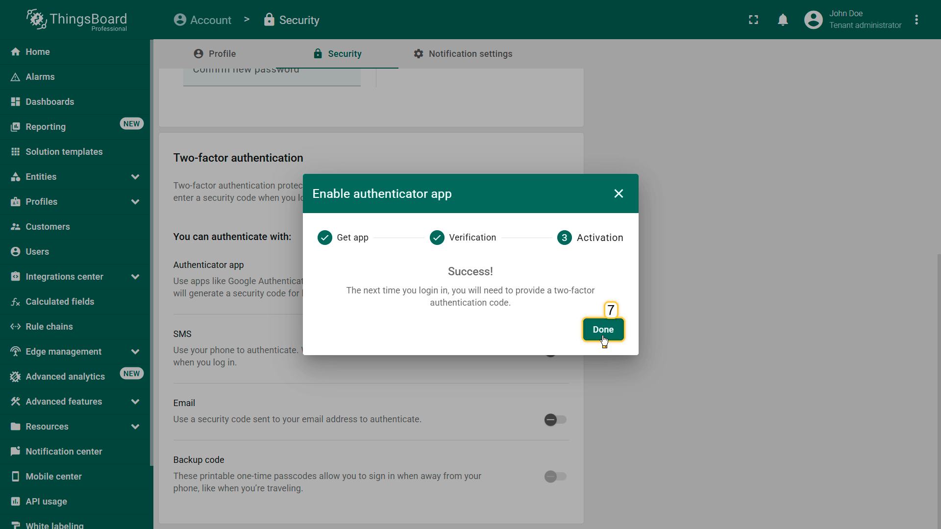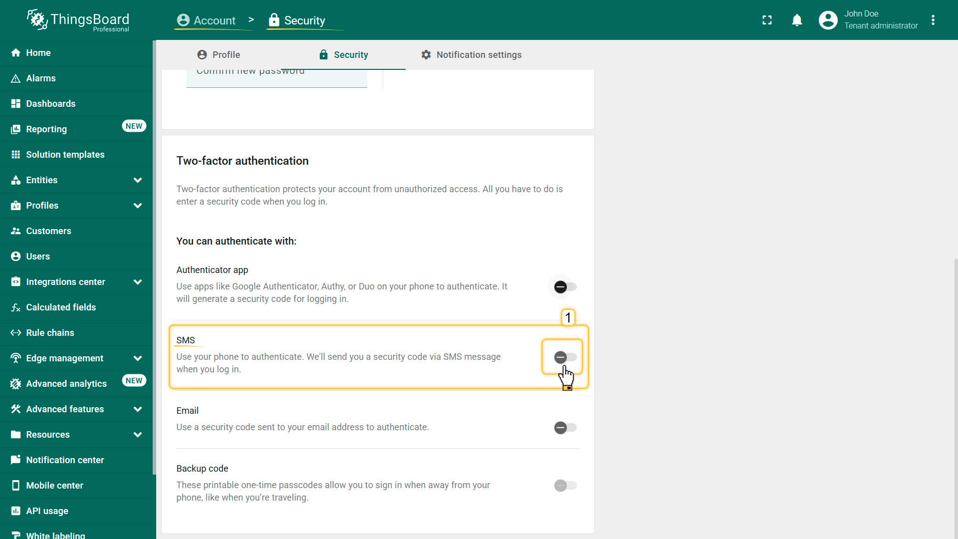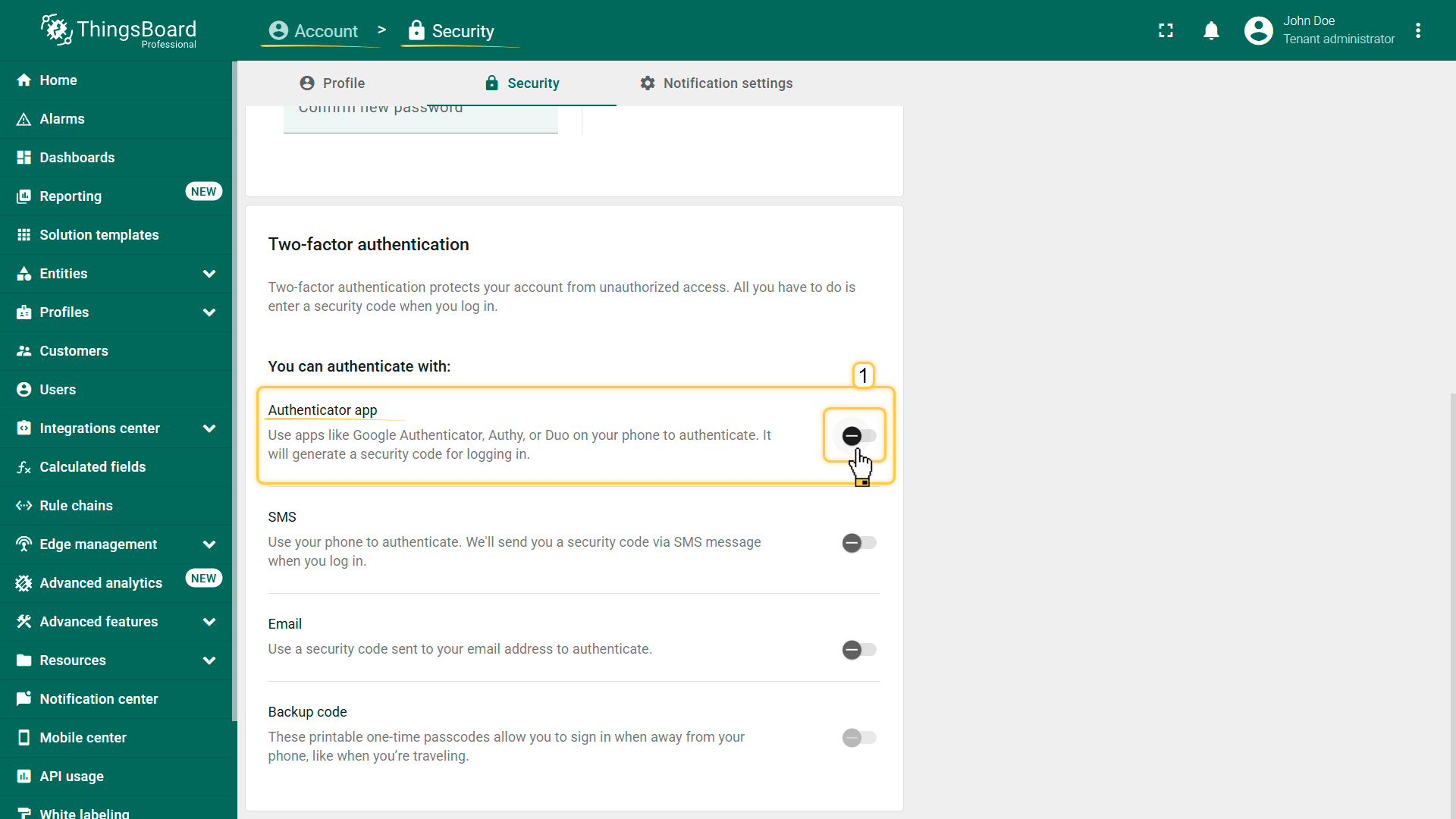 ThingsBoard支持多种2FA验证方式,可由管理员启用和配置,并按tenant选择性启用。