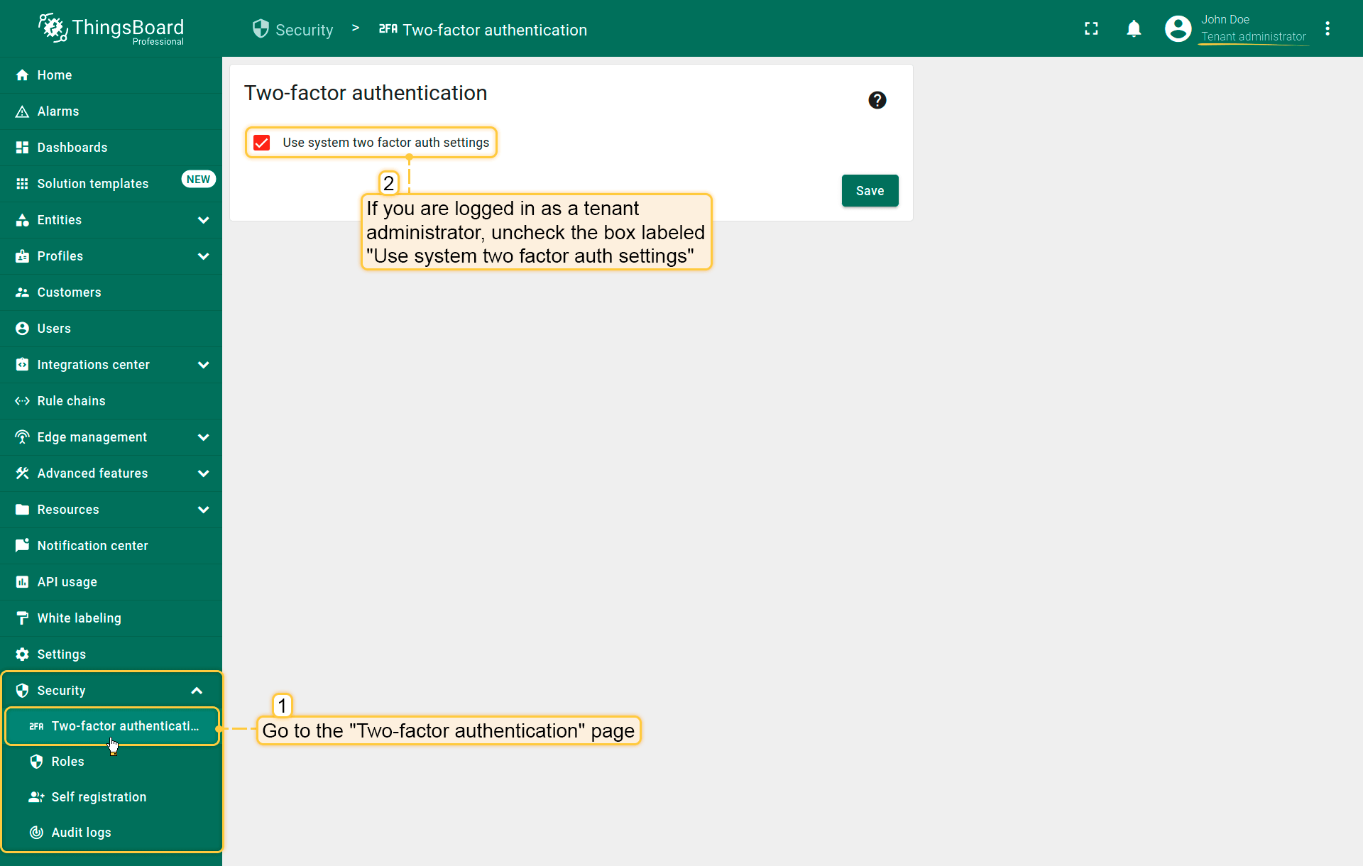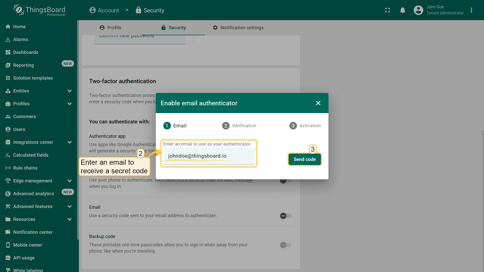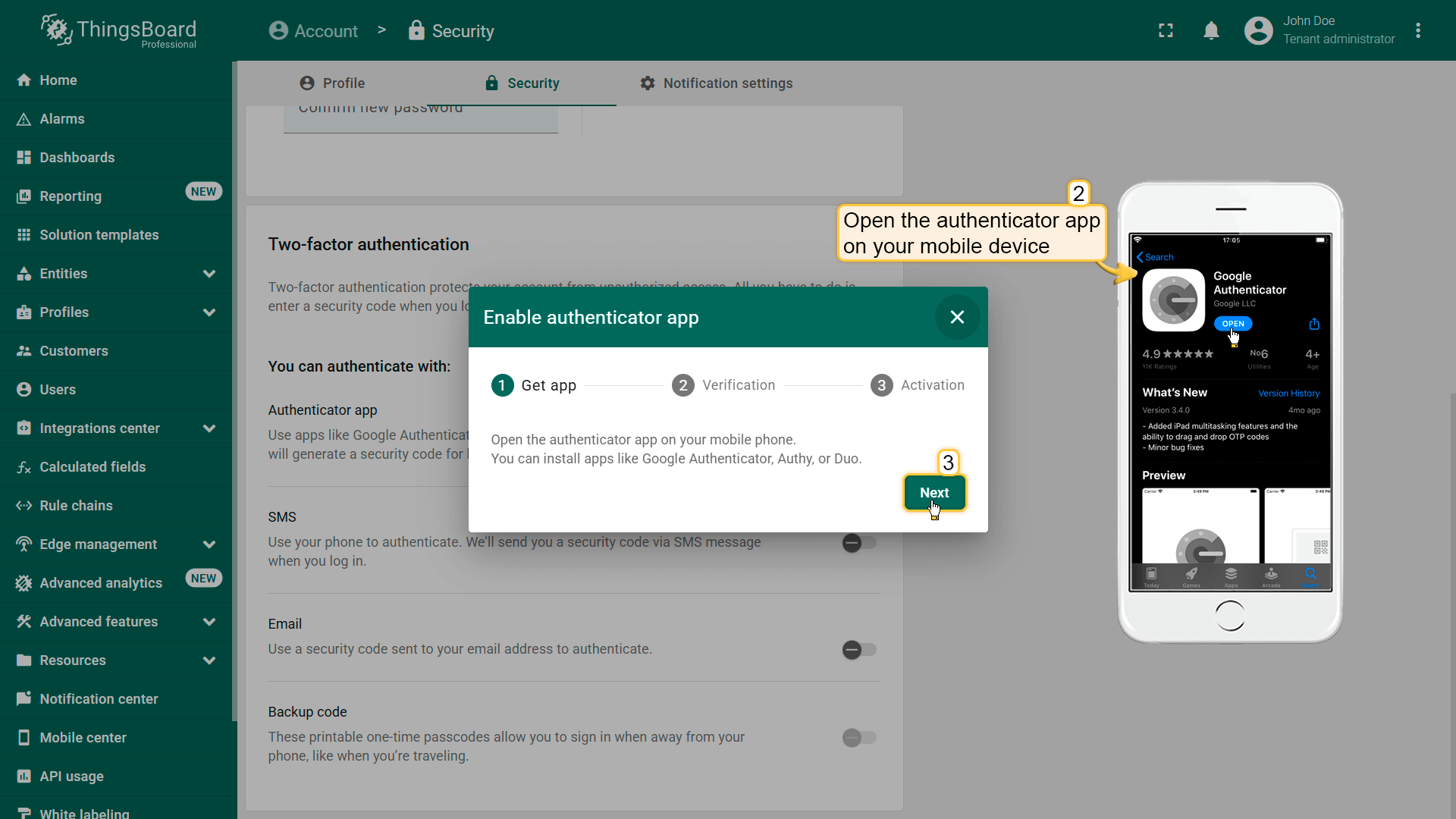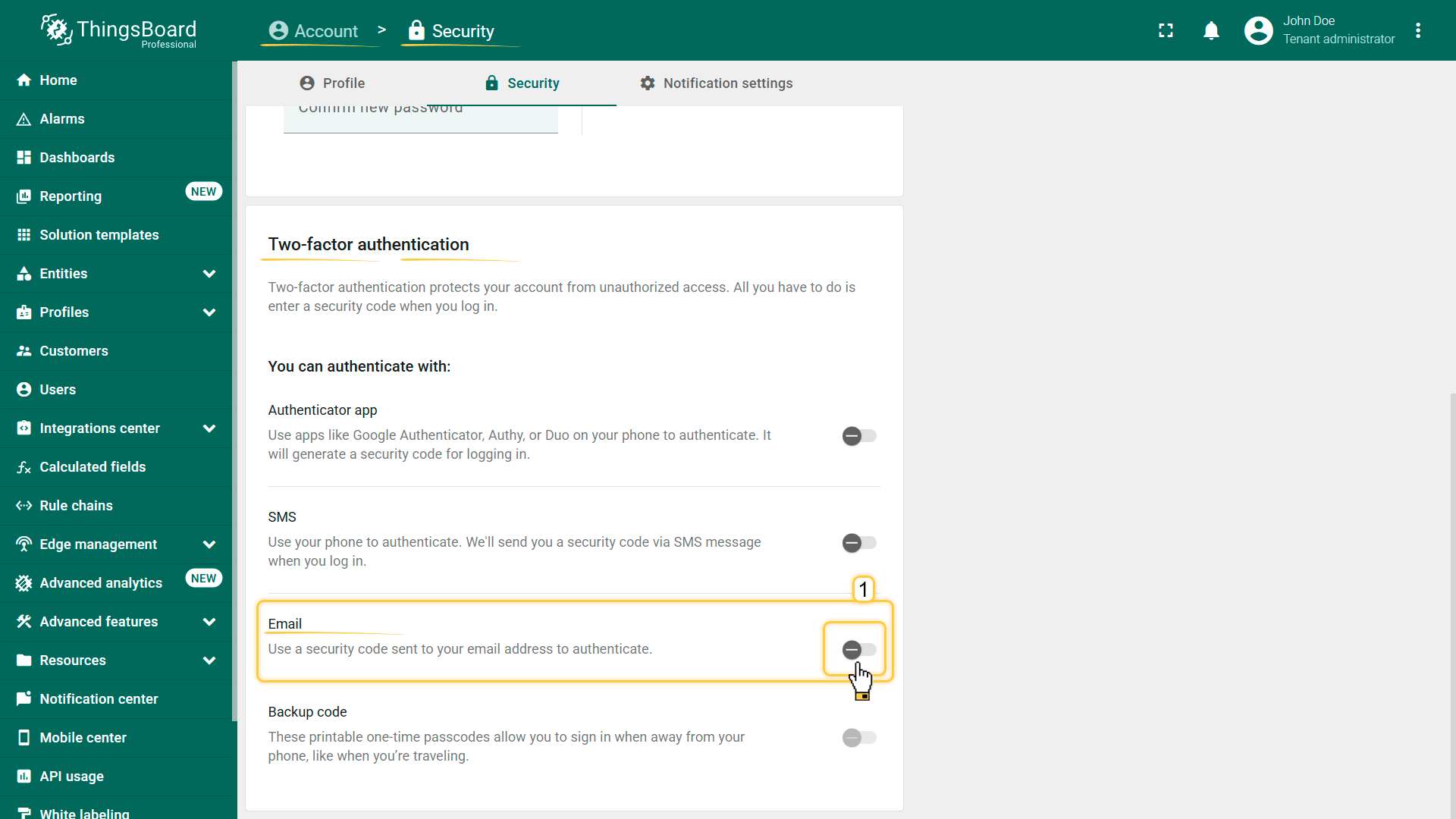 ThingsBoard支持多种2FA验证方式,可由管理员启用和配置,并按tenant选择性启用。
