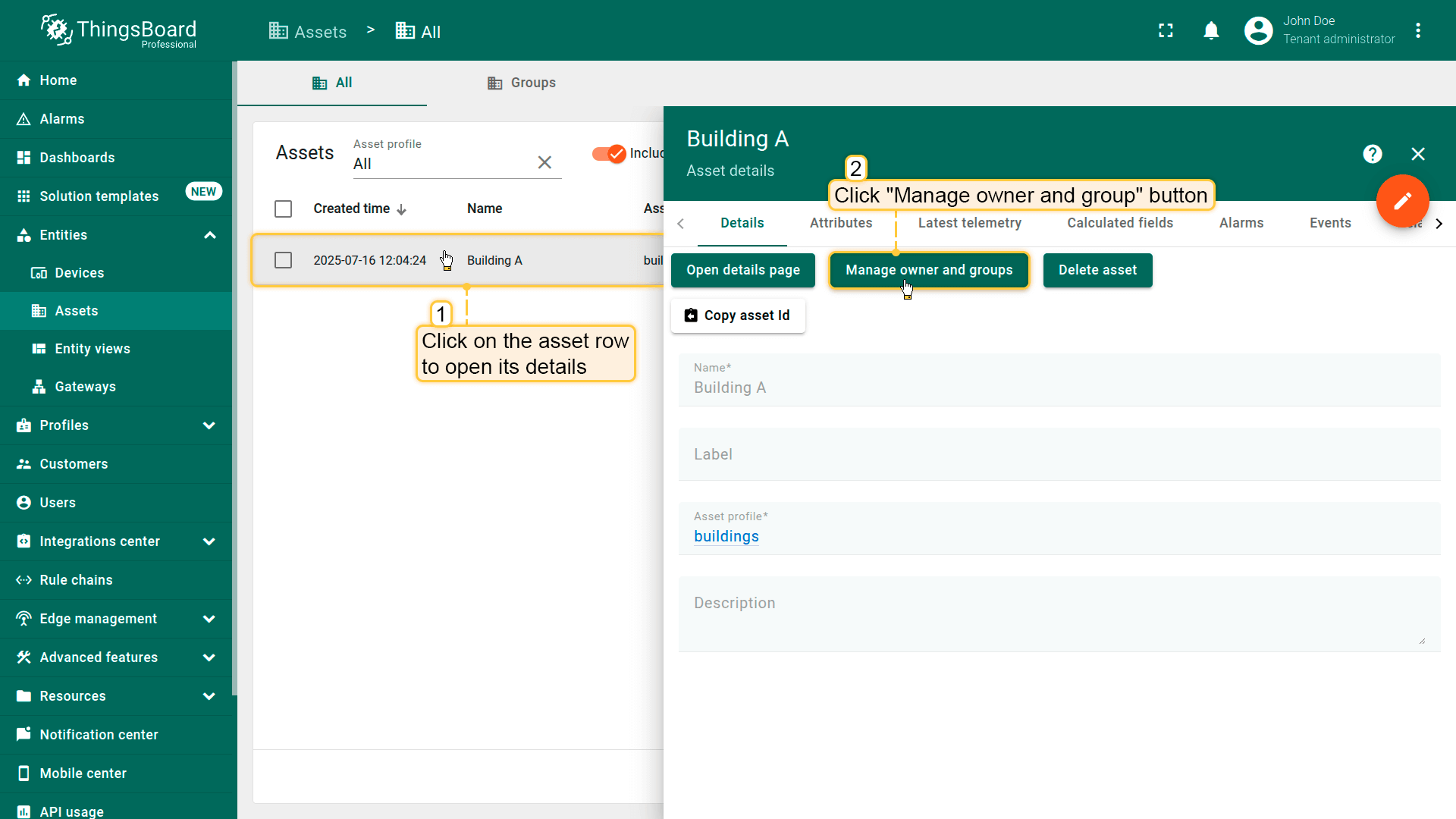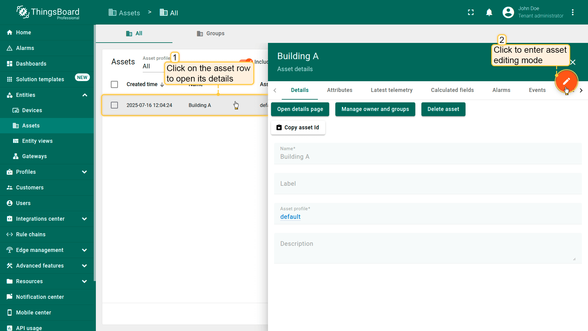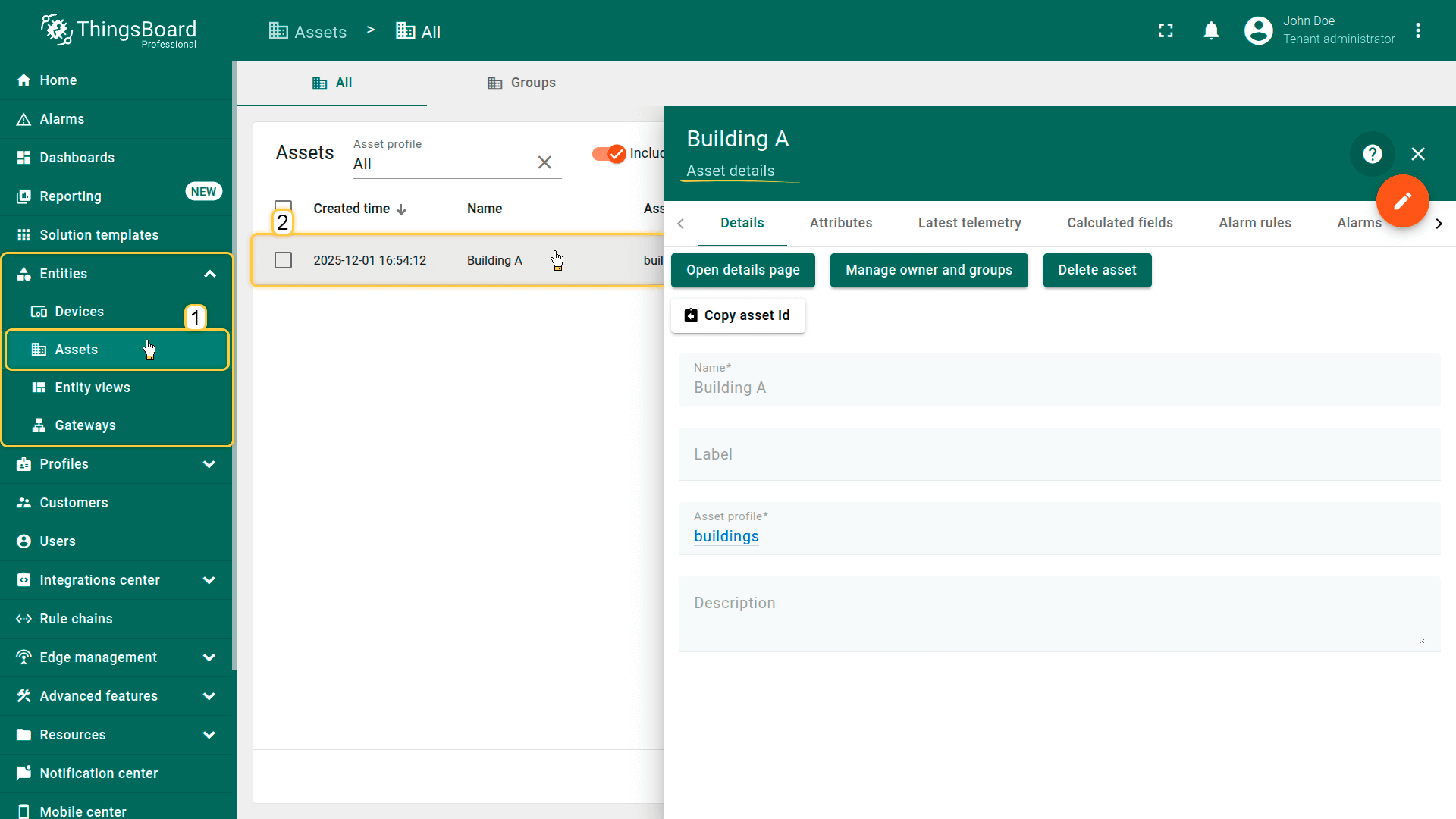 租户管理员及具有相应权限的用户可在ThingsBoard中创建、编辑或删除资产。
