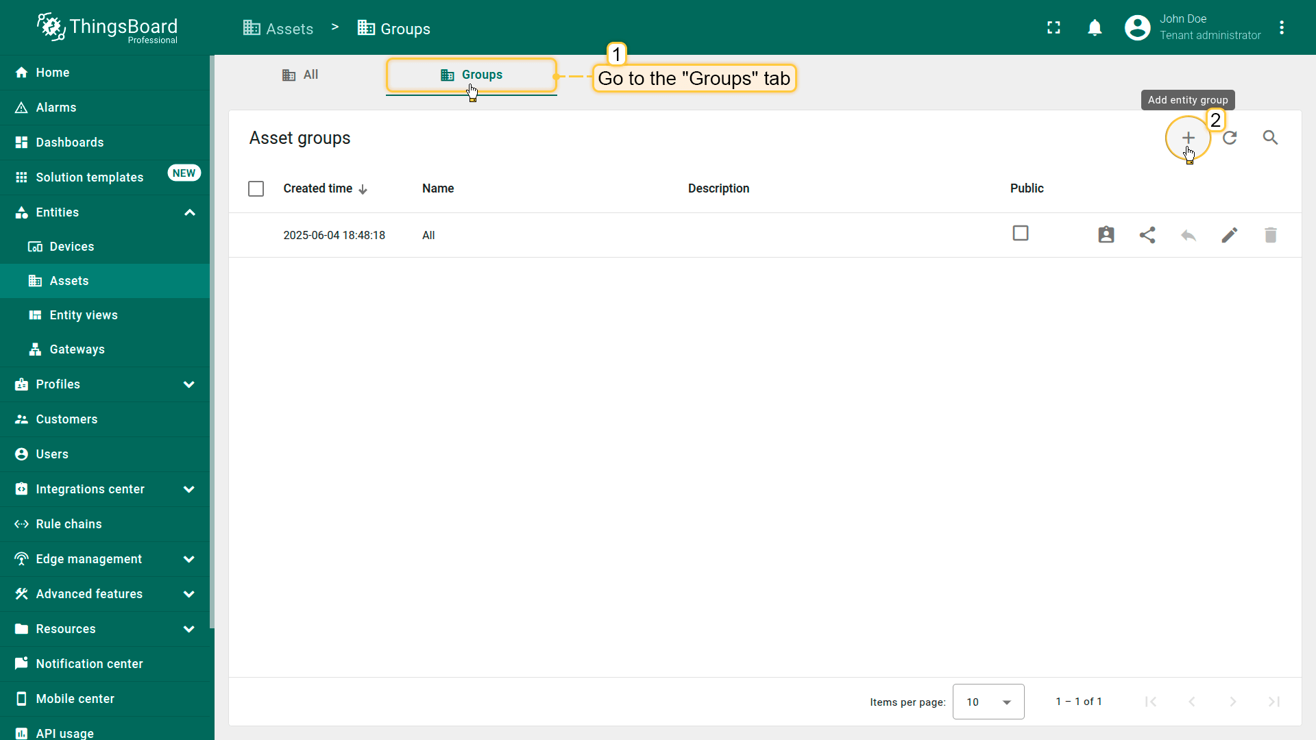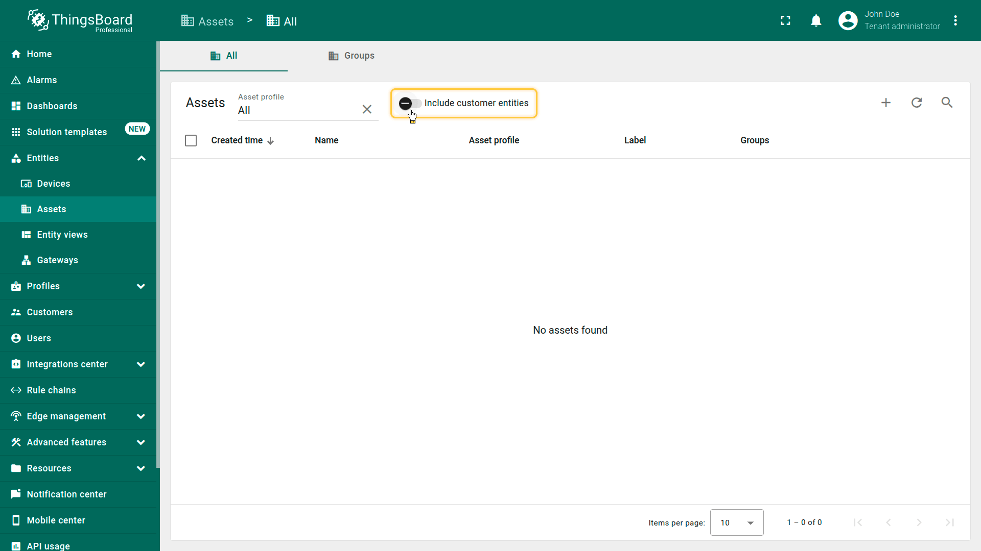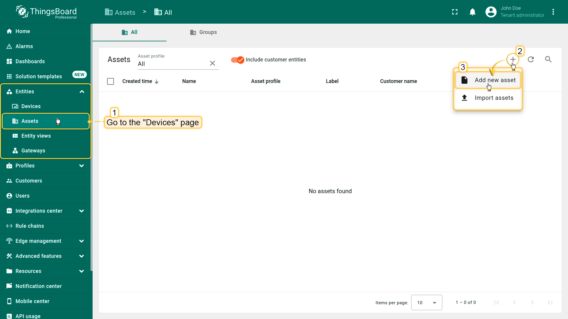 租户管理员及具有相应权限的用户可在ThingsBoard中创建、编辑或删除资产。