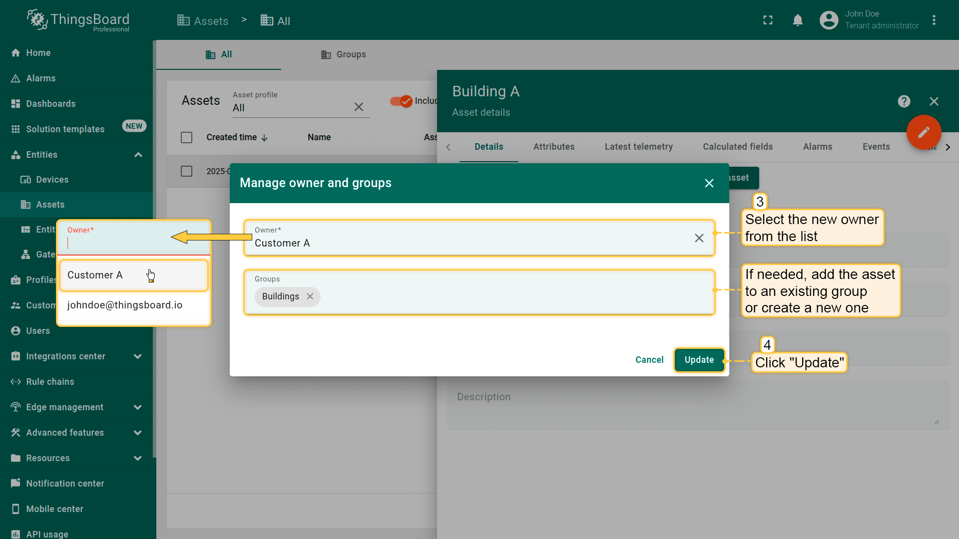 你可以更改资产的所有者,从而确保只有所选客户相关用户可访问资产及其数据。