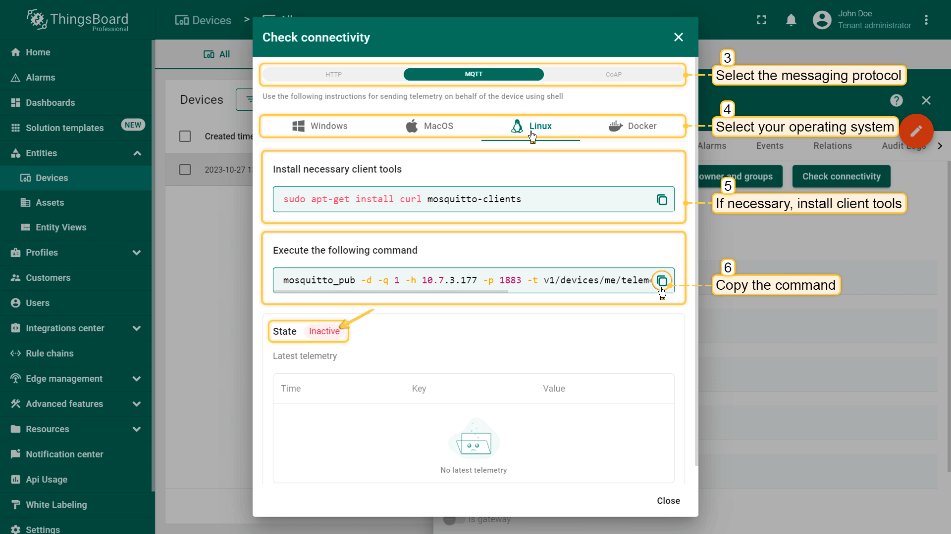 检查连接是内置功能,提供即用命令,用于通过不同通信协议测试设备与ThingsBoard的连通性。可快速验证网络访问、凭证及遥测是否被正确处理。