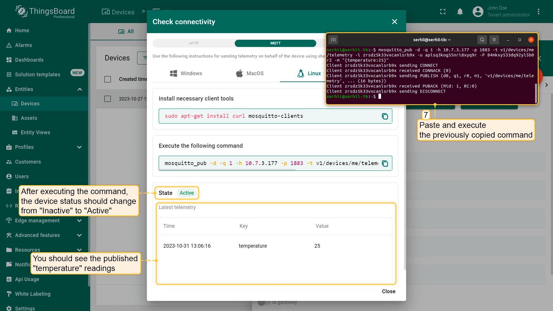 使用此功能可发布测试遥测(例如温度为25),并立即确认设备能与平台通信。