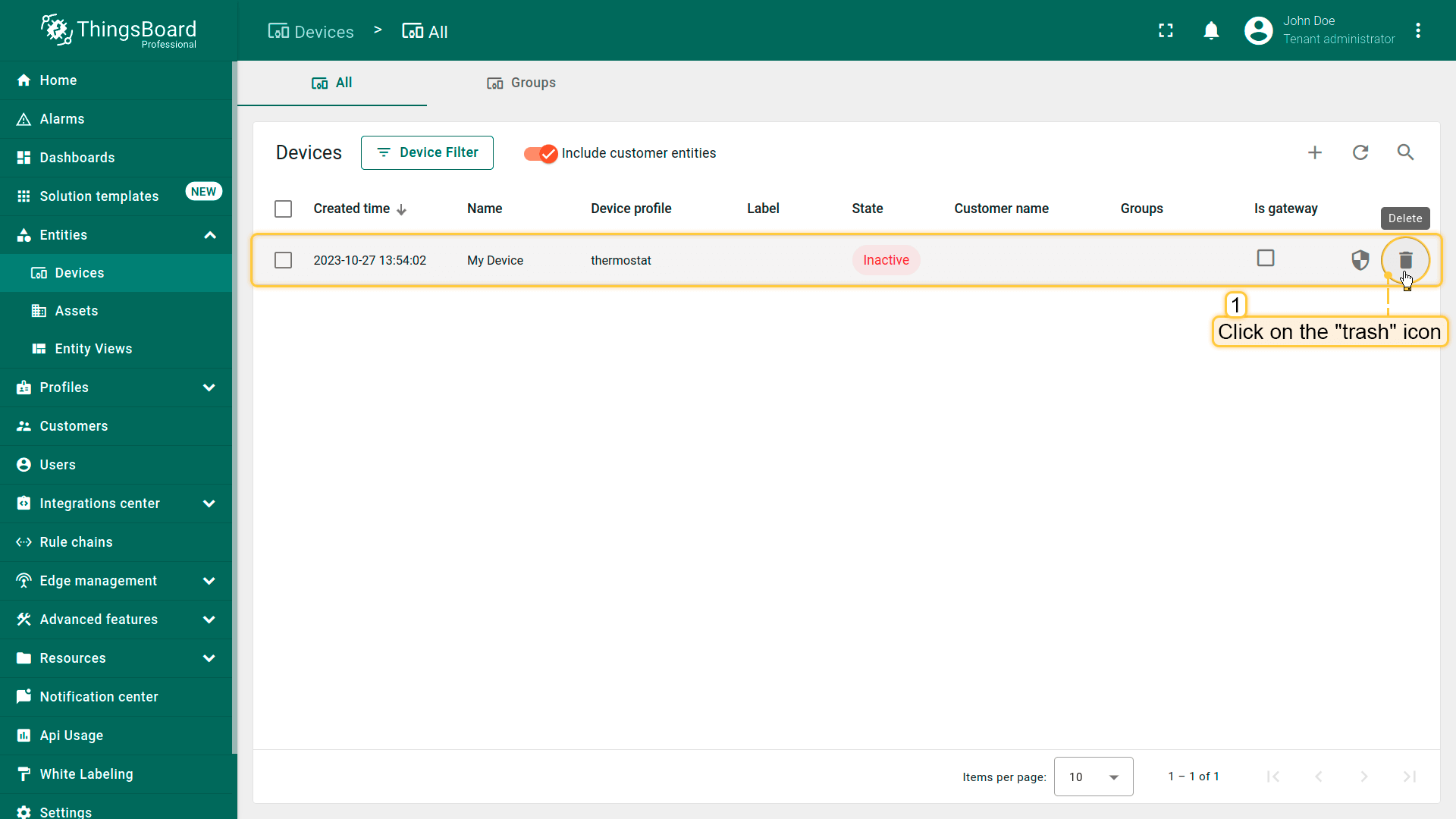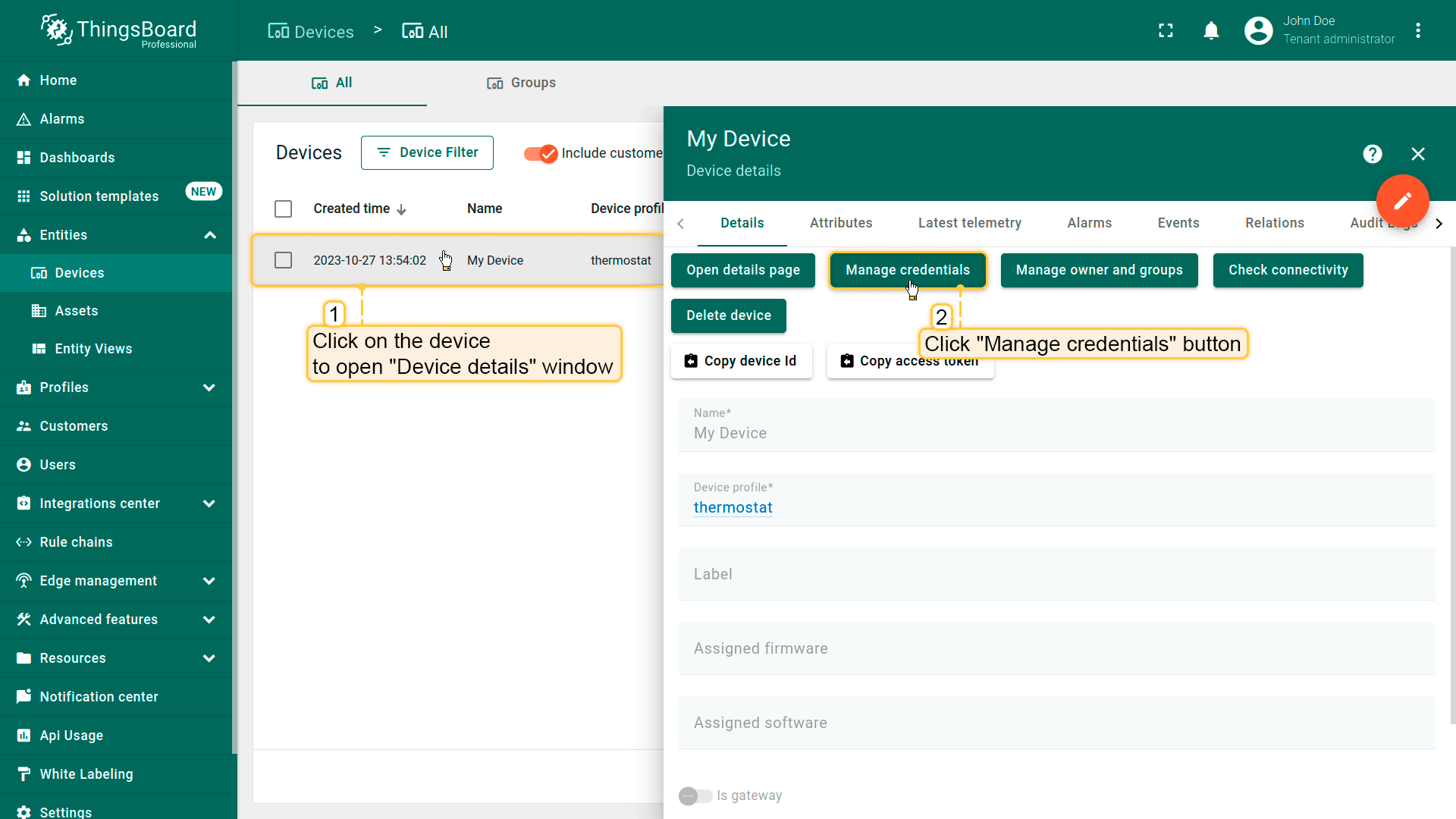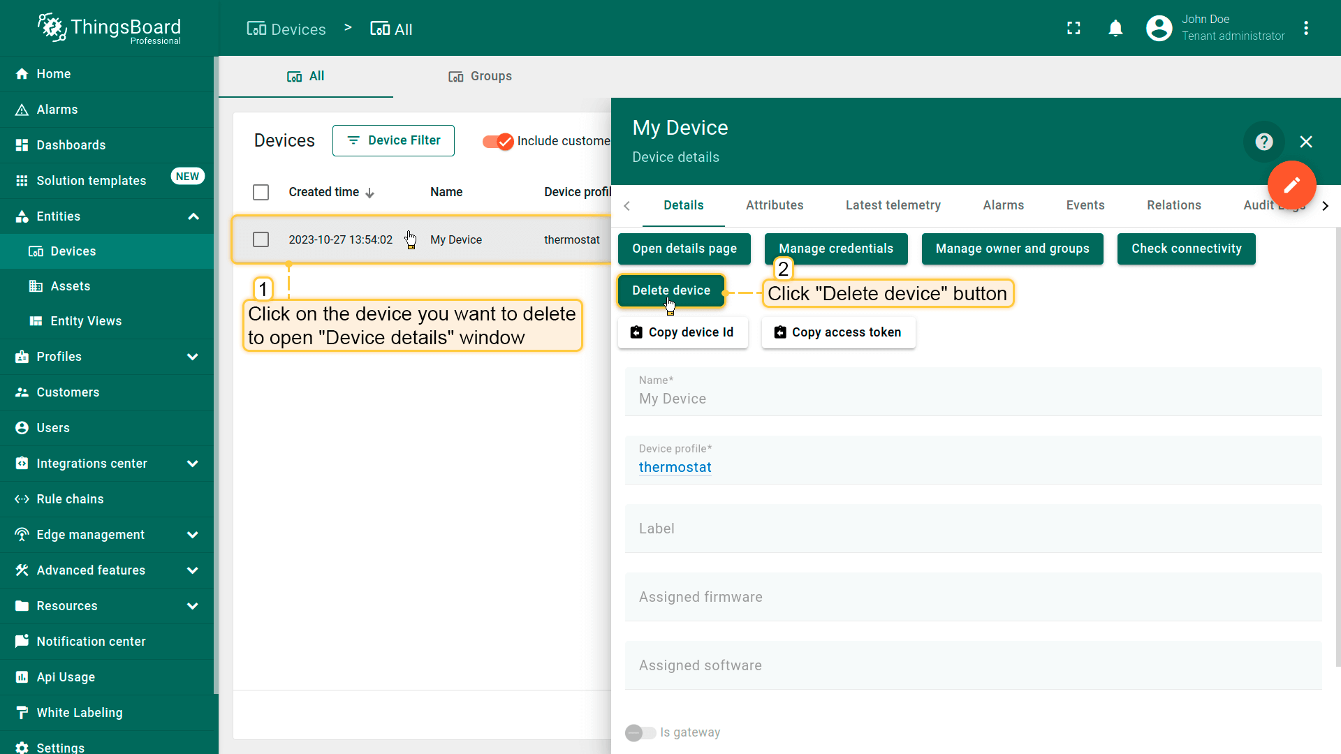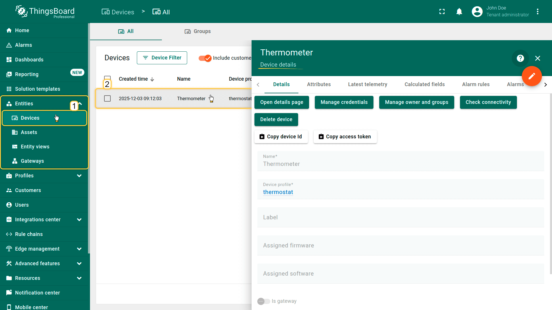 租户管理员及具有相应权限的用户可在ThingsBoard中创建、编辑或删除设备。