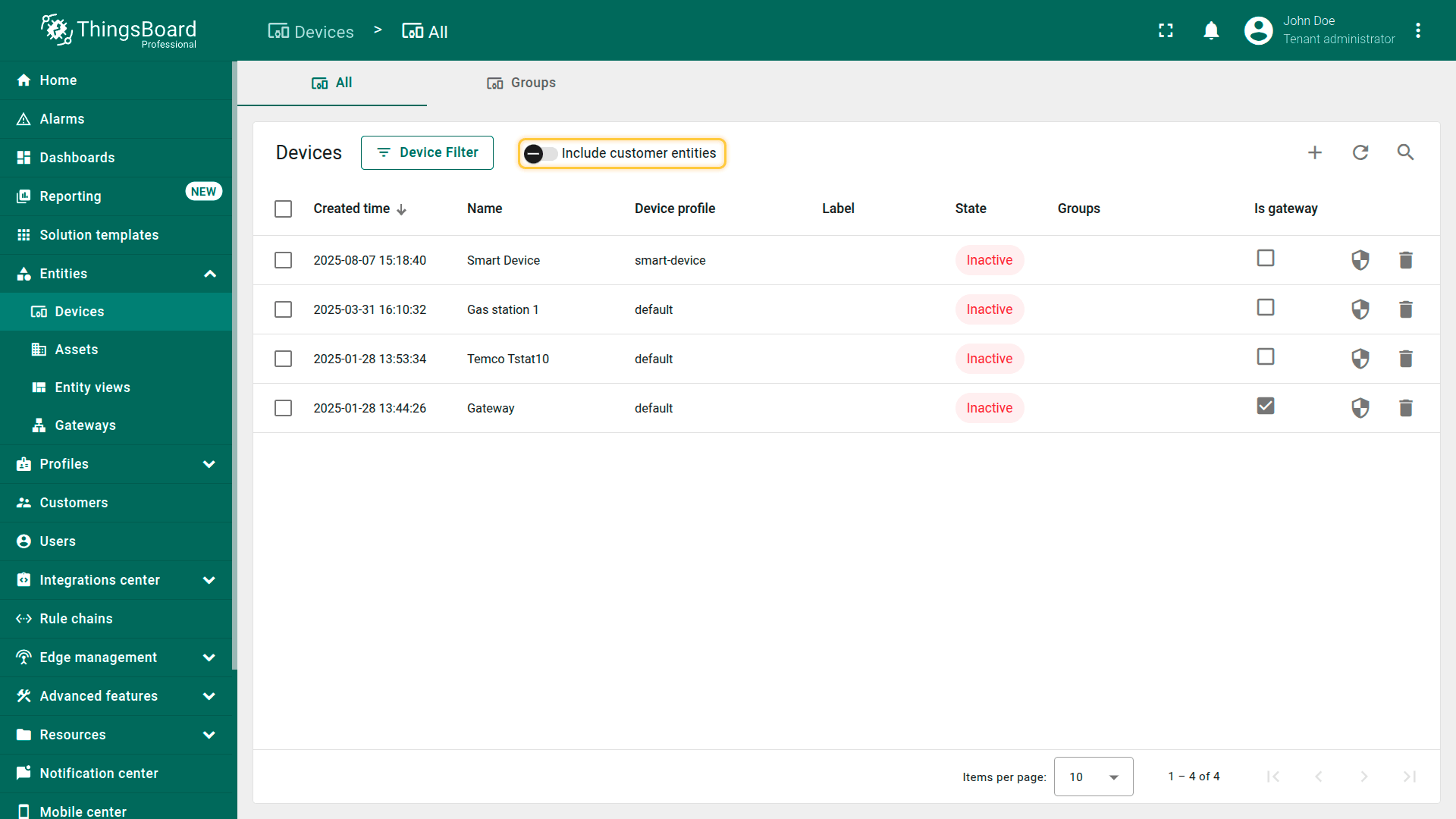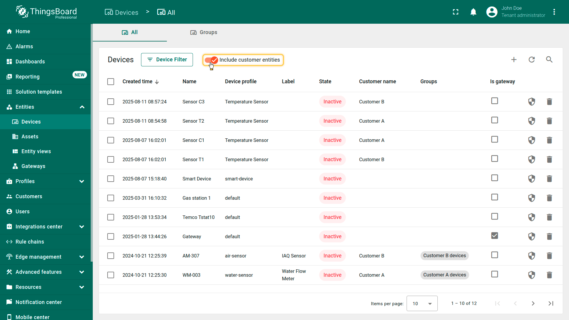 在「Devices」页面有「Include customer entities」选项,用于控制列表是否显示归属于客户的设备。