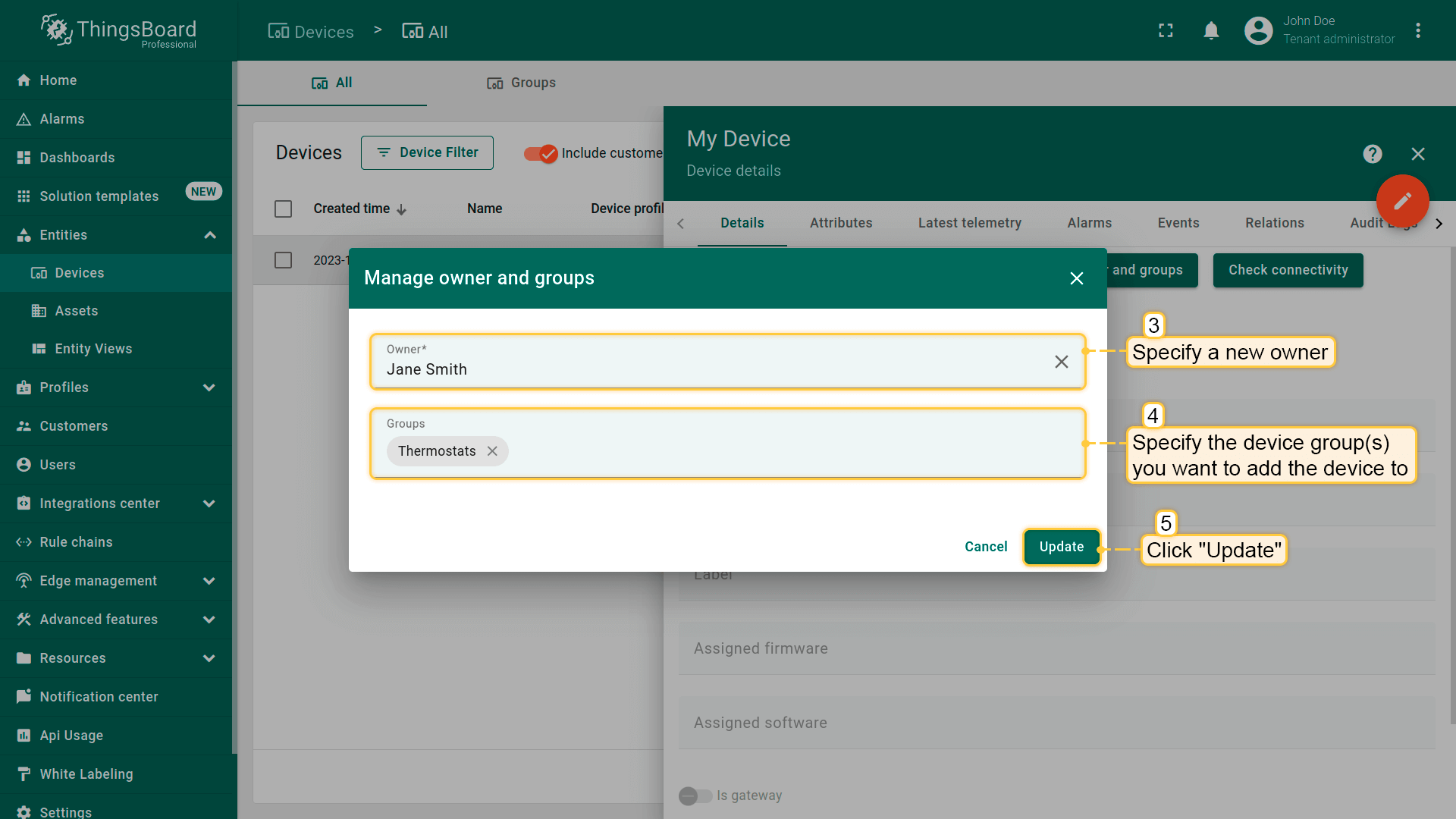 可更改设备的owner(可为Tenant或Customer,参见 glossary)以控制谁能访问该设备及其数据。更改 owner会将设备移至所选层级,并根据groups更新访问权限。
