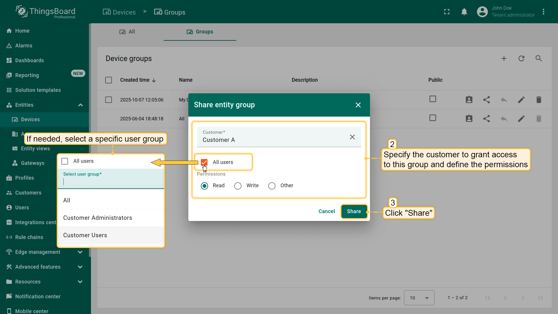 可将设备group共享给一个或多个customer。例如,当多个customer需要访问同一设备时适用。