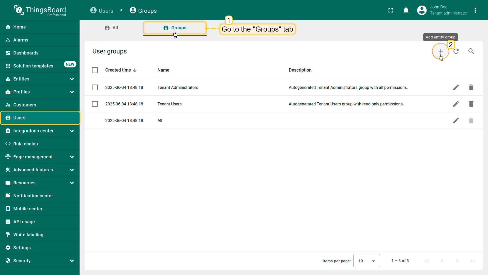 From the Users screen, navigate to the "Groups" tab. Click the "+" (Add entity group) icon in the upper-right corner.