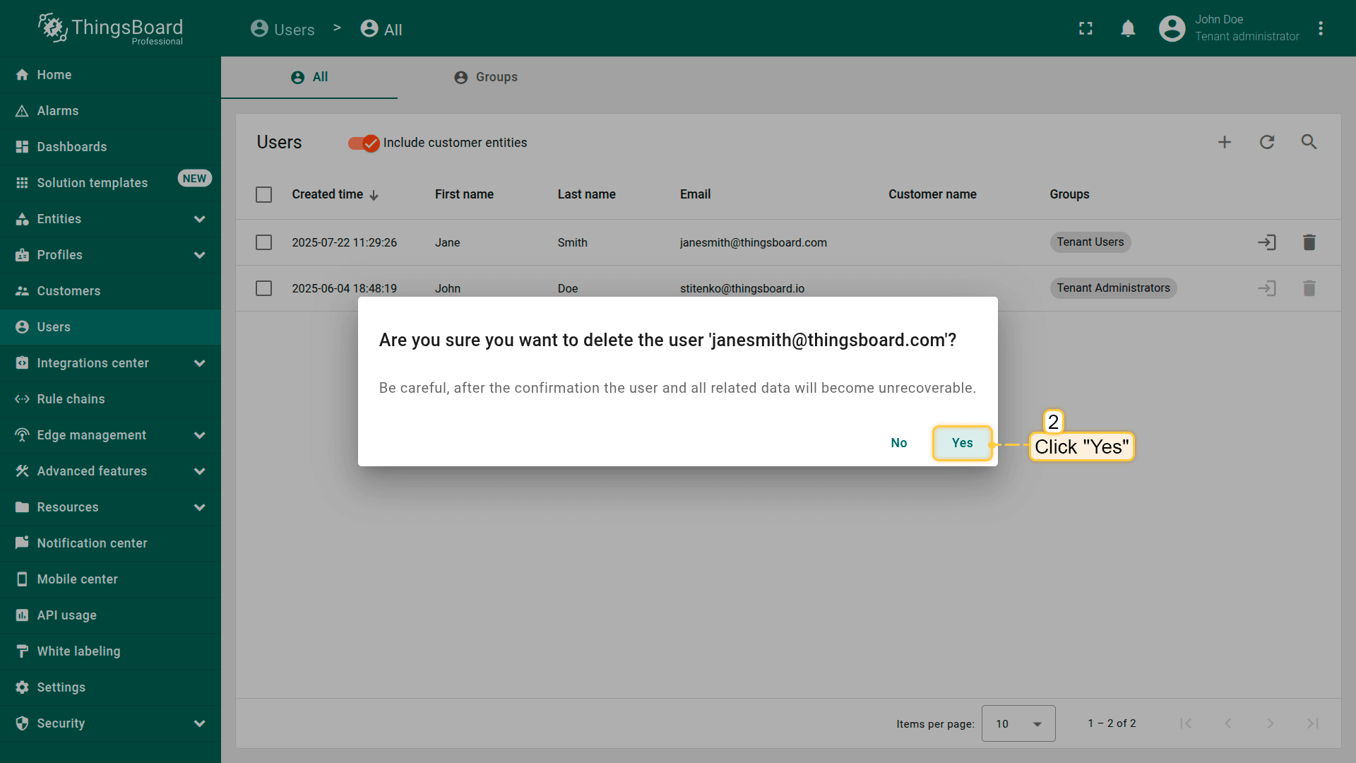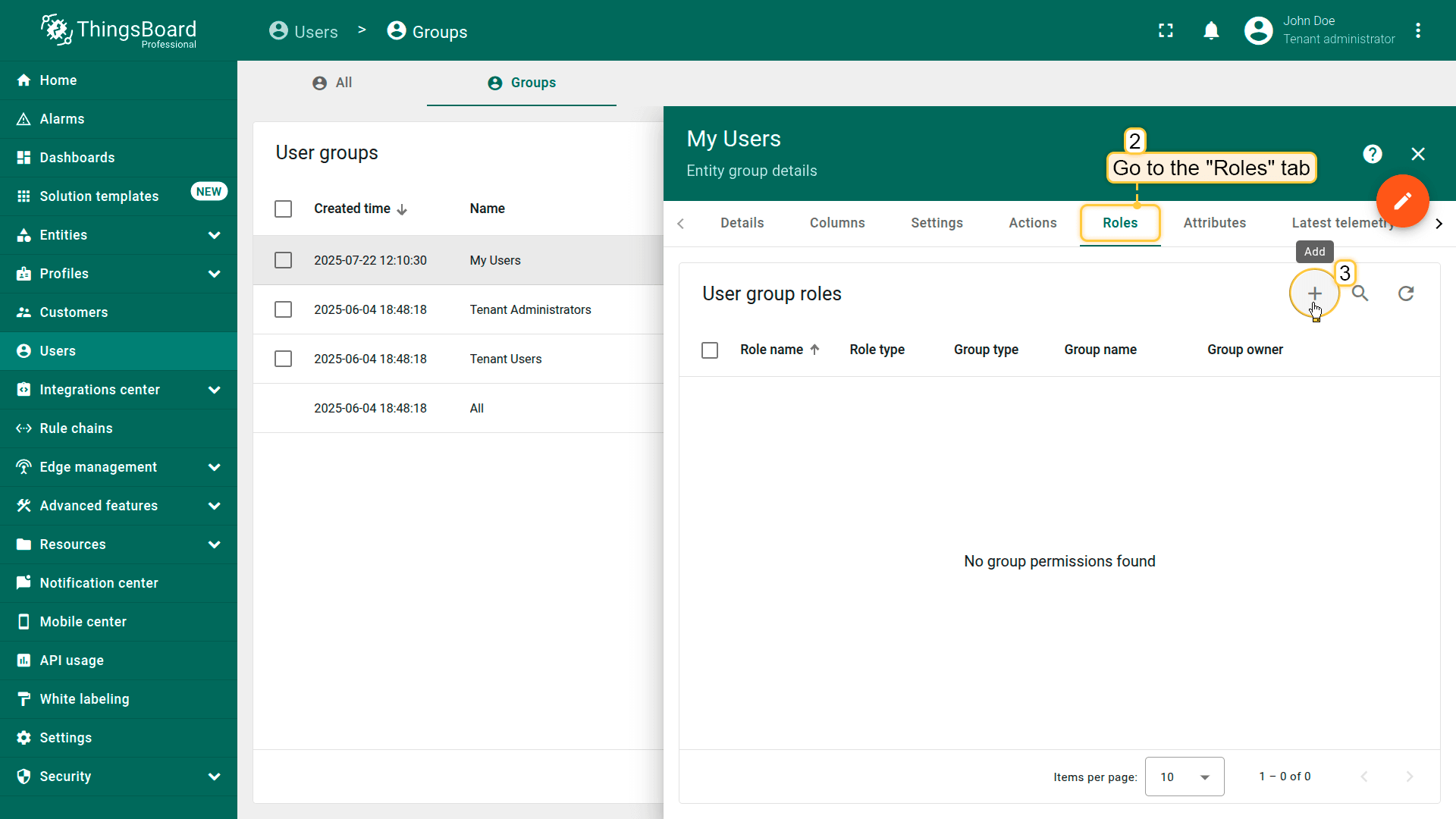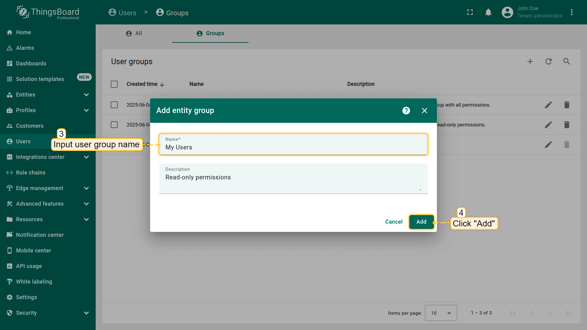 Log in as a Tenant Administrator or Customer Administrator. Navigate to the "Users" section from the left-hand menu. Click the "Add user" button in the top-right corner.