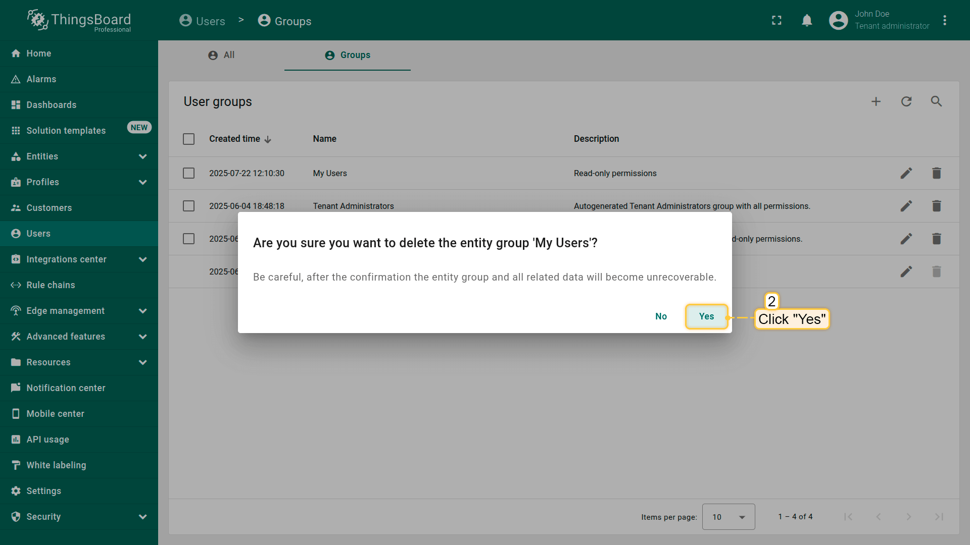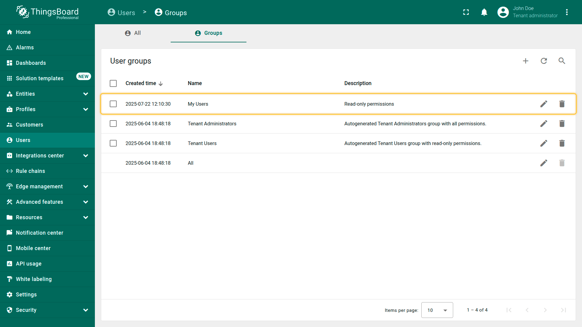 Once created, you can add users to this group and configure group-level permissions to control access to specific entities, dashboards, or features.