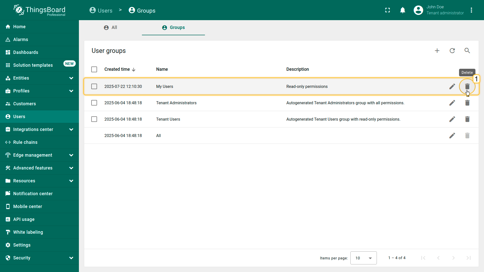 From the Users screen, navigate to the "Groups" tab, and click the "trash bin" icon (🗑)️ at the end of the row for the group you want to delete.