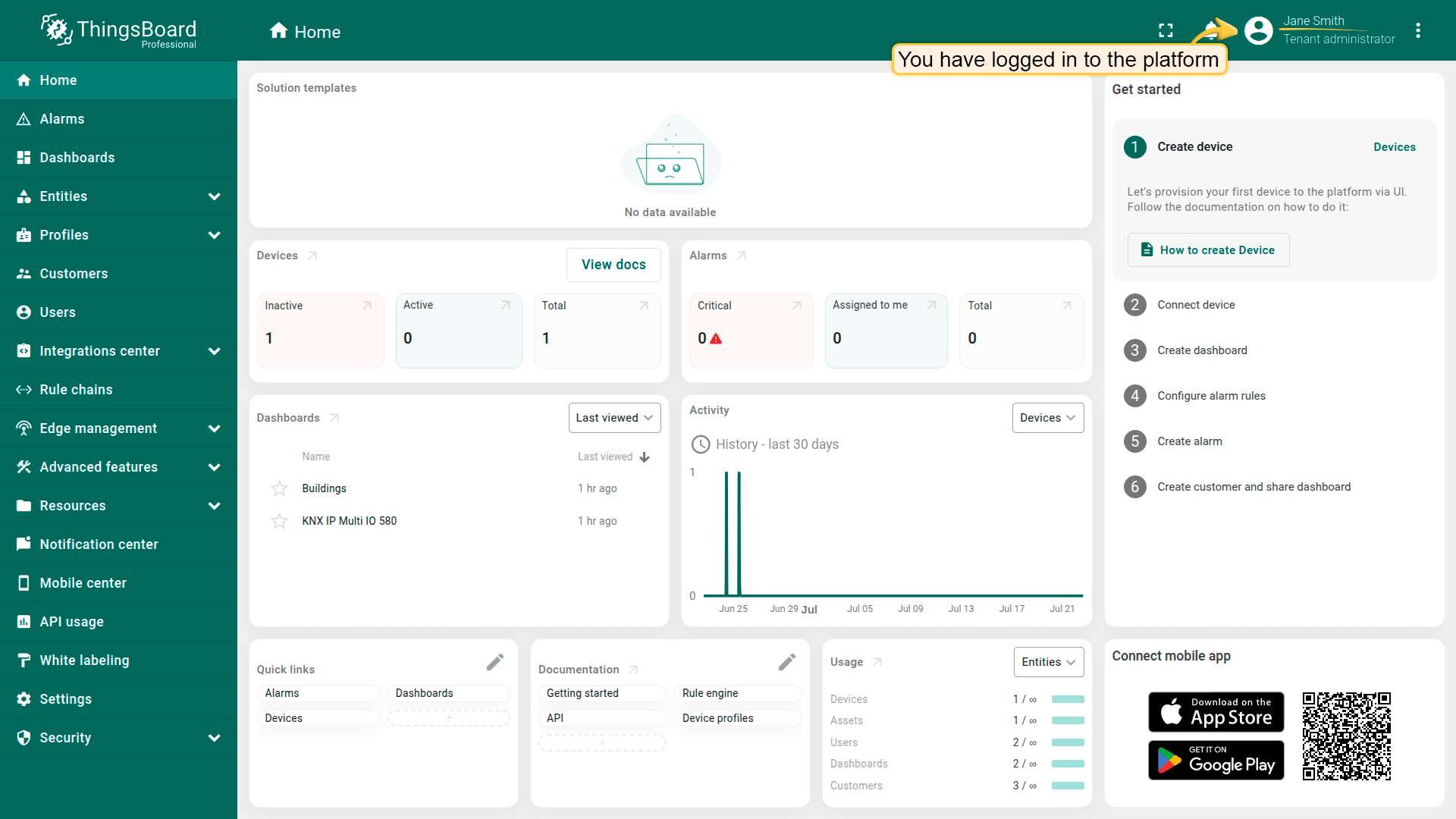 In this example, the user has read-only permissions. They can view resources such as dashboards or devices, but cannot add, edit, or delete any objects.