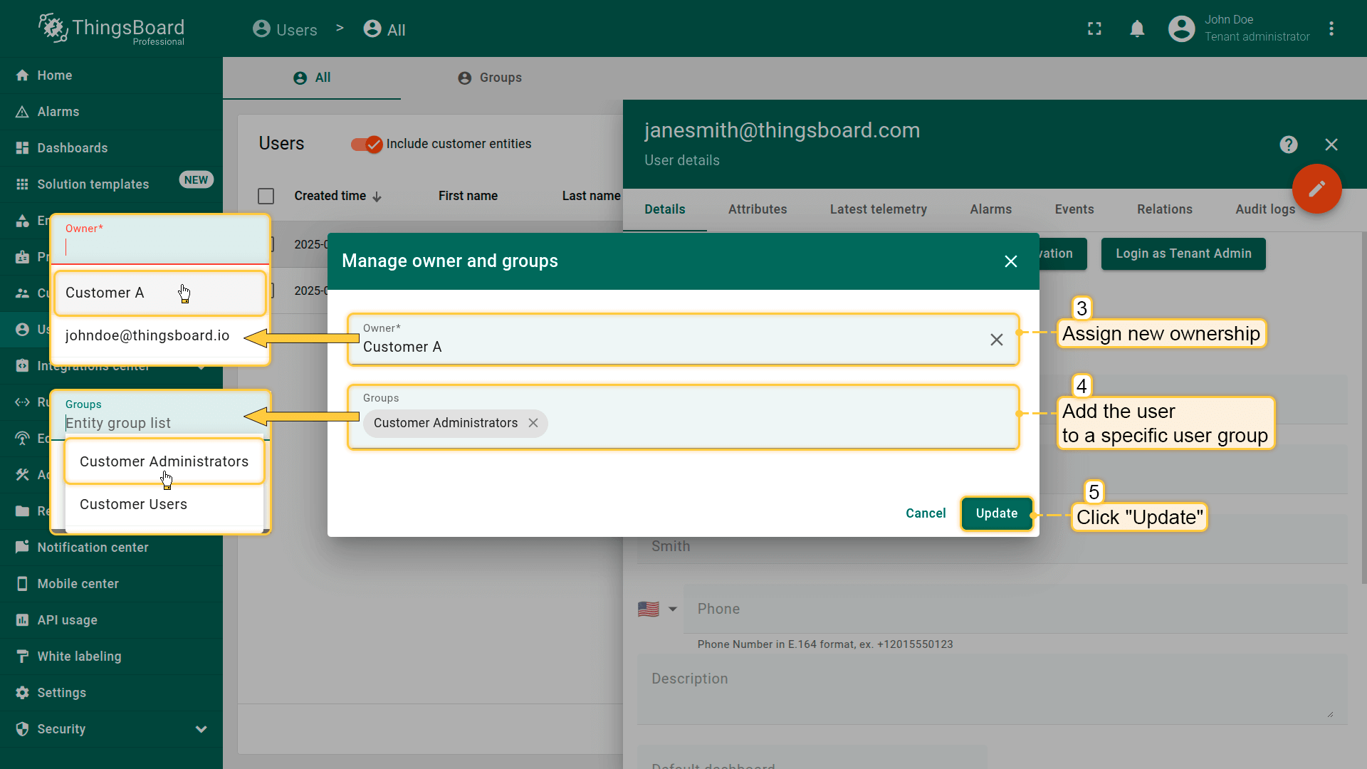 Perform the required actions: Select a new owner or the user from the dropdown list; Add the user to one or more existing user groups, or create a new group if needed. Click "Update" to confirm and apply the changes.