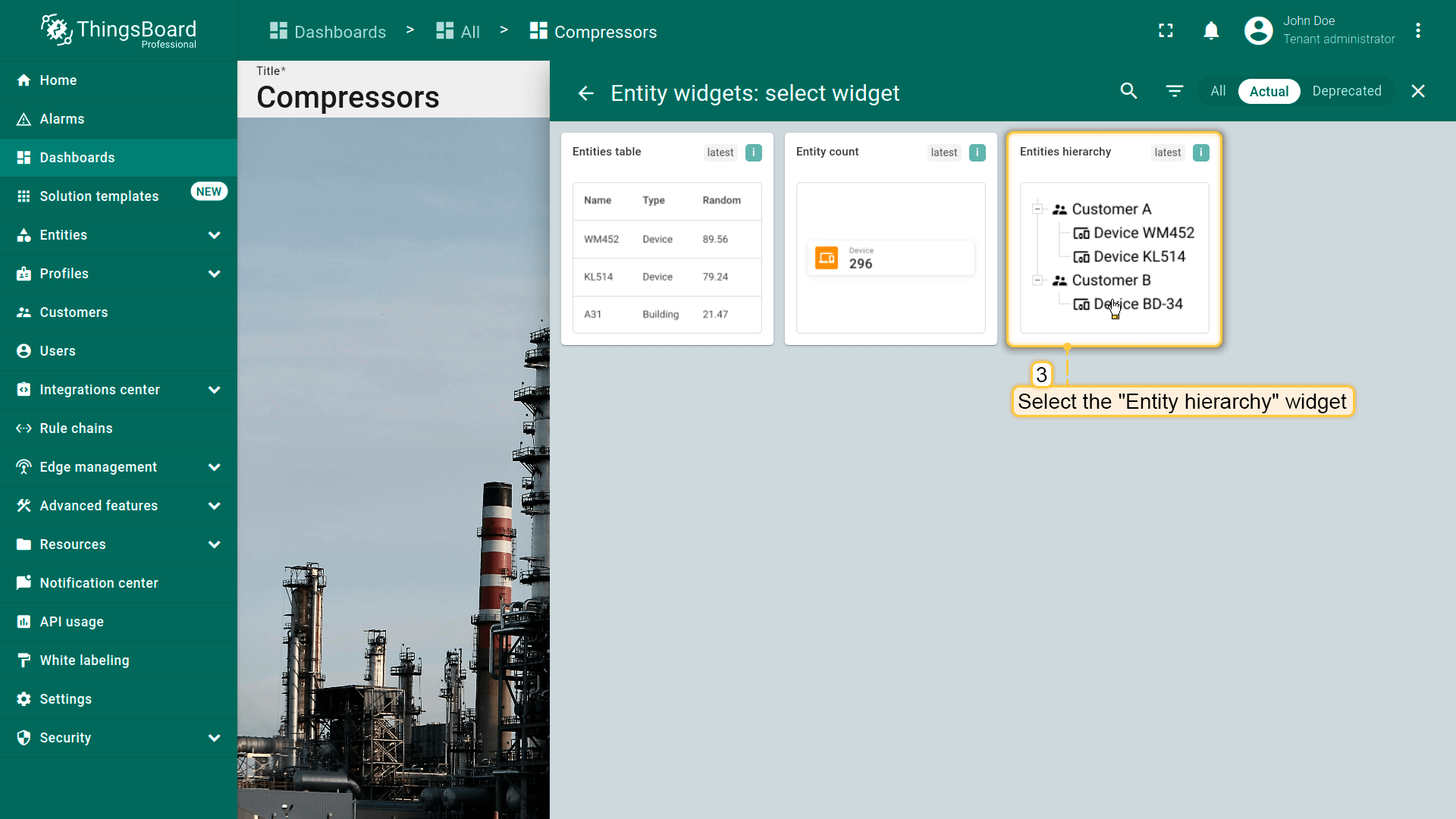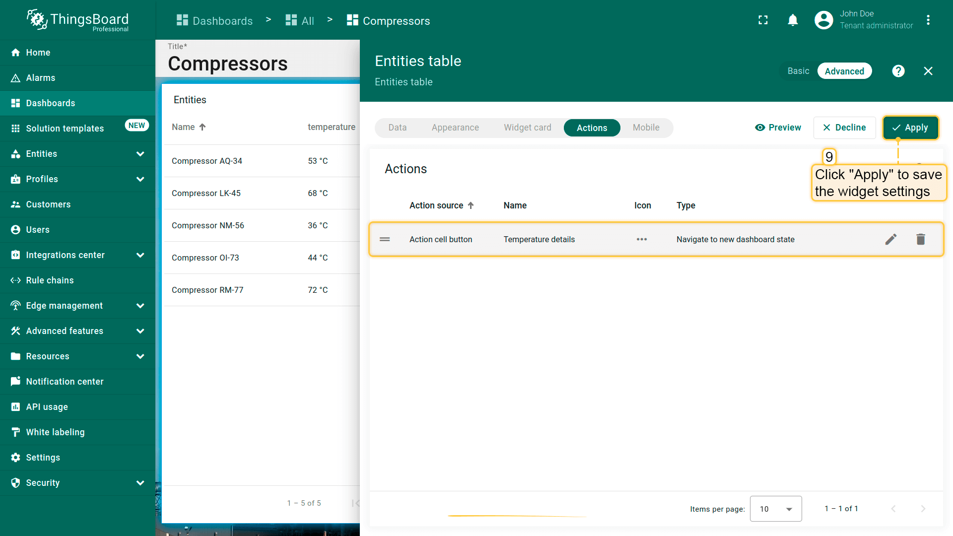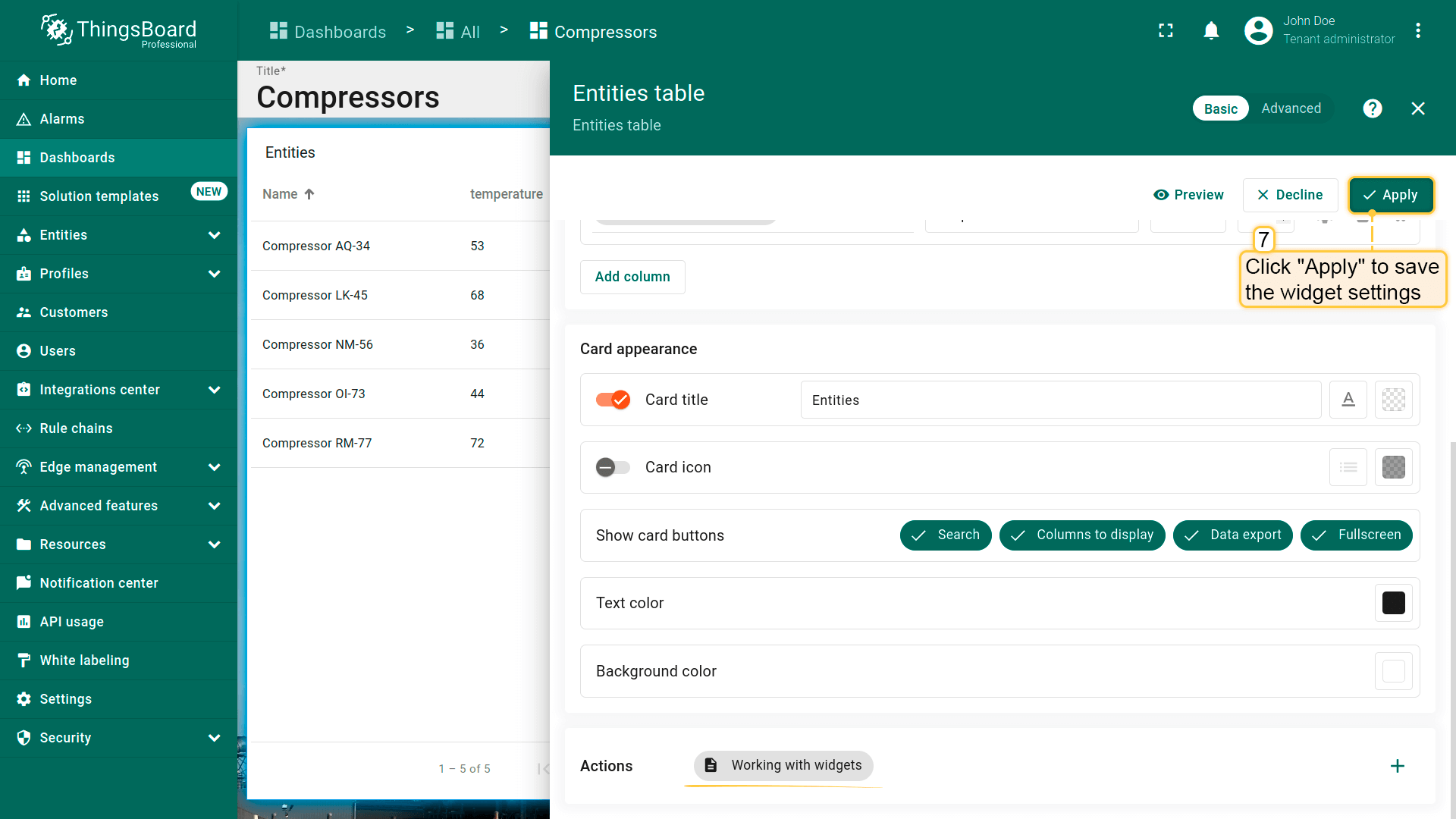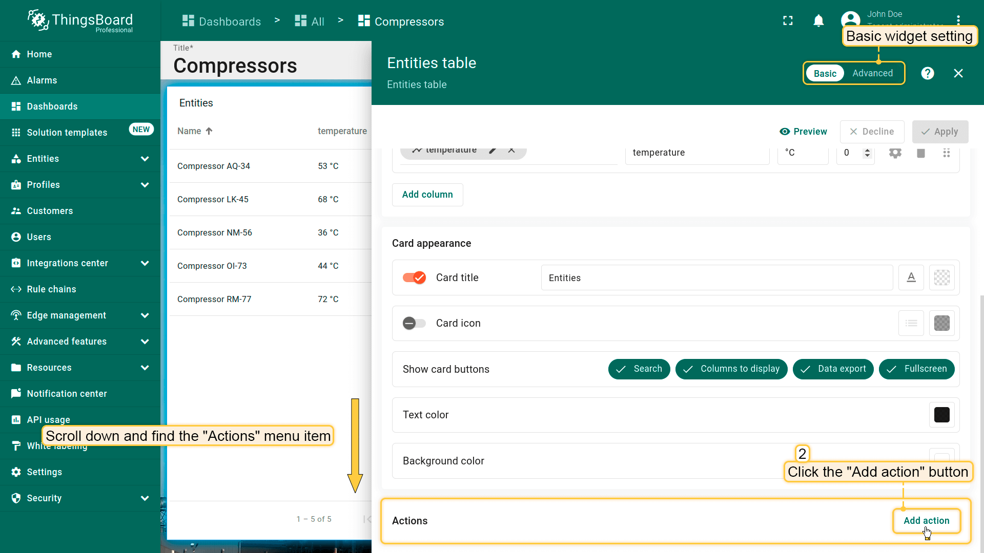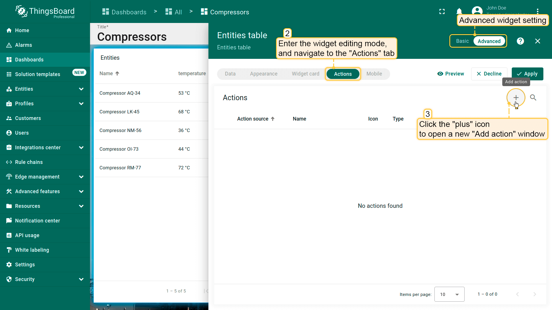 本指南以Entities table部件为例在编辑模式下配置actions。请在此了解如何将Entity table部件添加到dashboard。