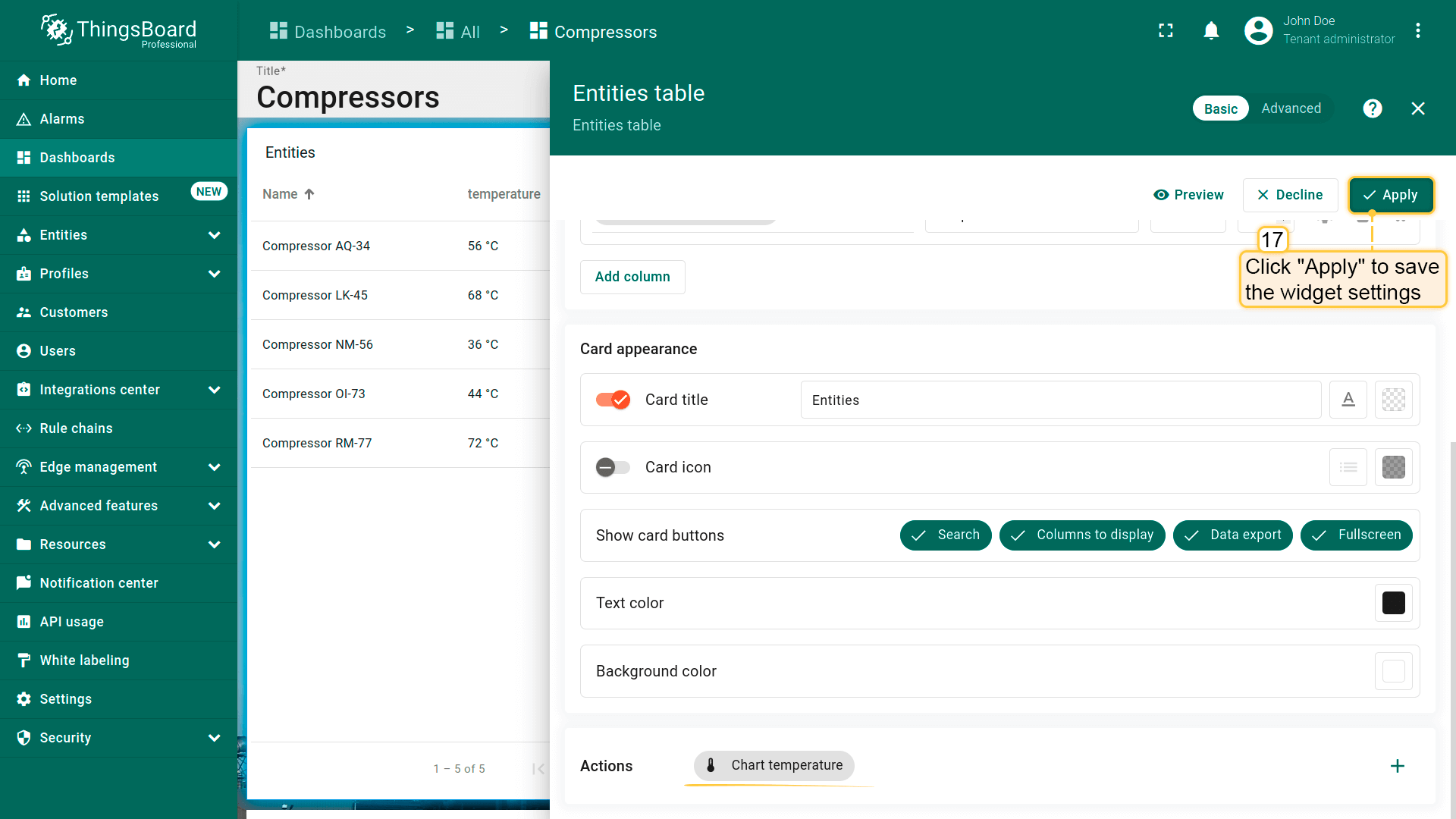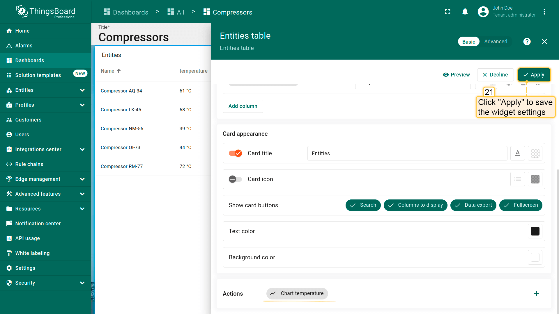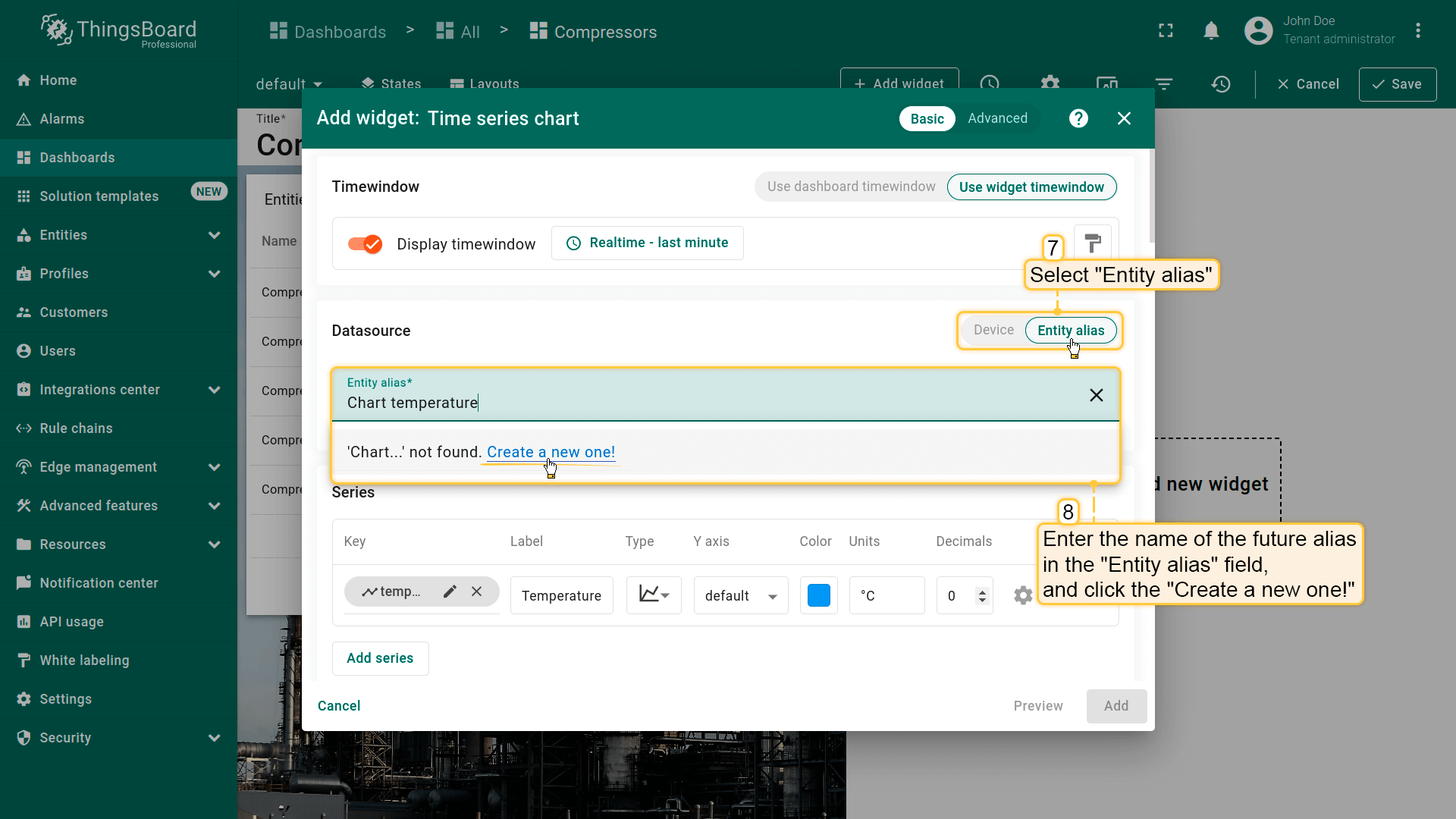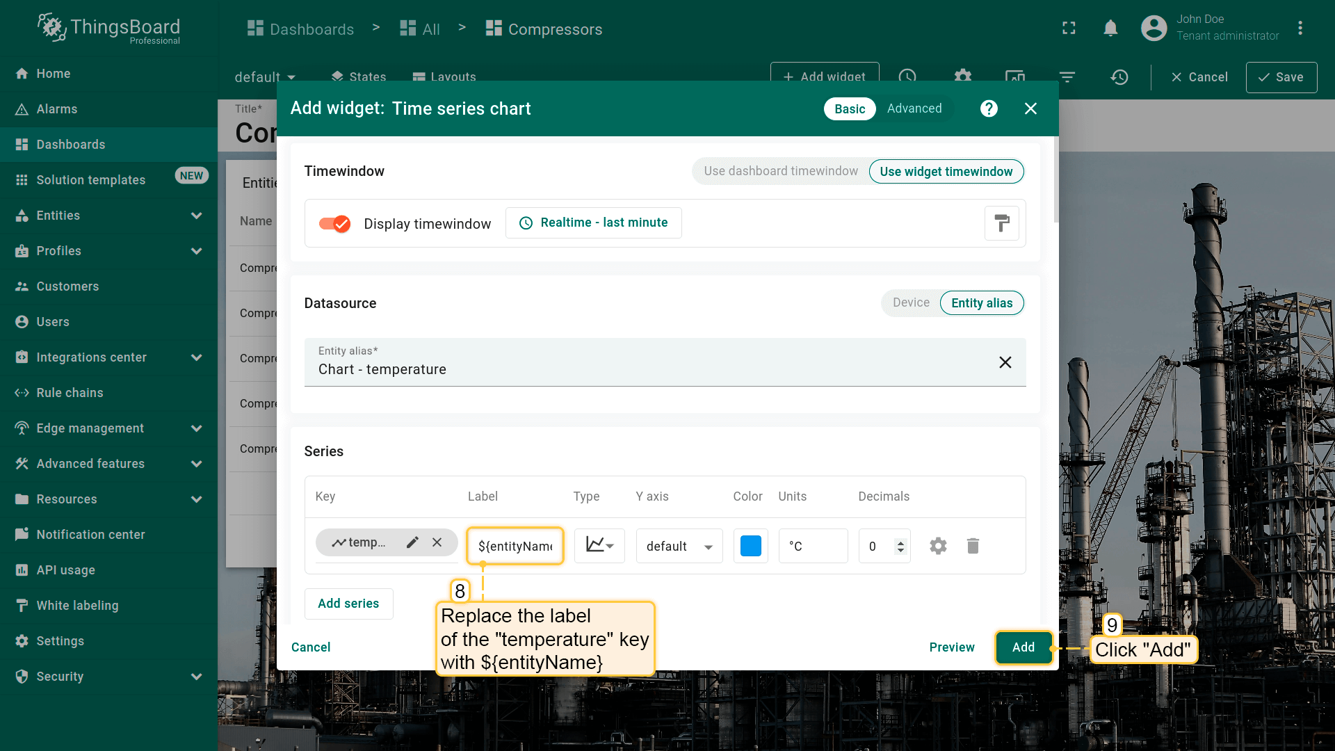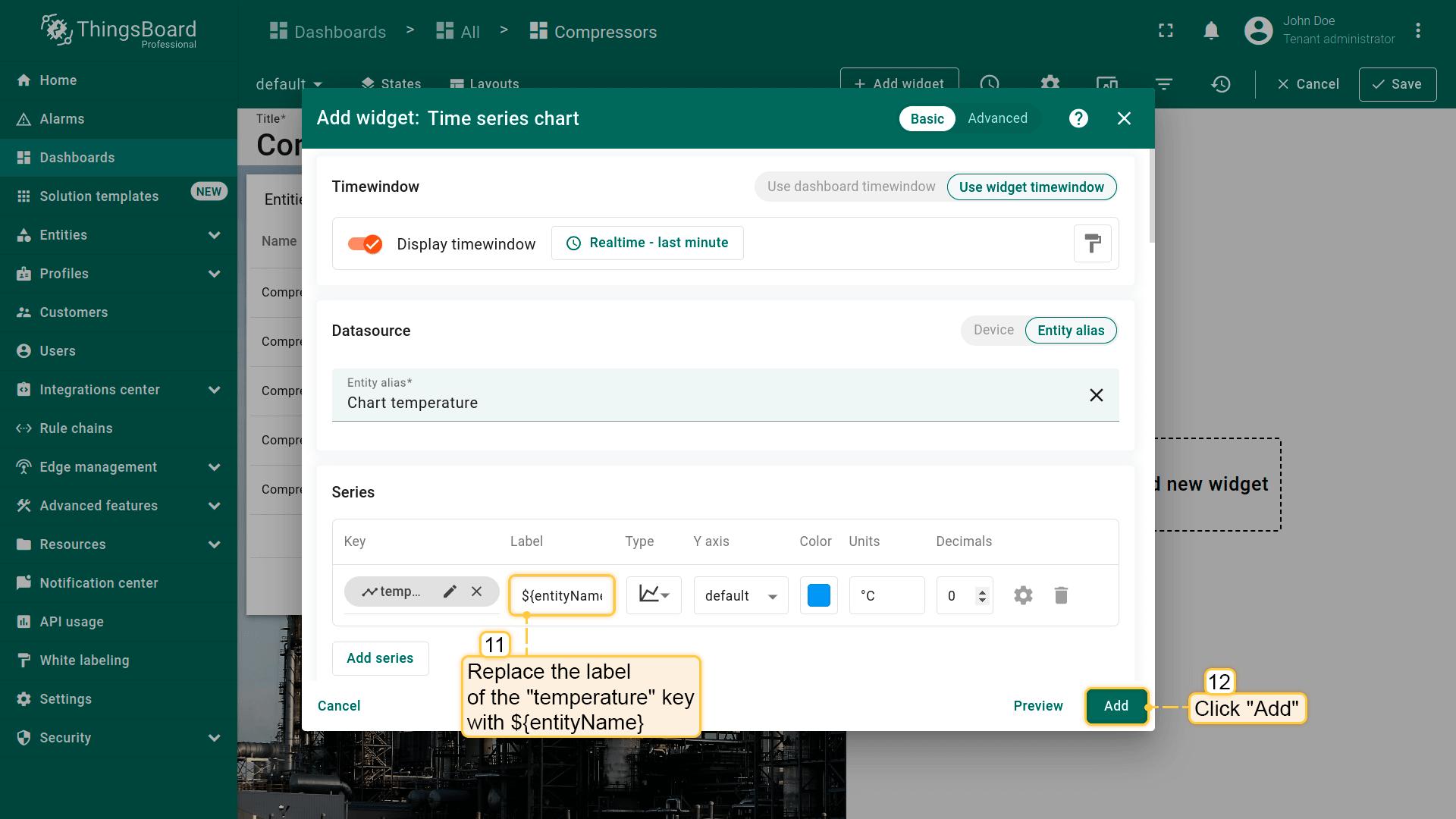 - Replace the label of the "temperature" key with ${entityName}. Then, click "Add" to add new widget on the dashboard;