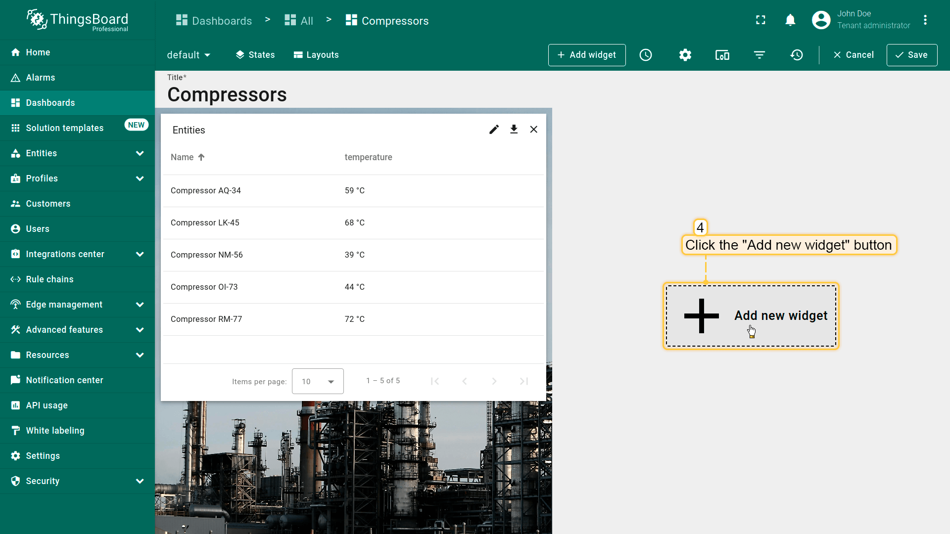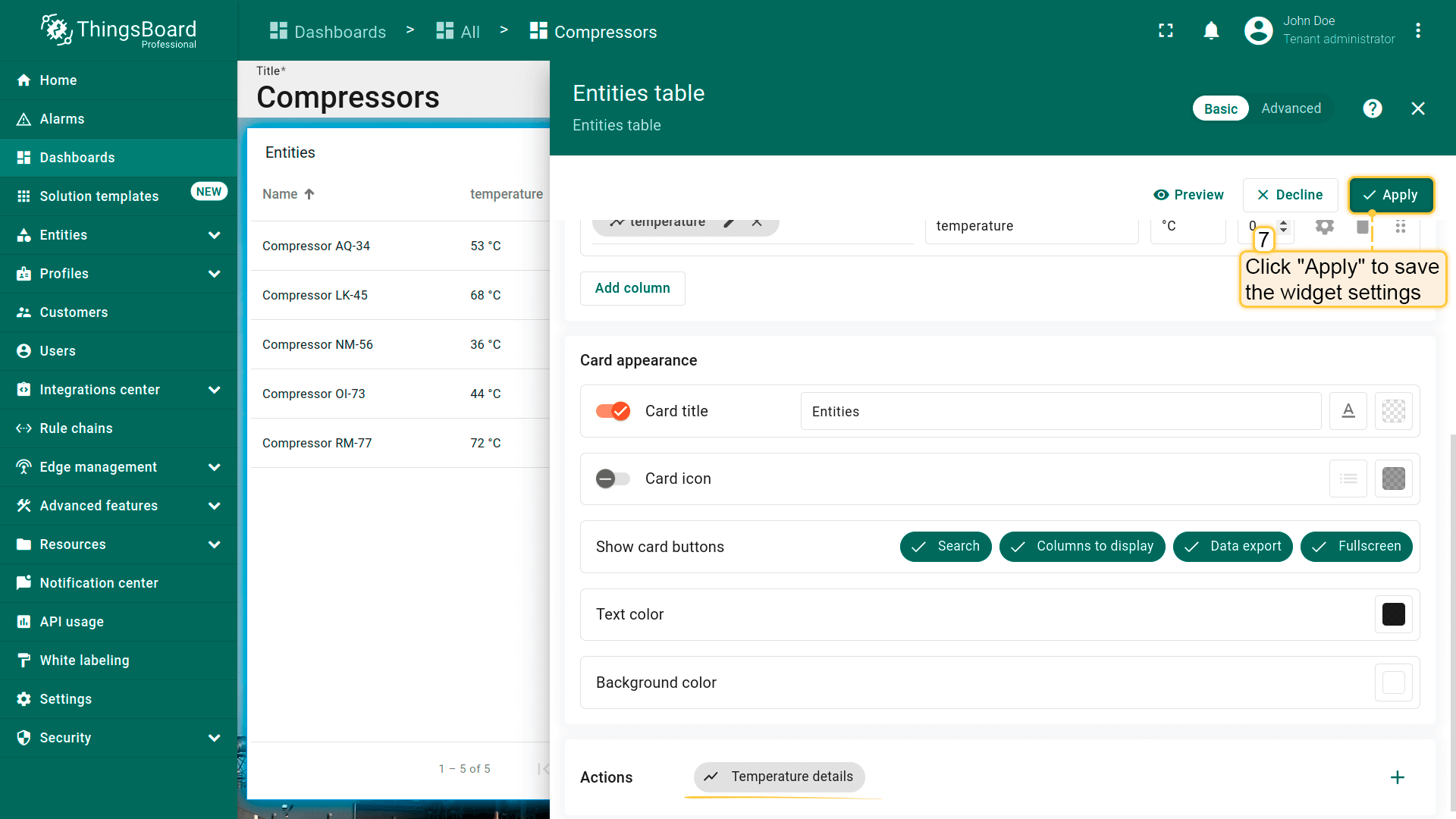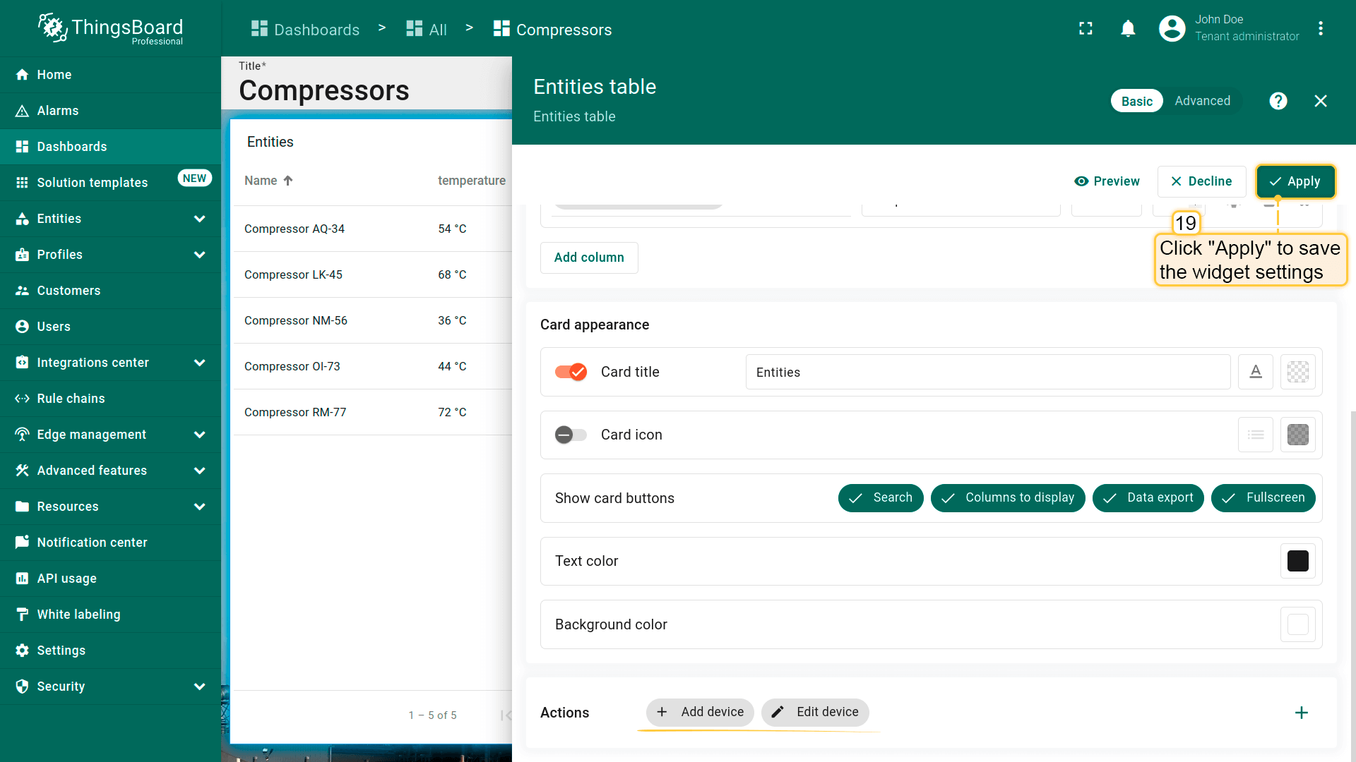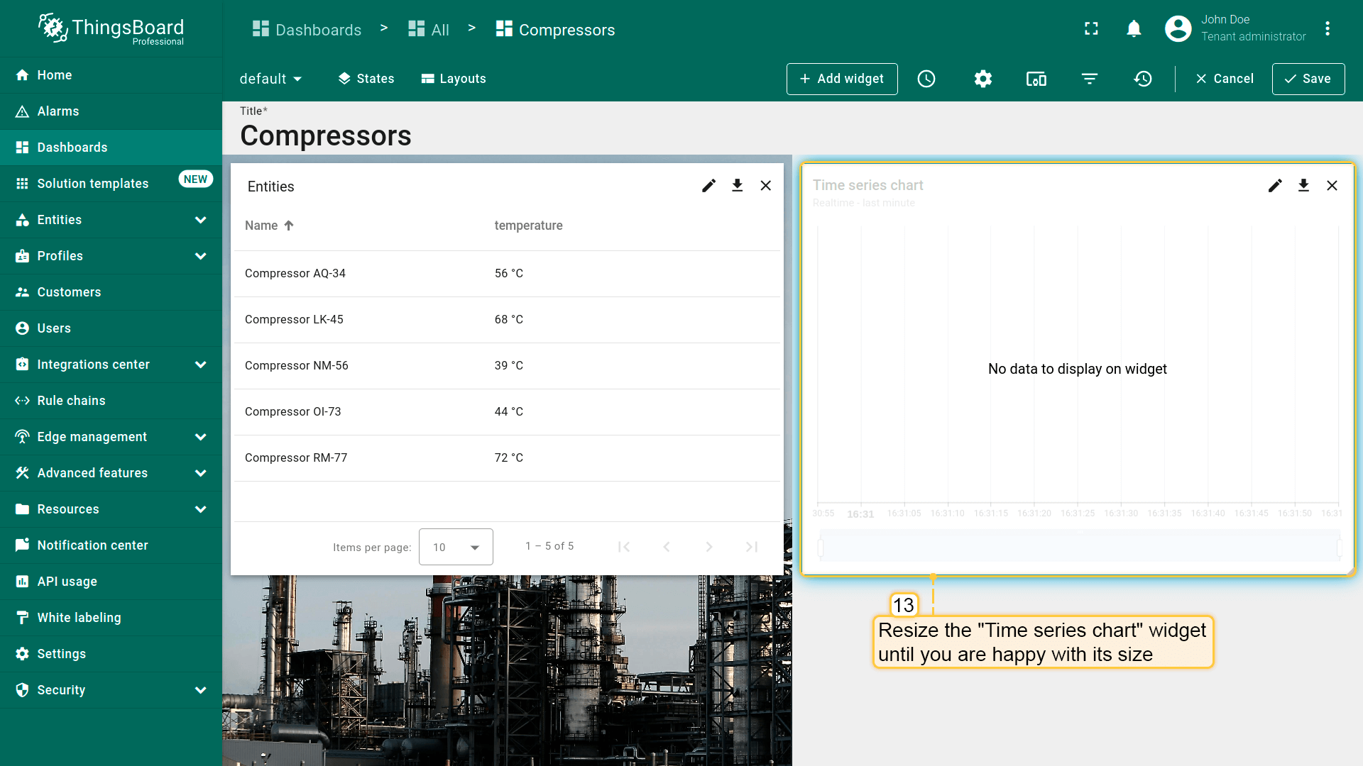 - Replace the label of the "temperature" key with ${entityName}. Then, click "Add" to add new widget on the dashboard;