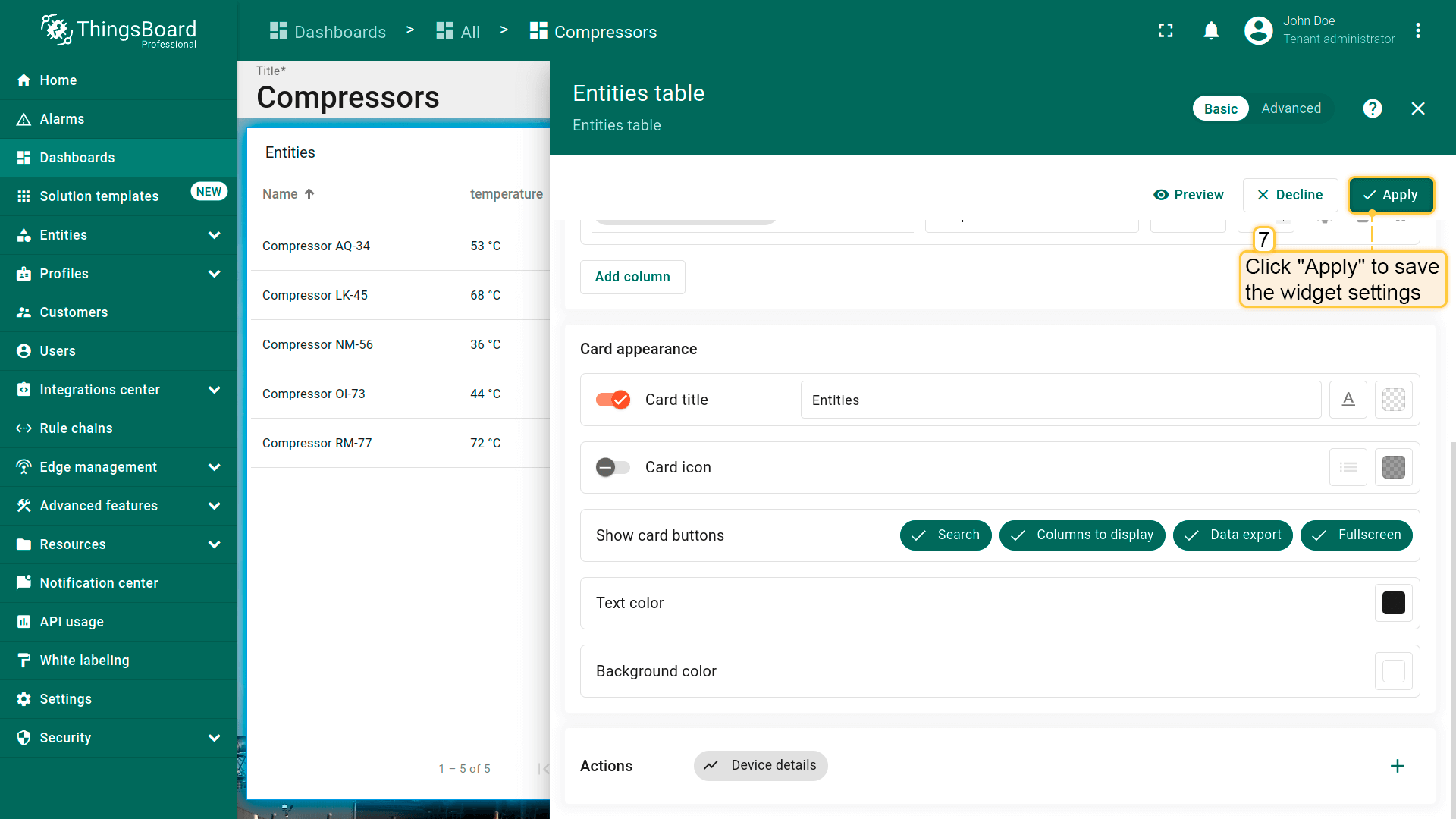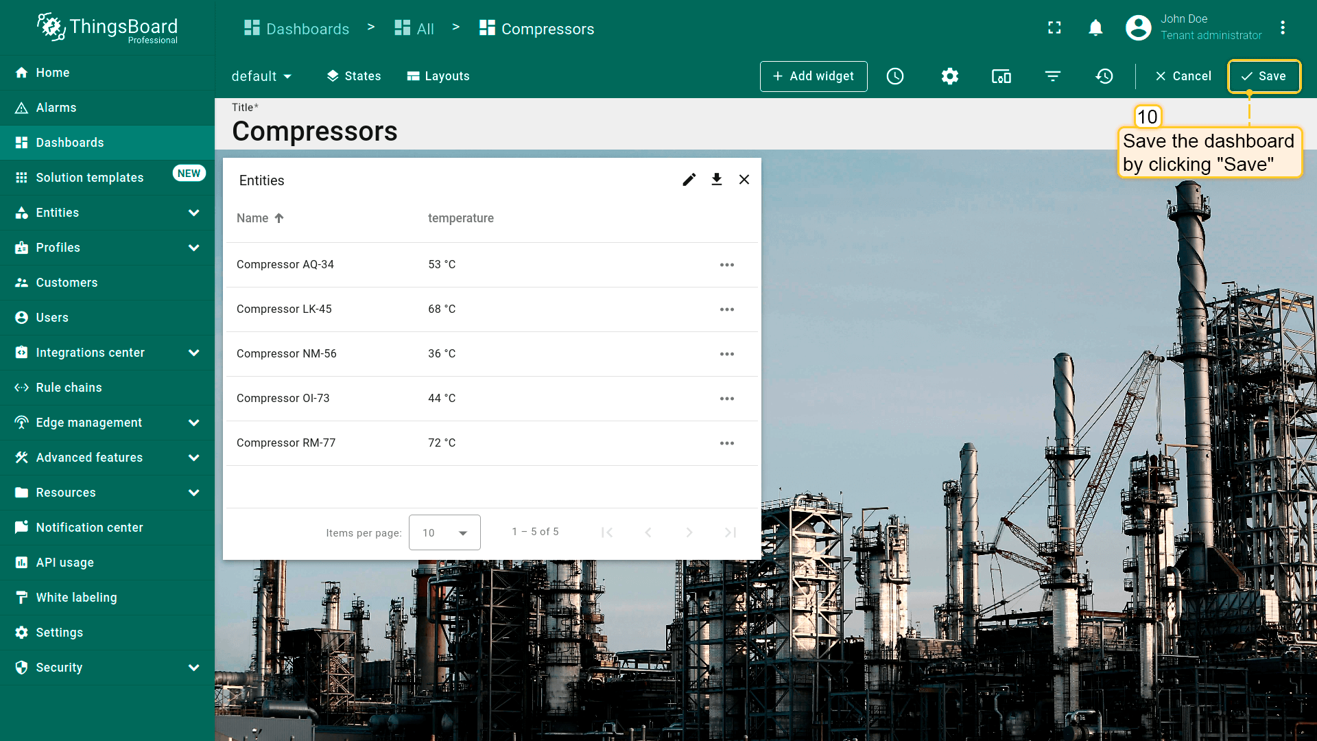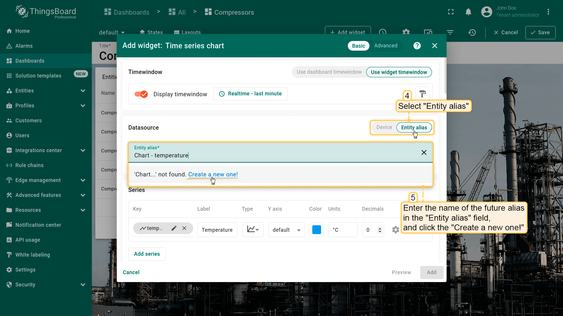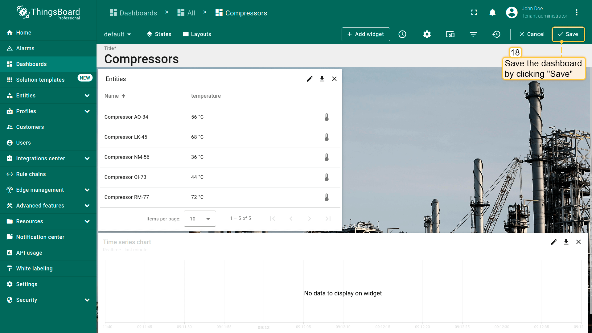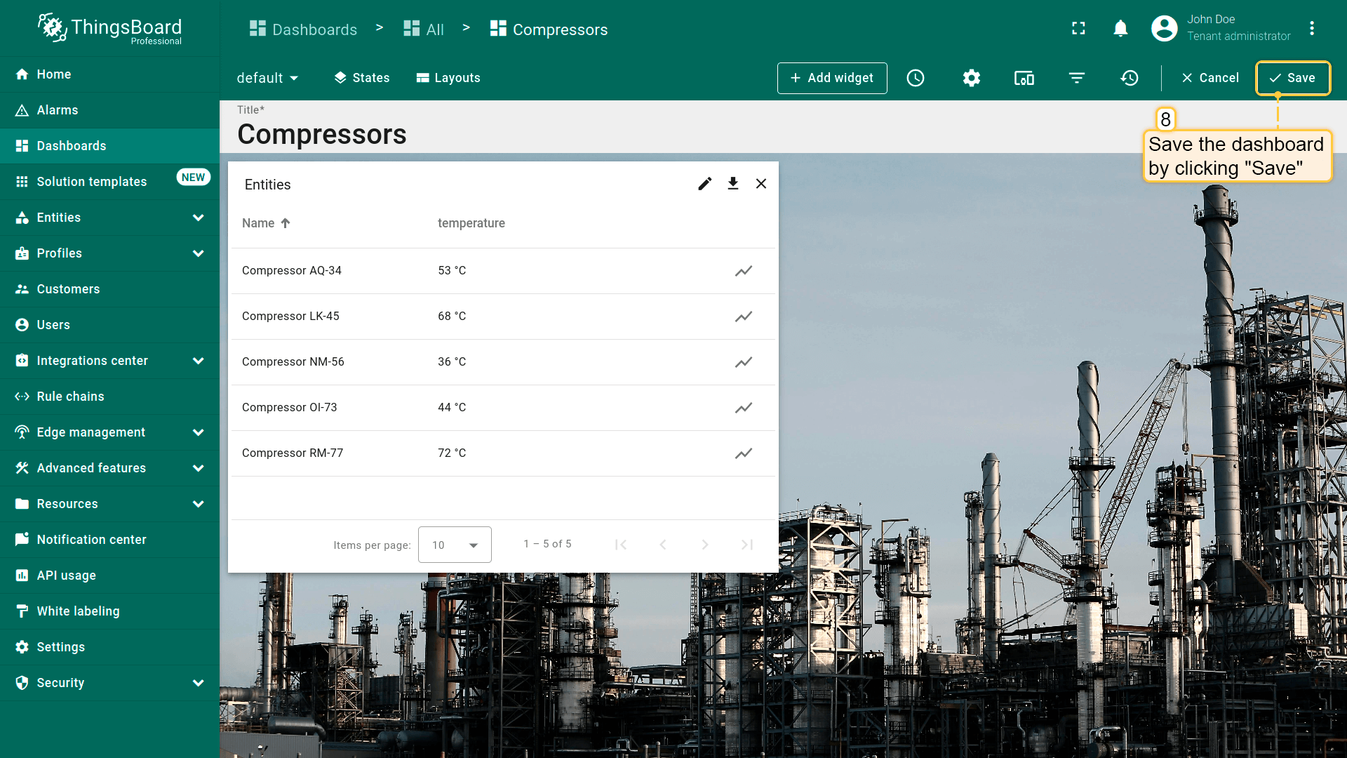- Replace the label of the "temperature" key with ${entityName}. Then, click "Add" to add new widget on the dashboard;