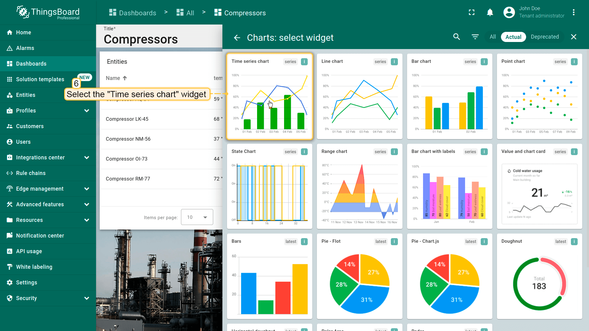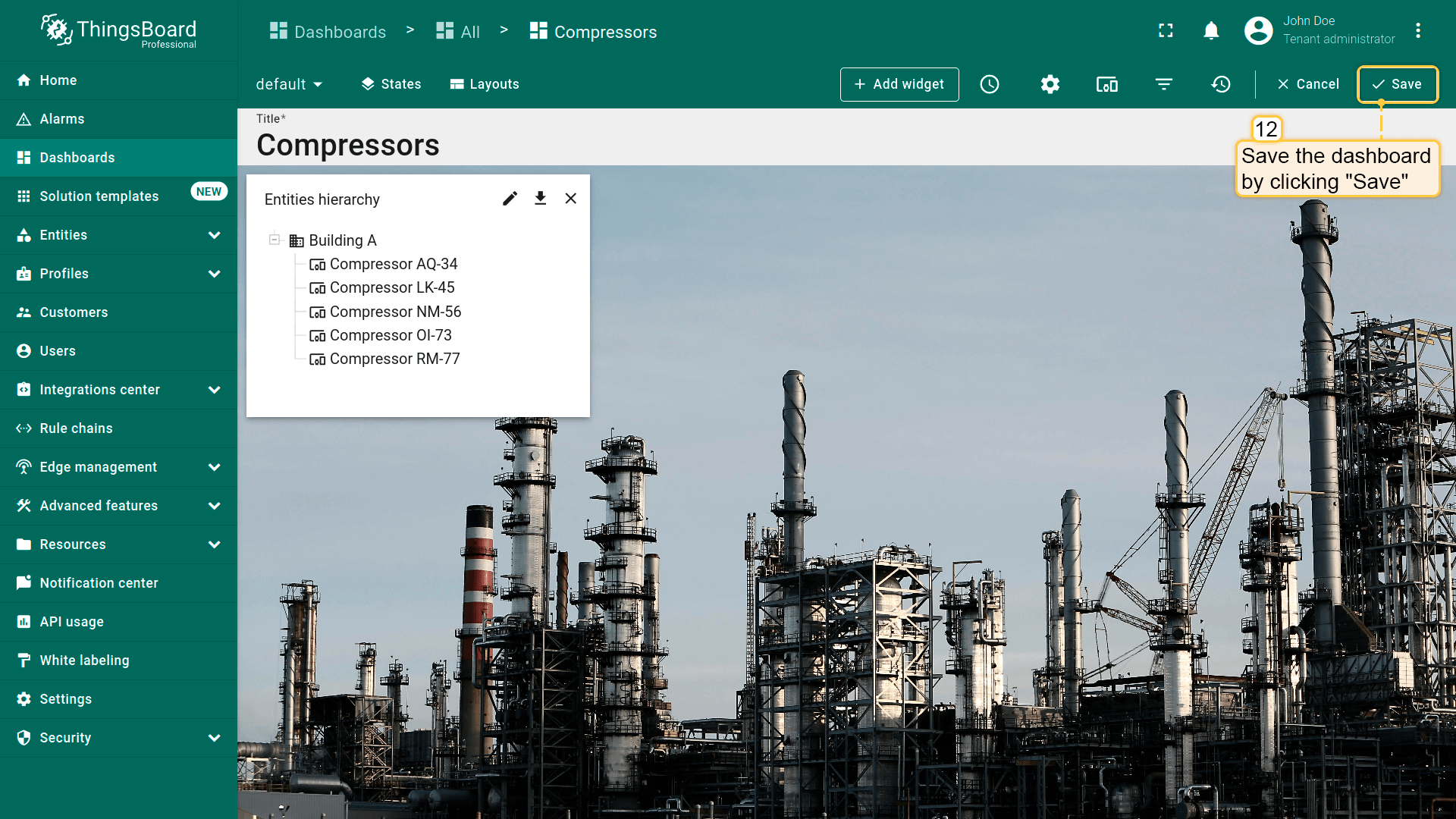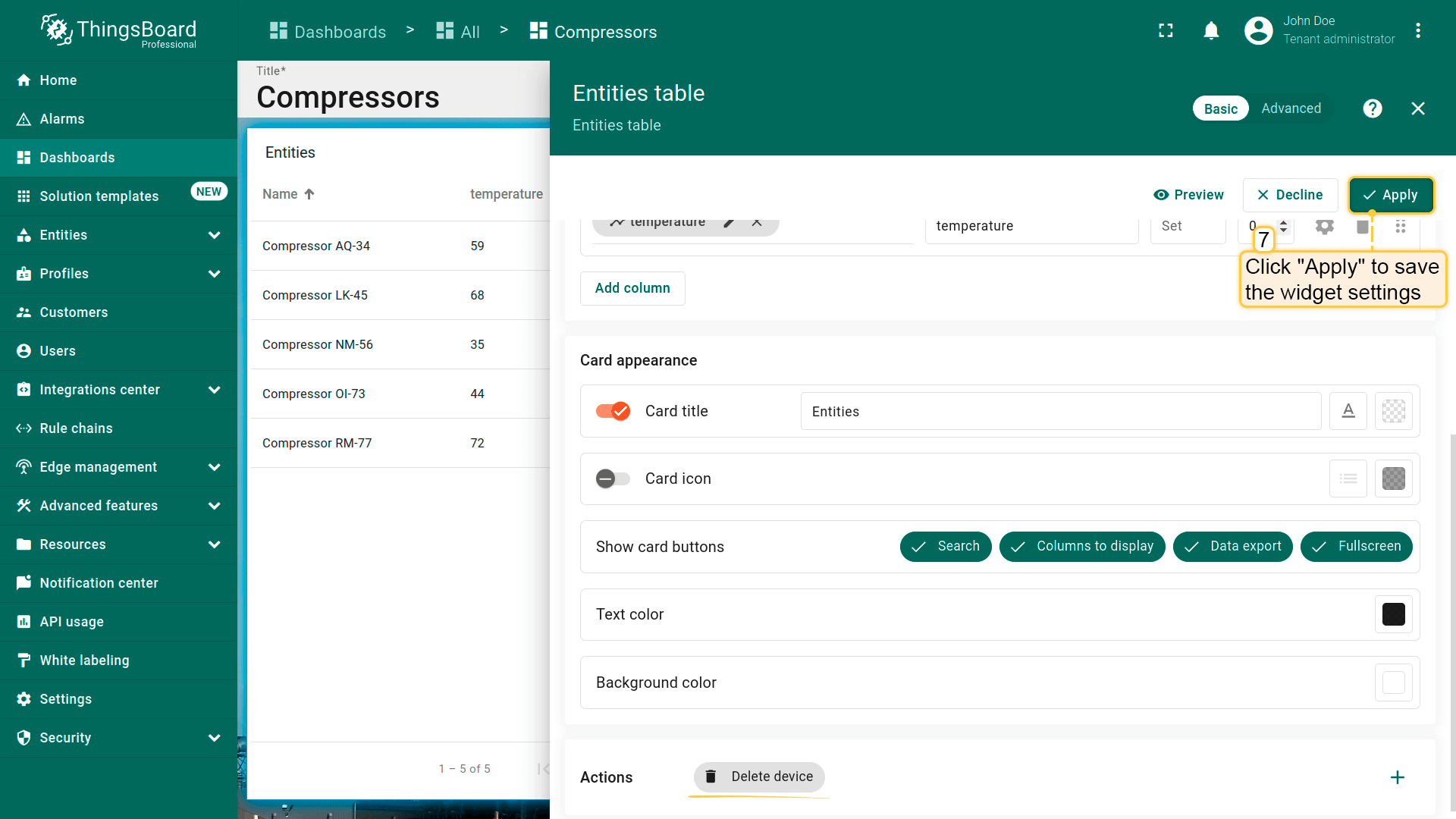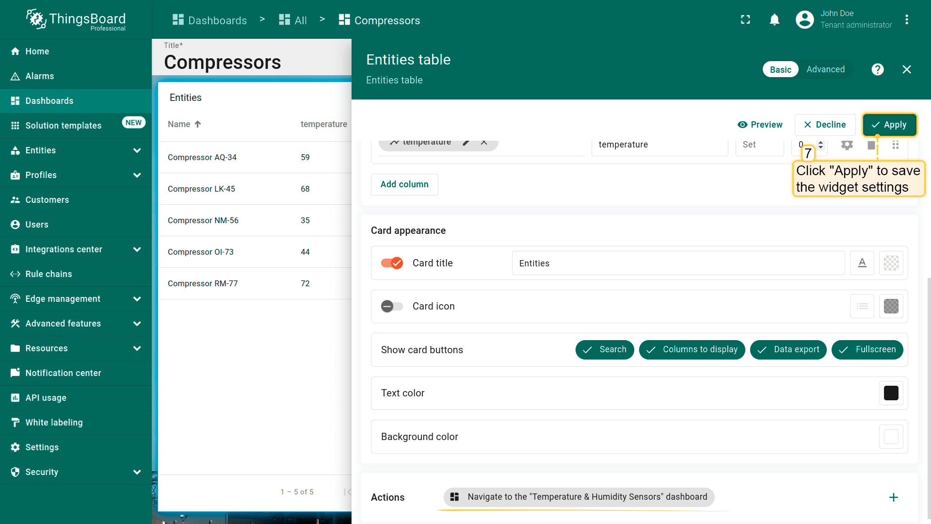 - Replace the label of the "temperature" key with ${entityName}. Then, click "Add" to add new widget on the dashboard;