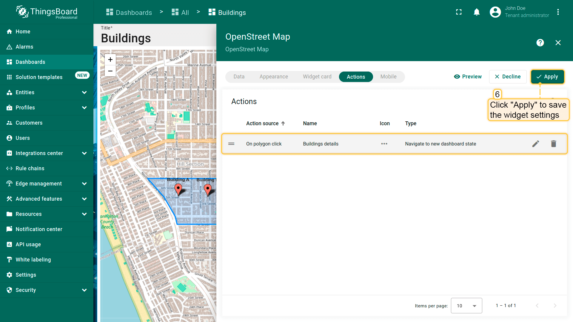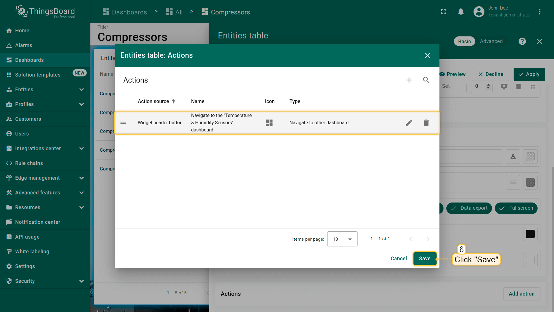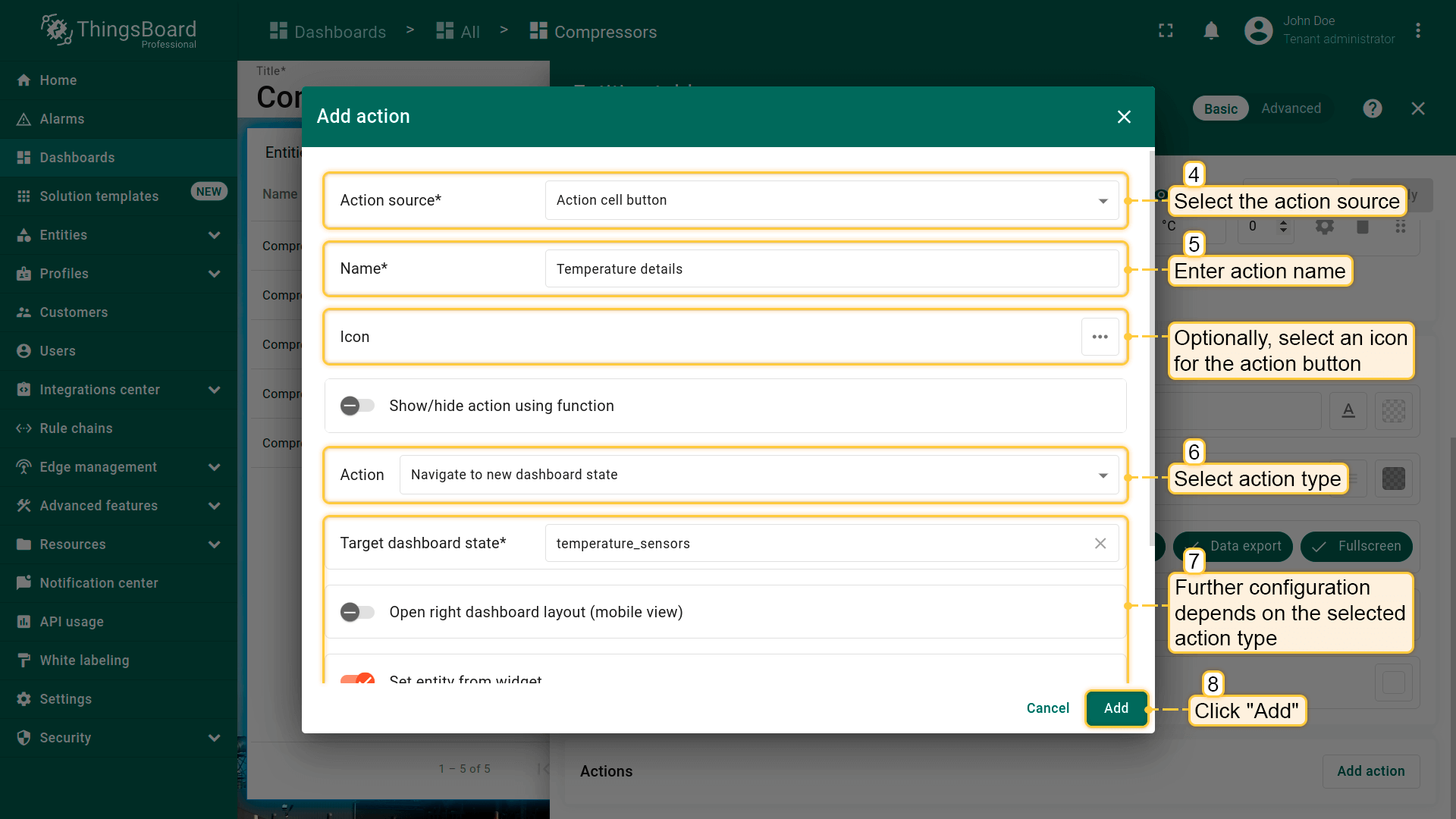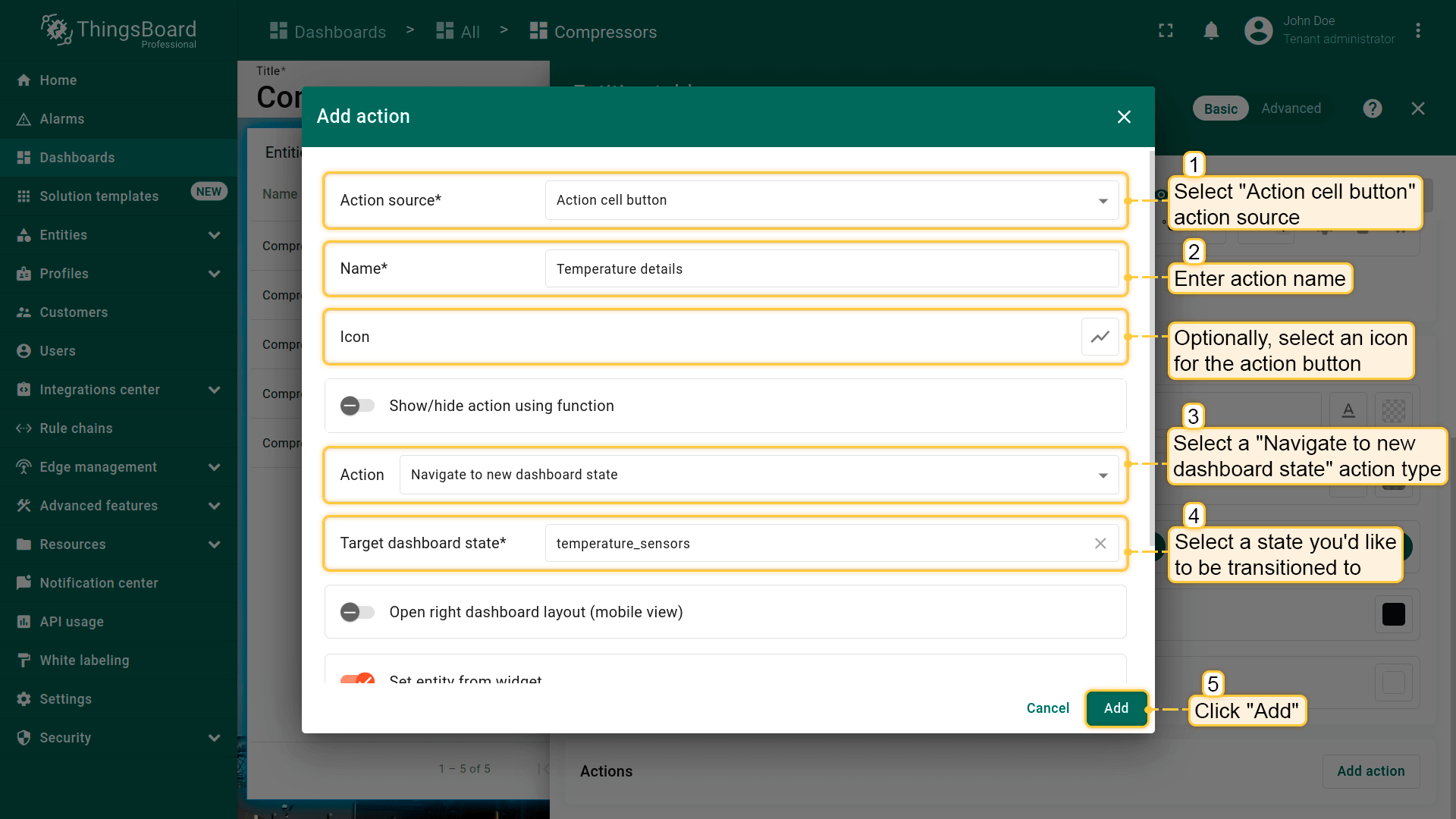 为“Entities table”部件的每个实体添加类型为“Update current dashboard state”的action按钮。 假设已熟悉“Add action”步骤,直接进行action配置:
