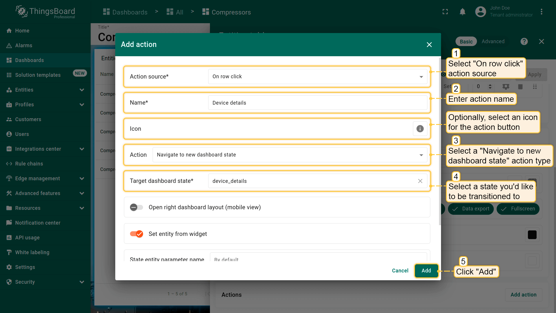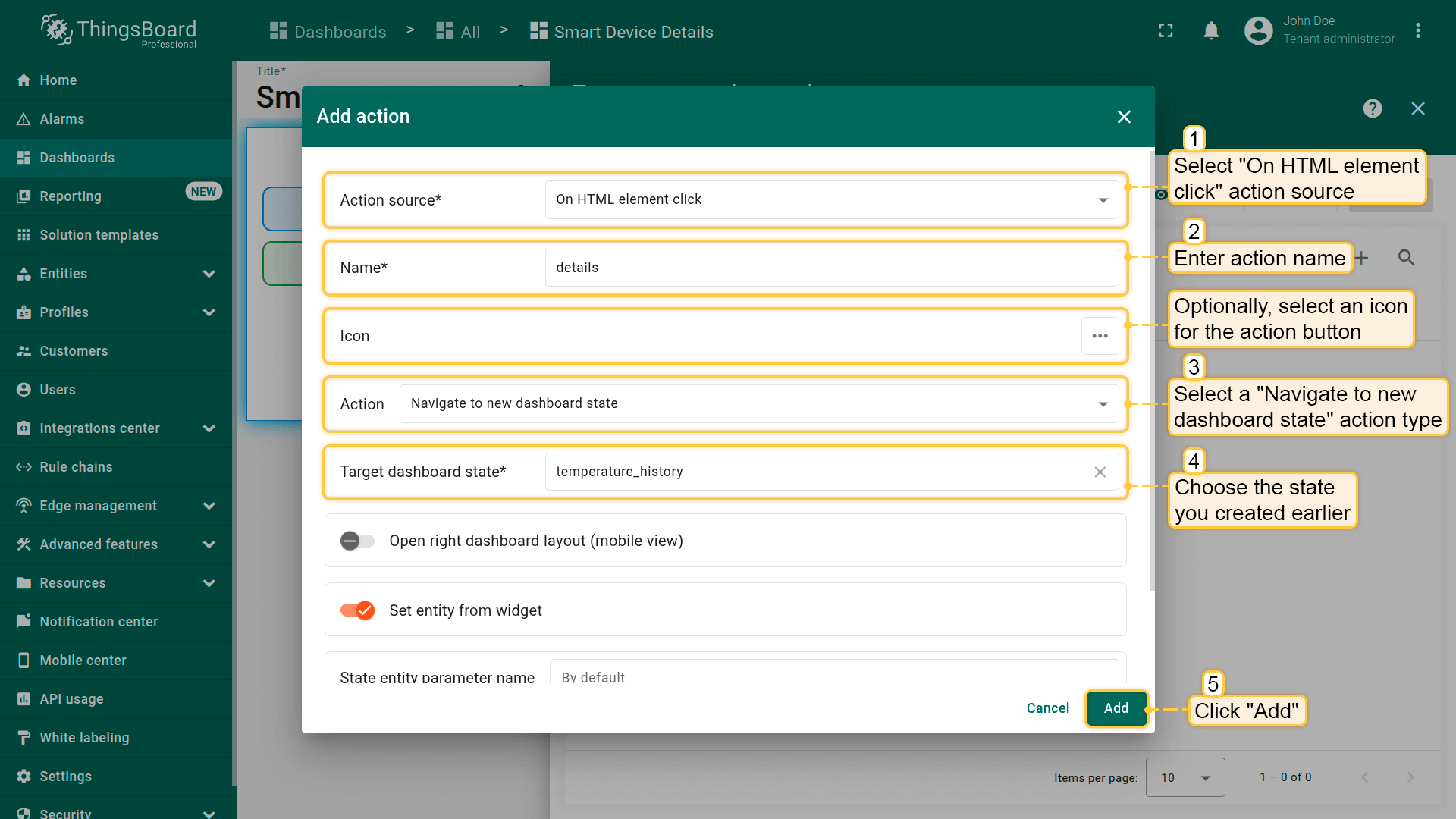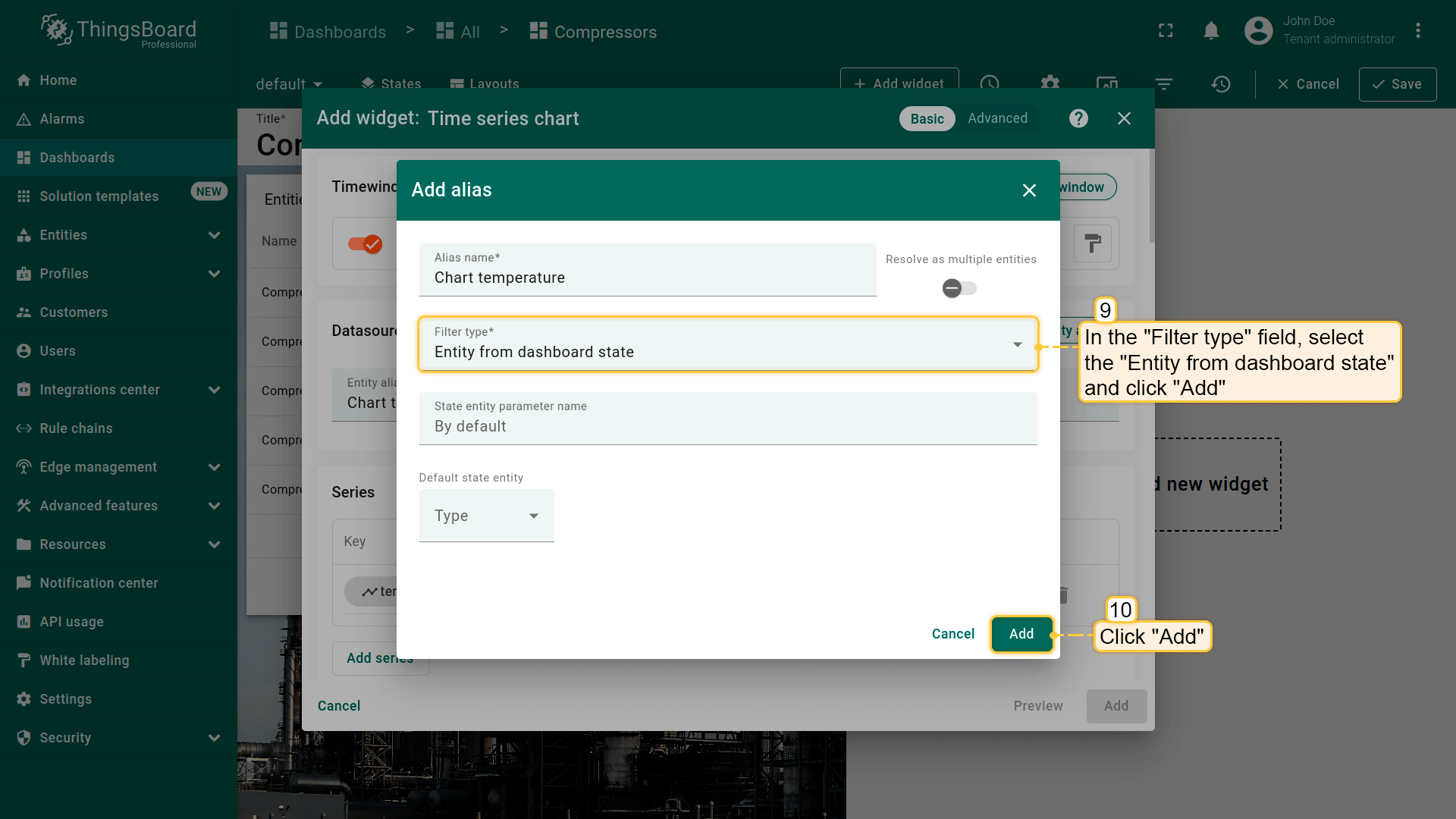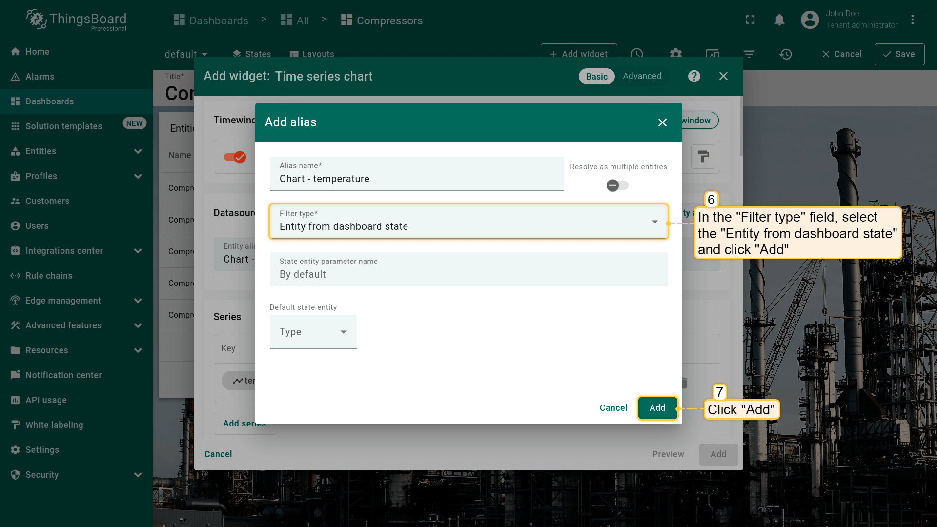 - Select the "Entity from dashboard state" from the "Filter type" field and click "Add";