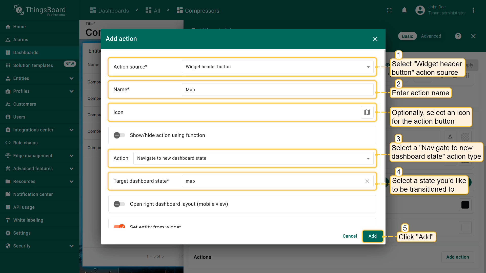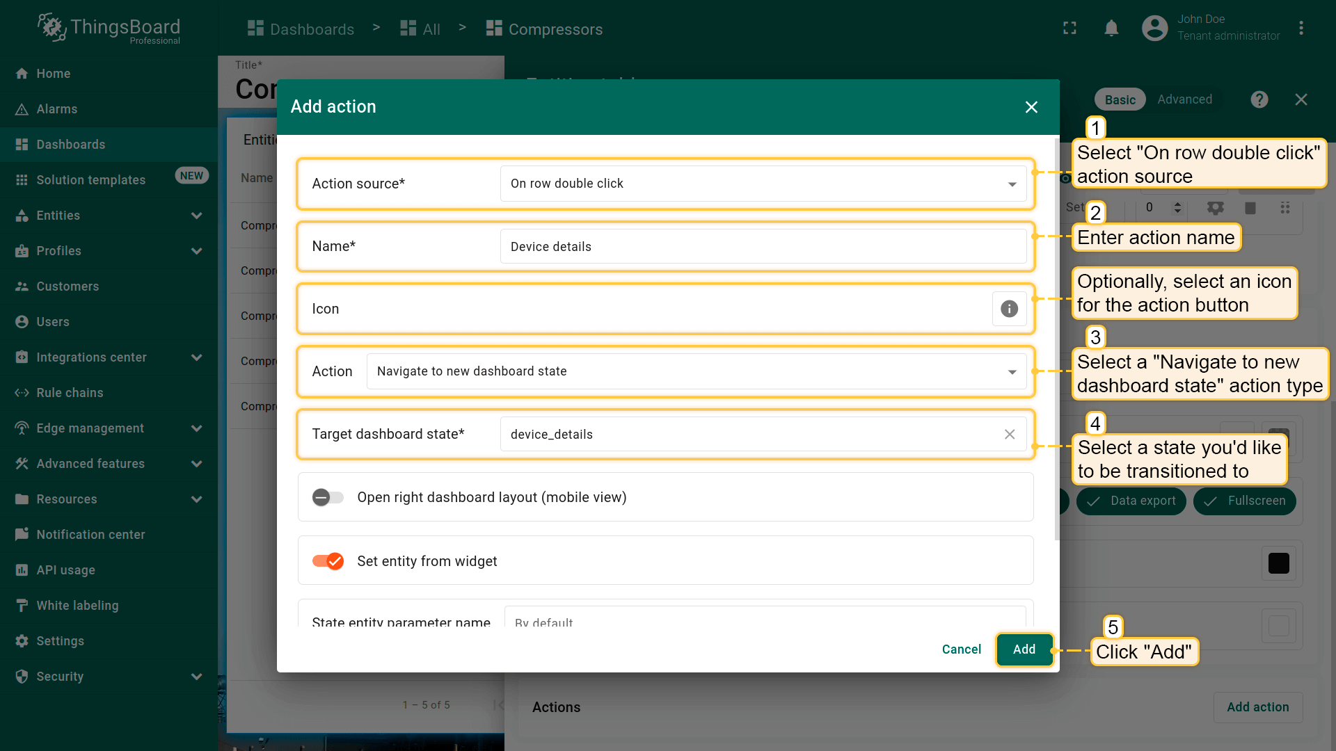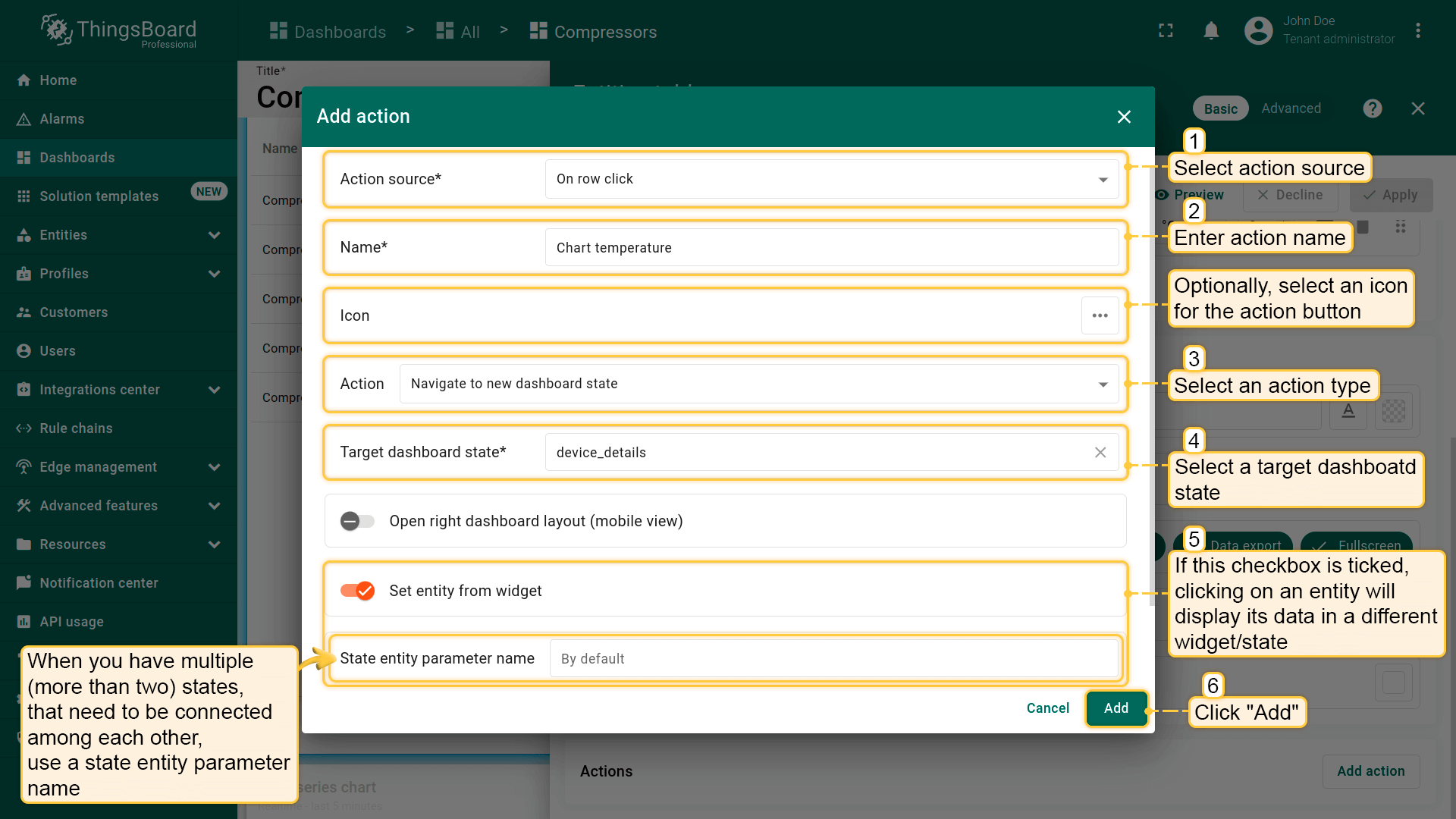 - Select the "Entity from dashboard state" from the "Filter type" field and click "Add";