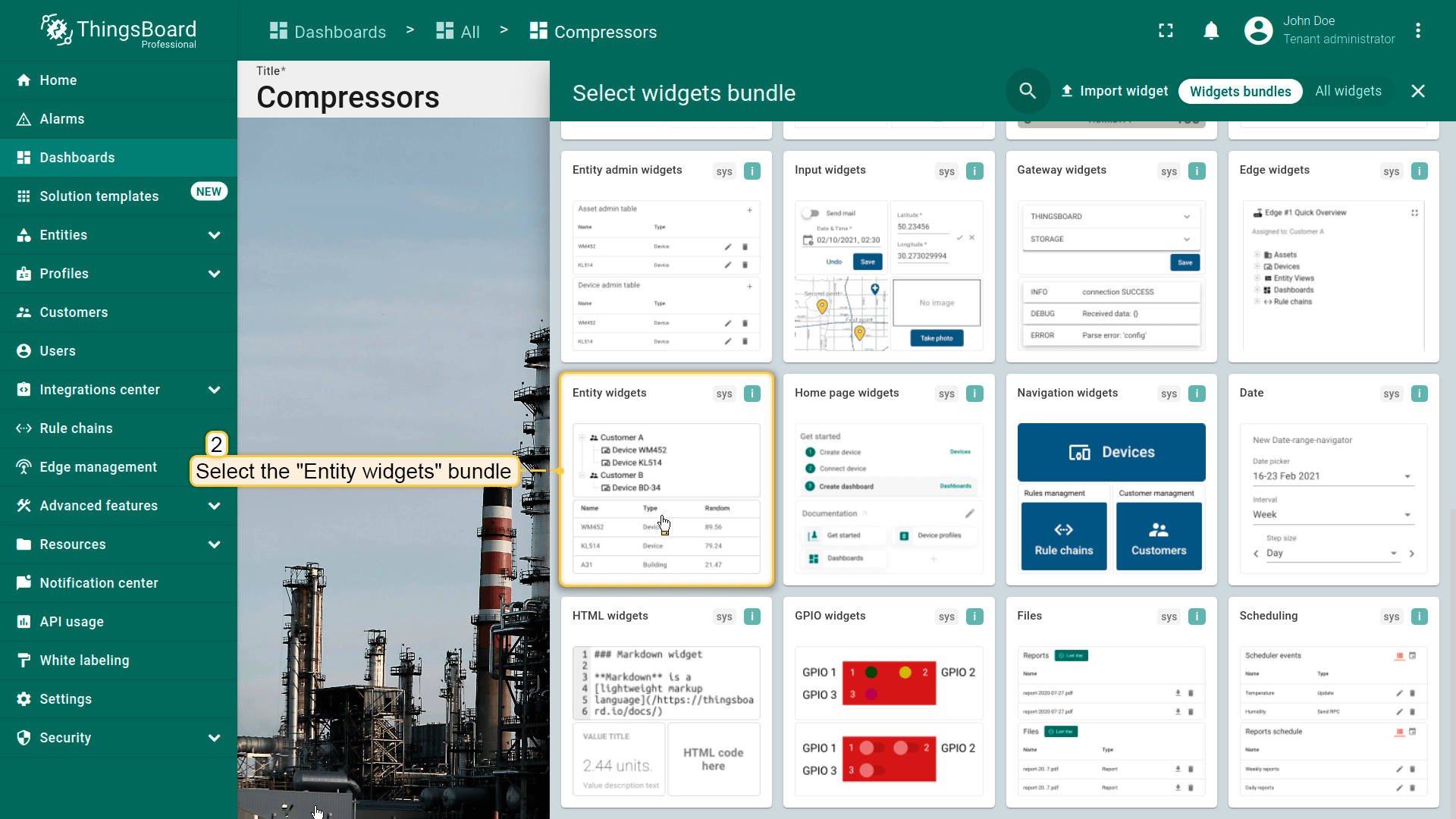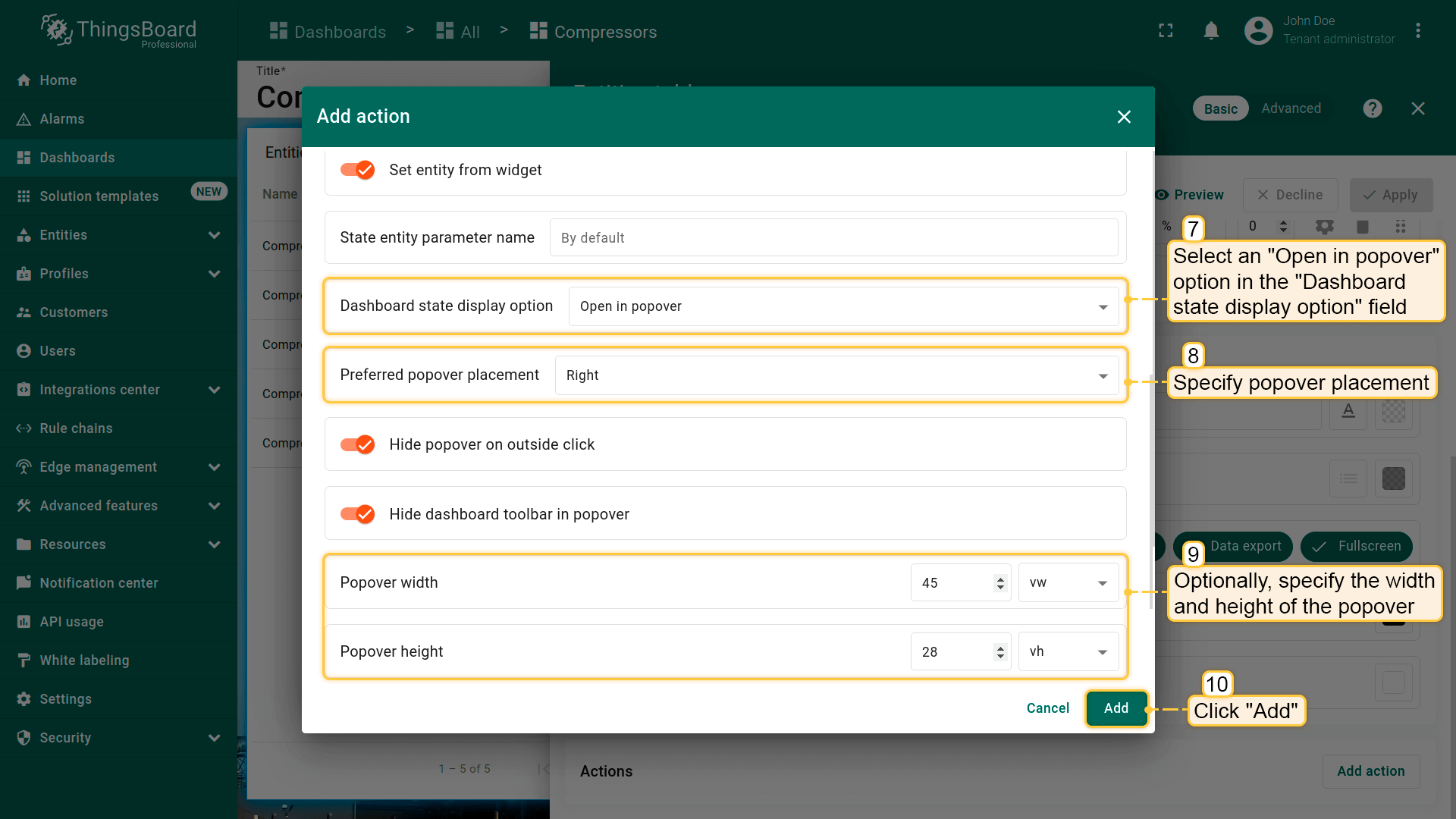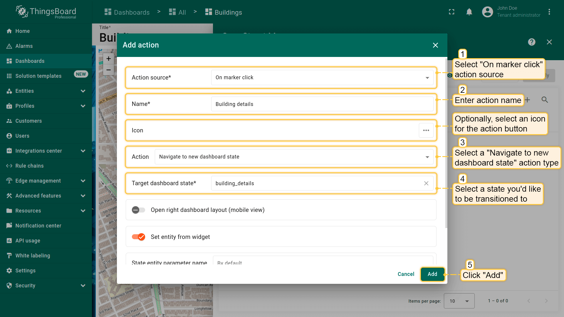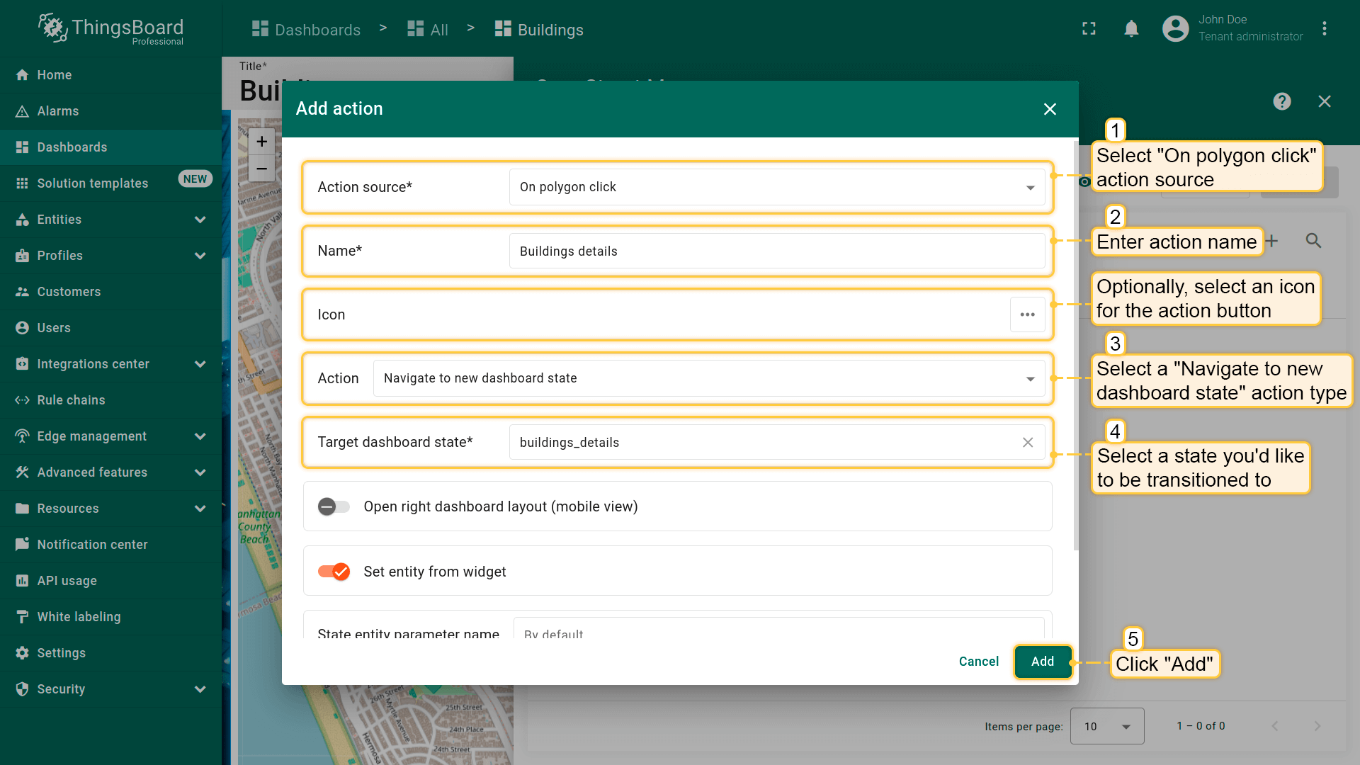 - Select the "Entity from dashboard state" from the "Filter type" field and click "Add";