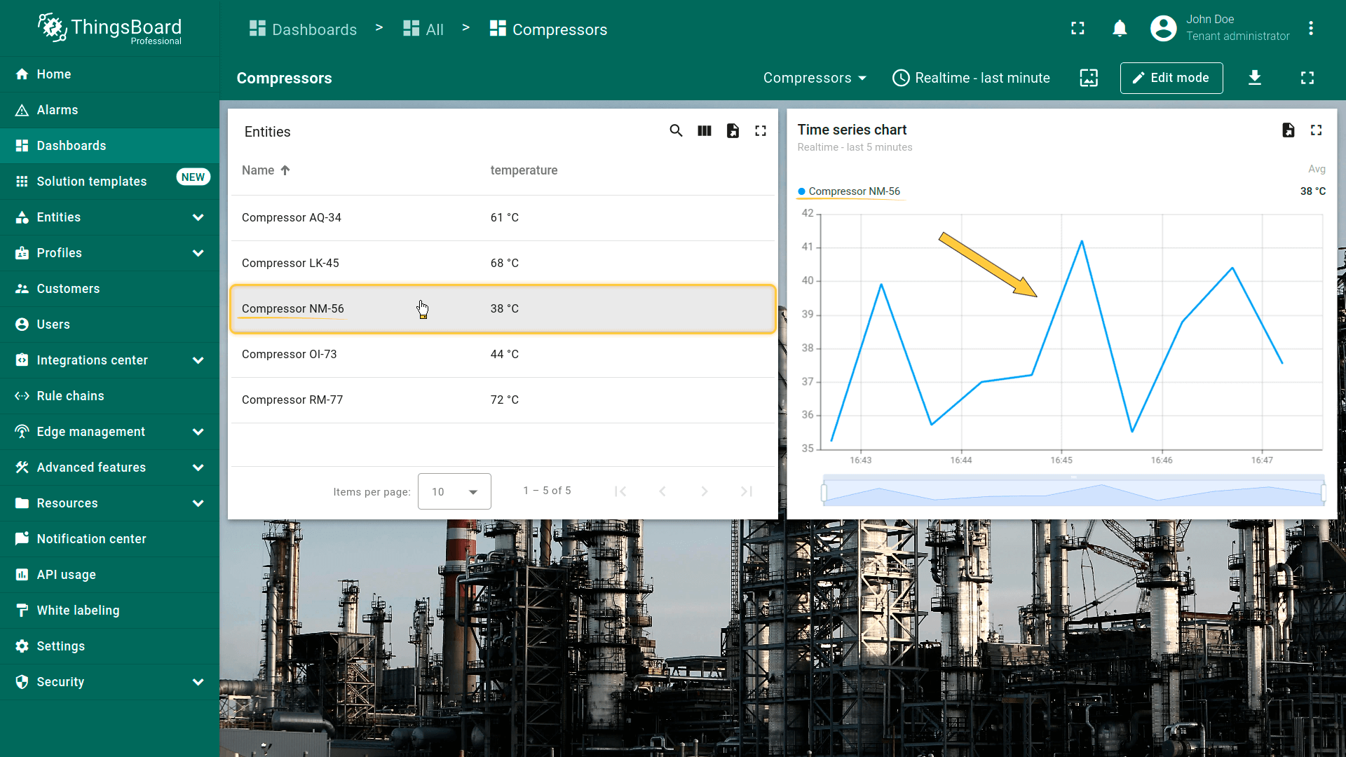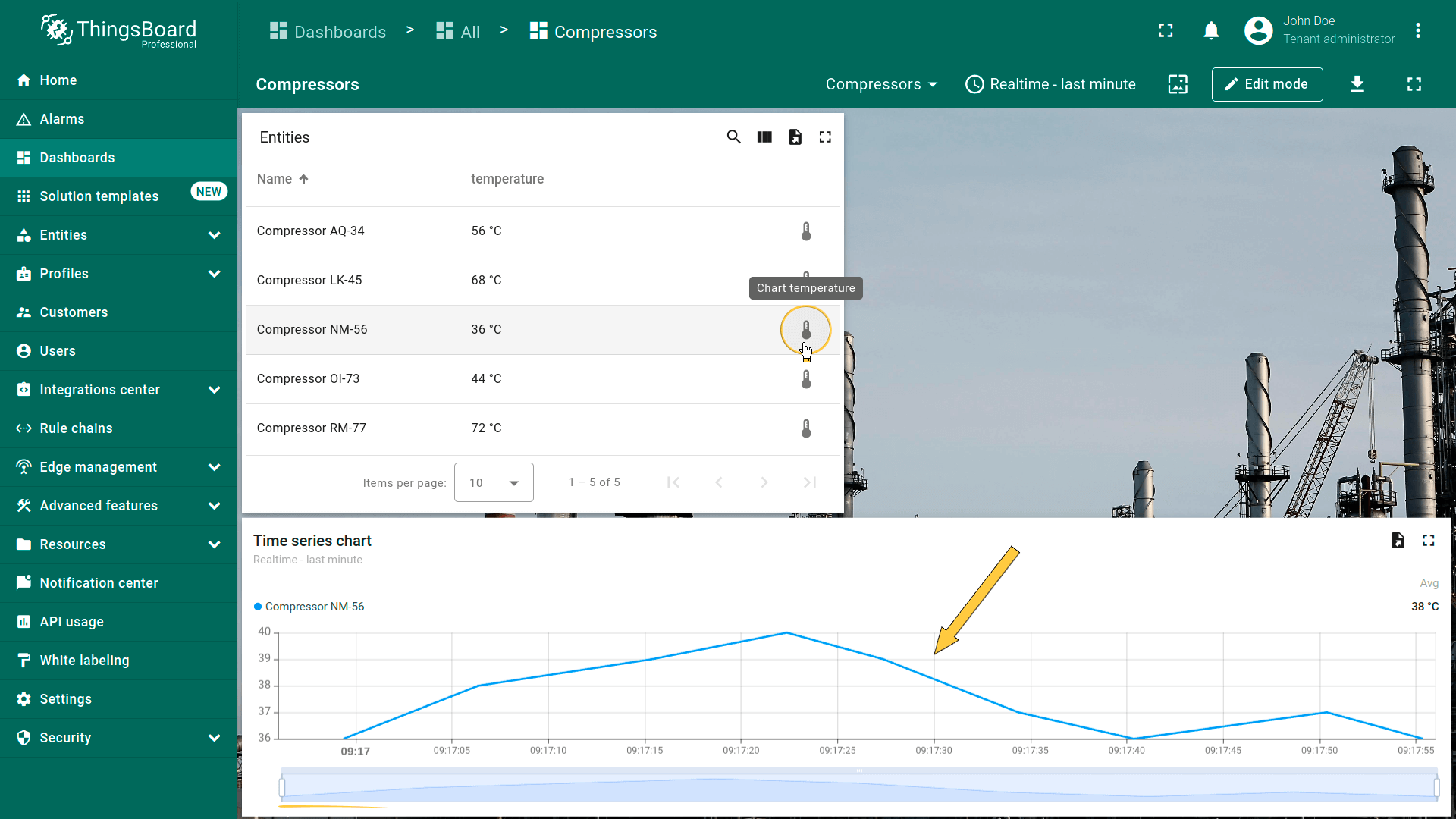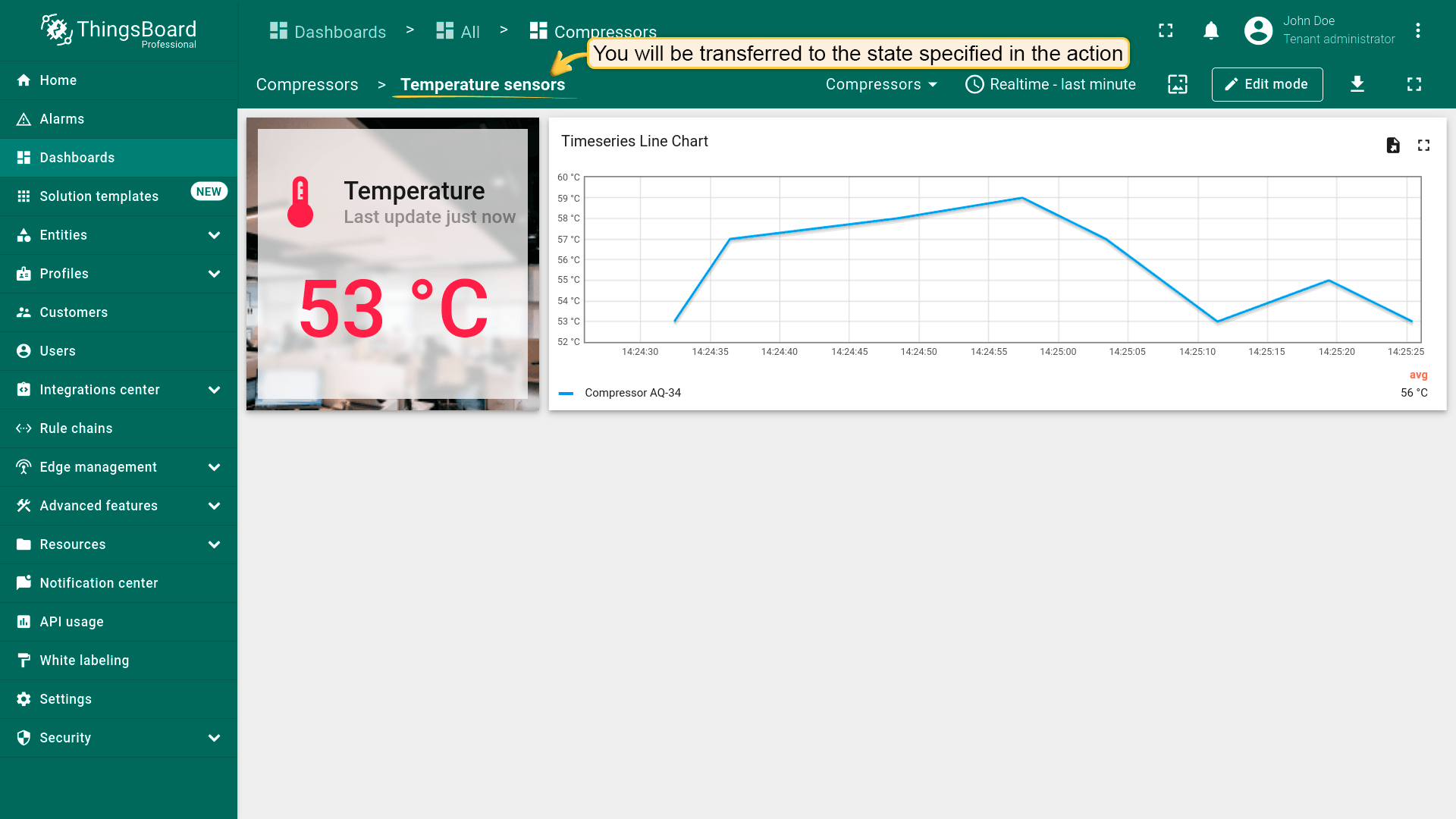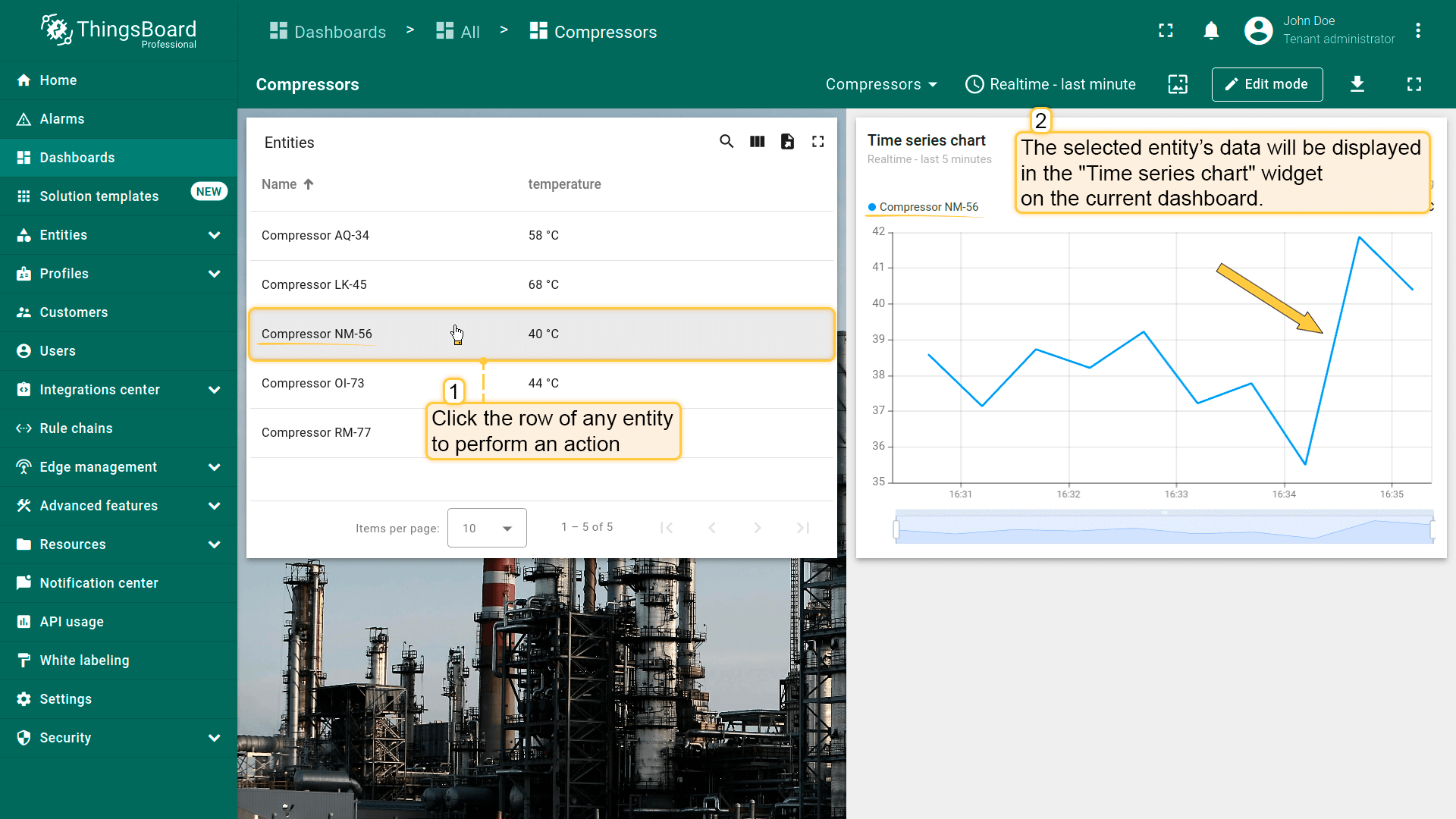 点击“Entity Table”部件中任意实体行即可执行action,即更新所选实体的详情。该实体数据将显示在当前dashboard的“Time series chart”部件上。