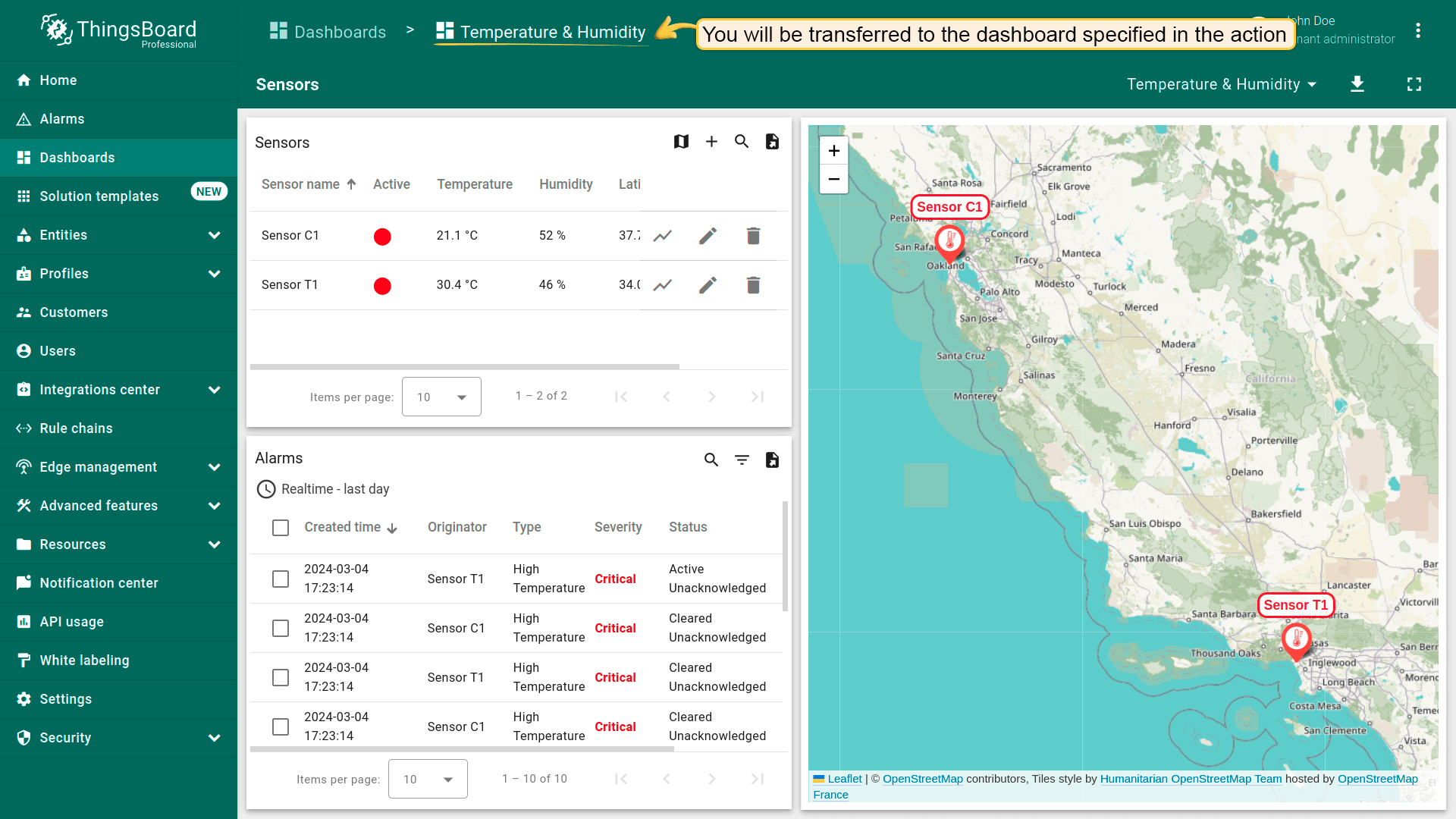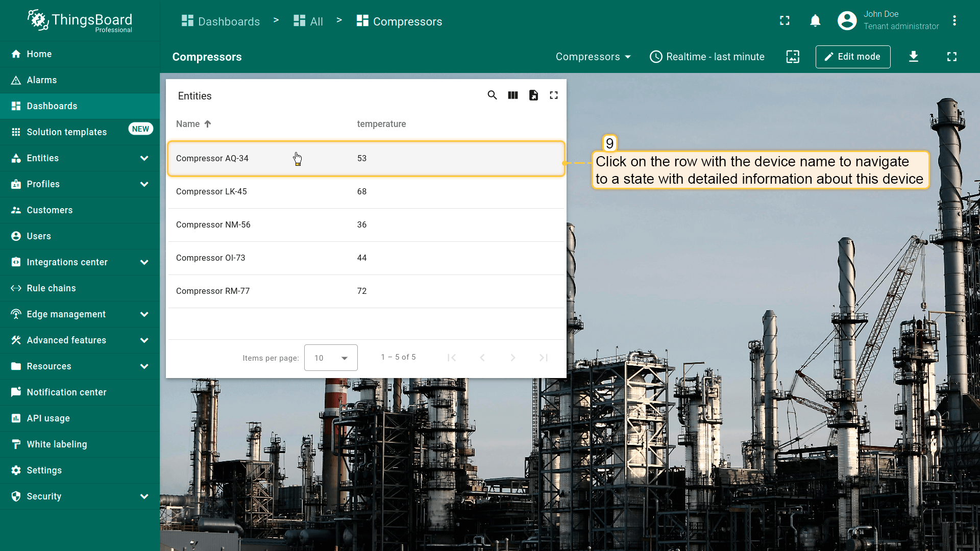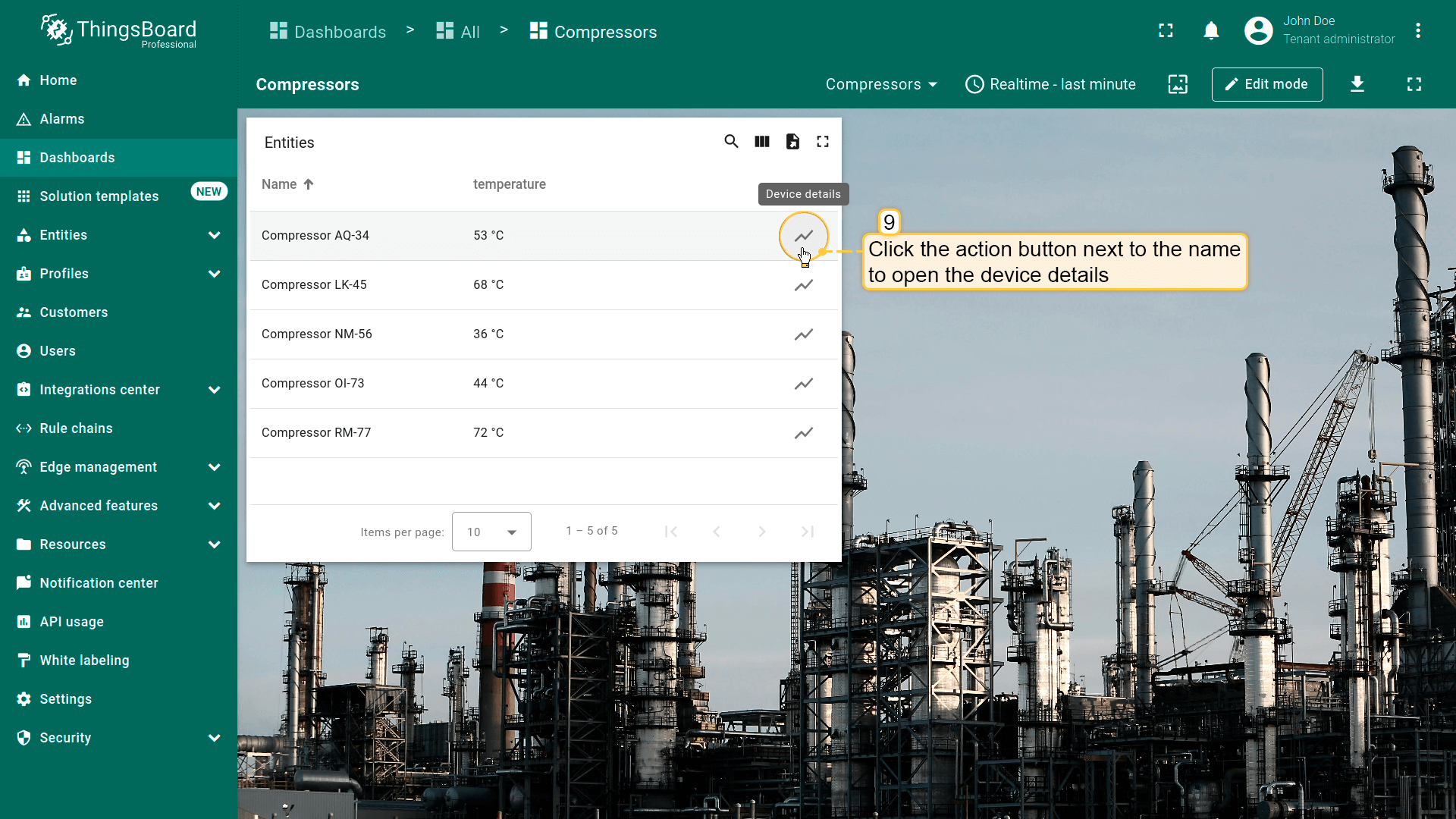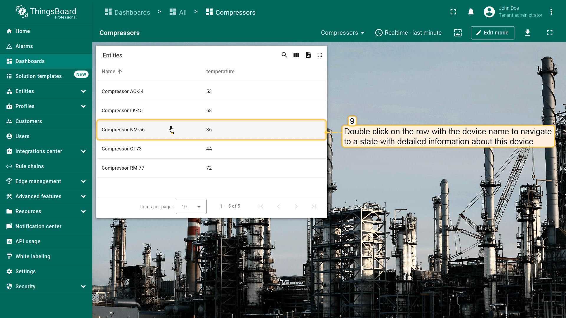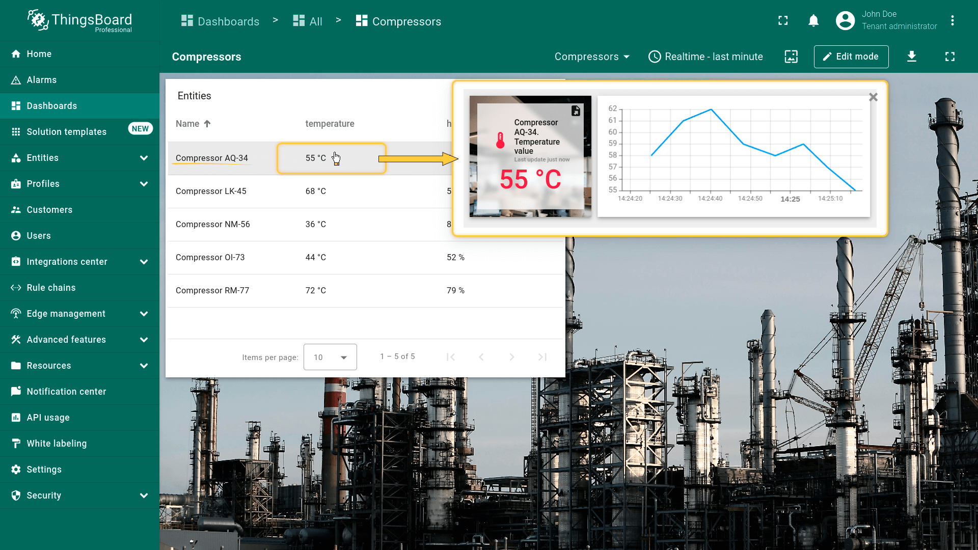 点击“Entity Table”部件中任意实体行即可执行action,即更新所选实体的详情。该实体数据将显示在当前dashboard的“Time series chart”部件上。