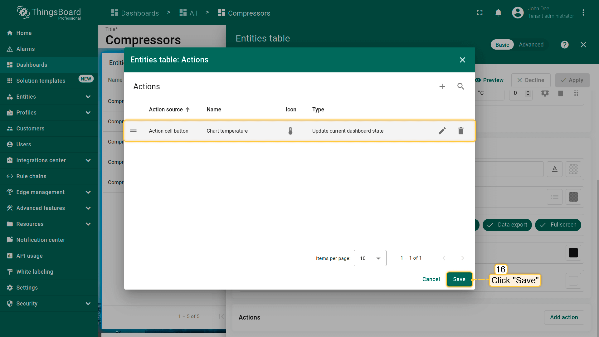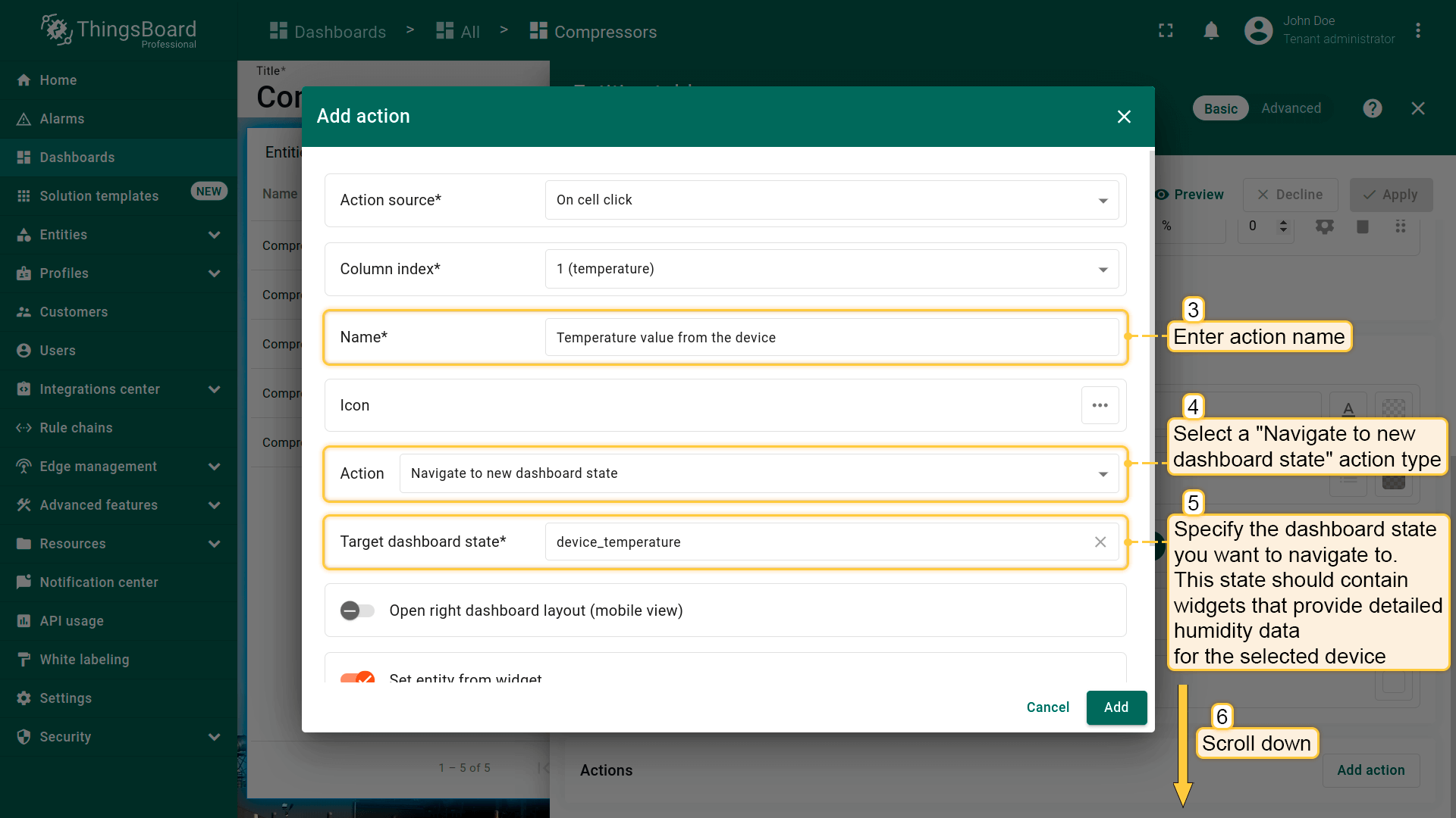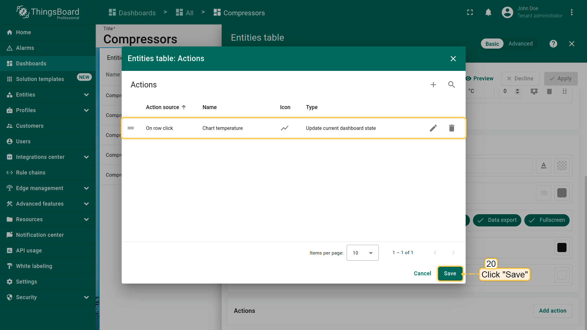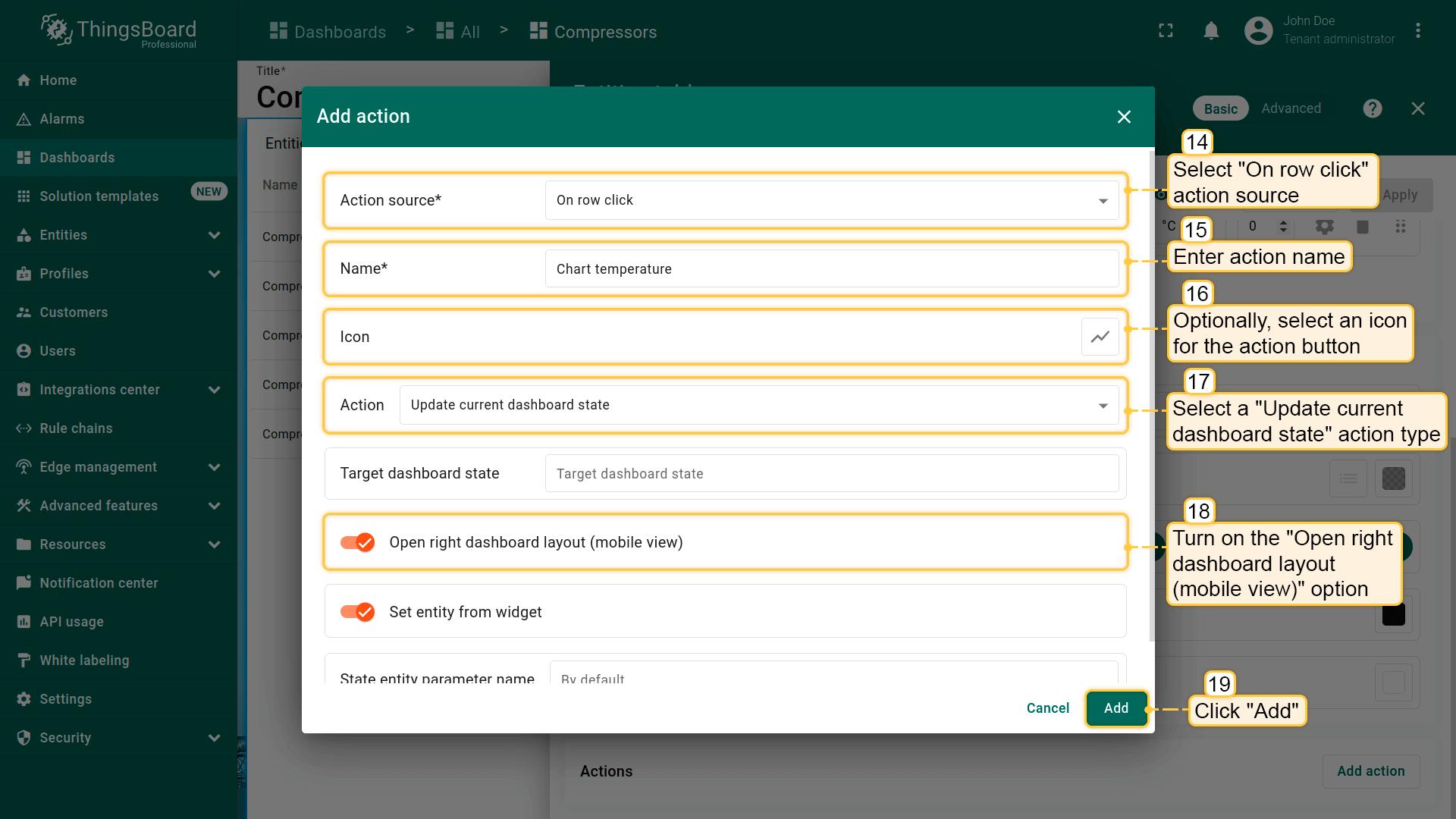 下面为“Entities table”部件添加类型为“Update current dashboard state”的action。 假设已熟悉“Add action”步骤,直接进行action配置: