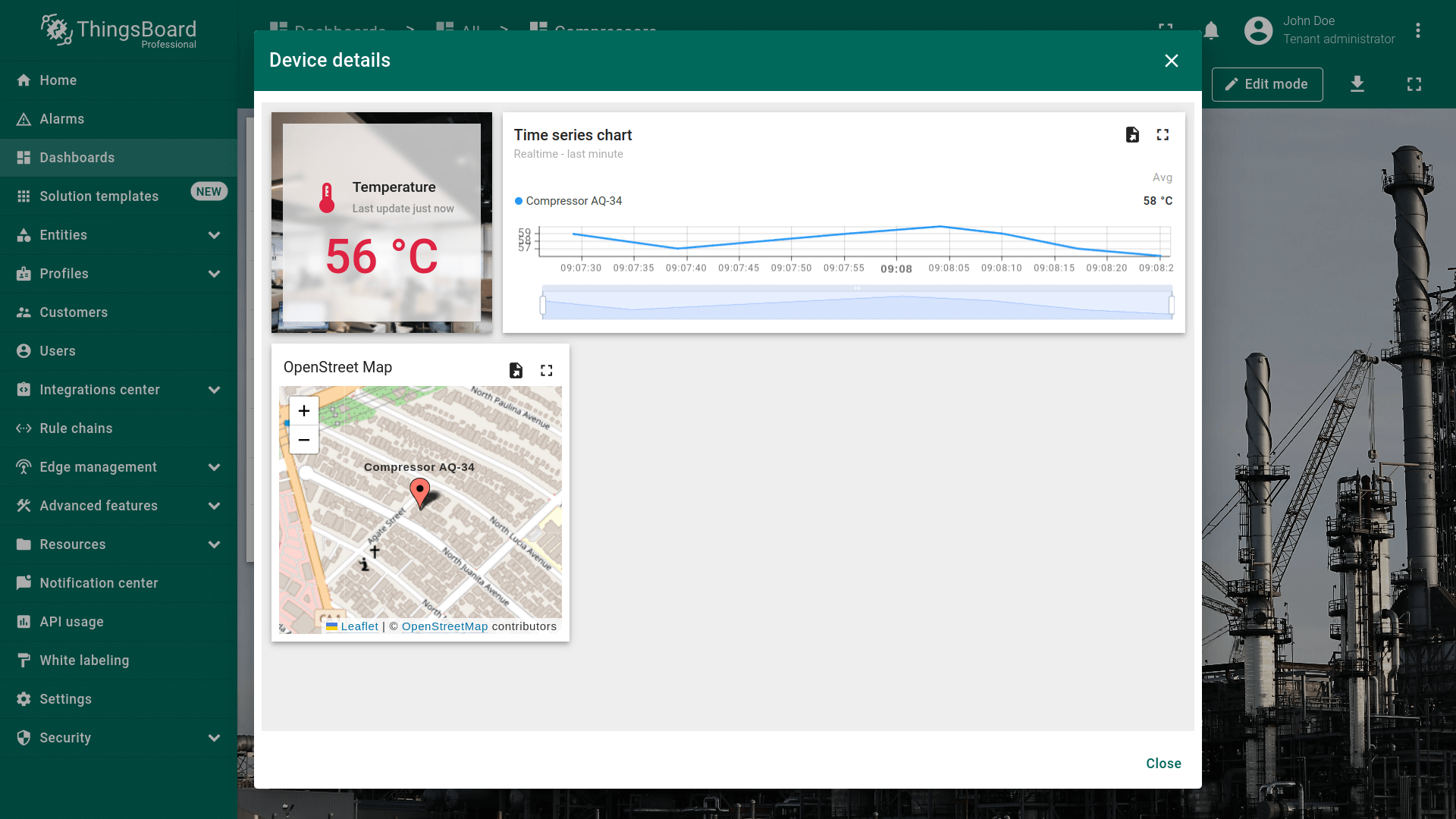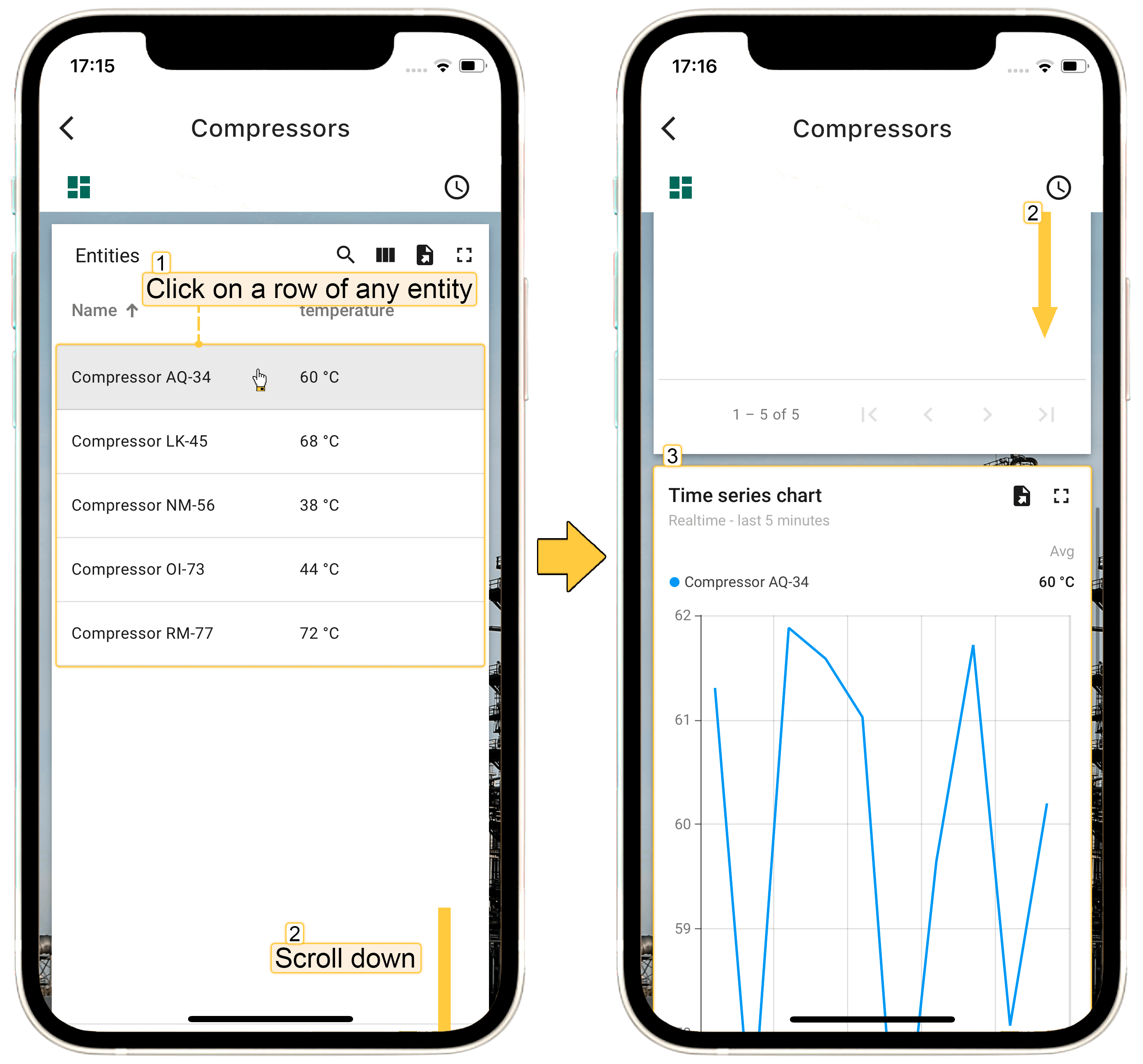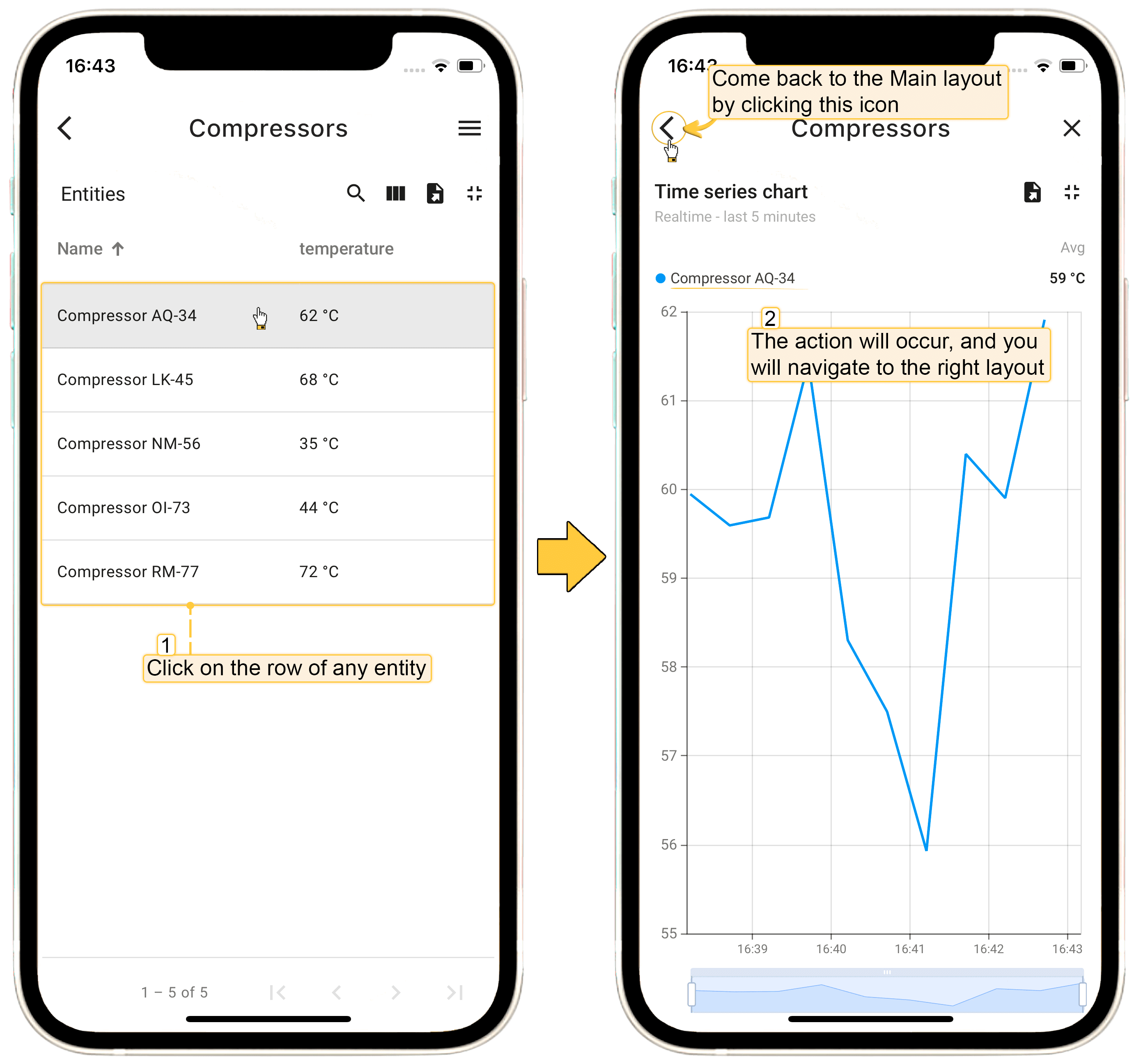 在 ThingsBoard PE Mobile Application 中打开该dashboard。点击“Entity table”部件中任意实体行,将直接跳转到“Time series chart”部件,查看主部件所选实体的详情。