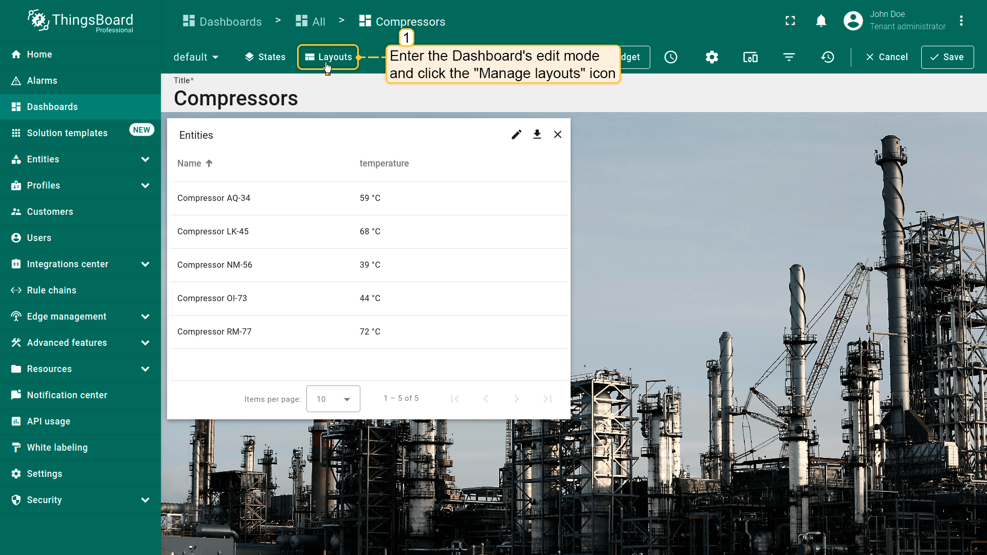 - Enter the Dashboard's edit mode On the left top of the window click "Manage layouts" icon;