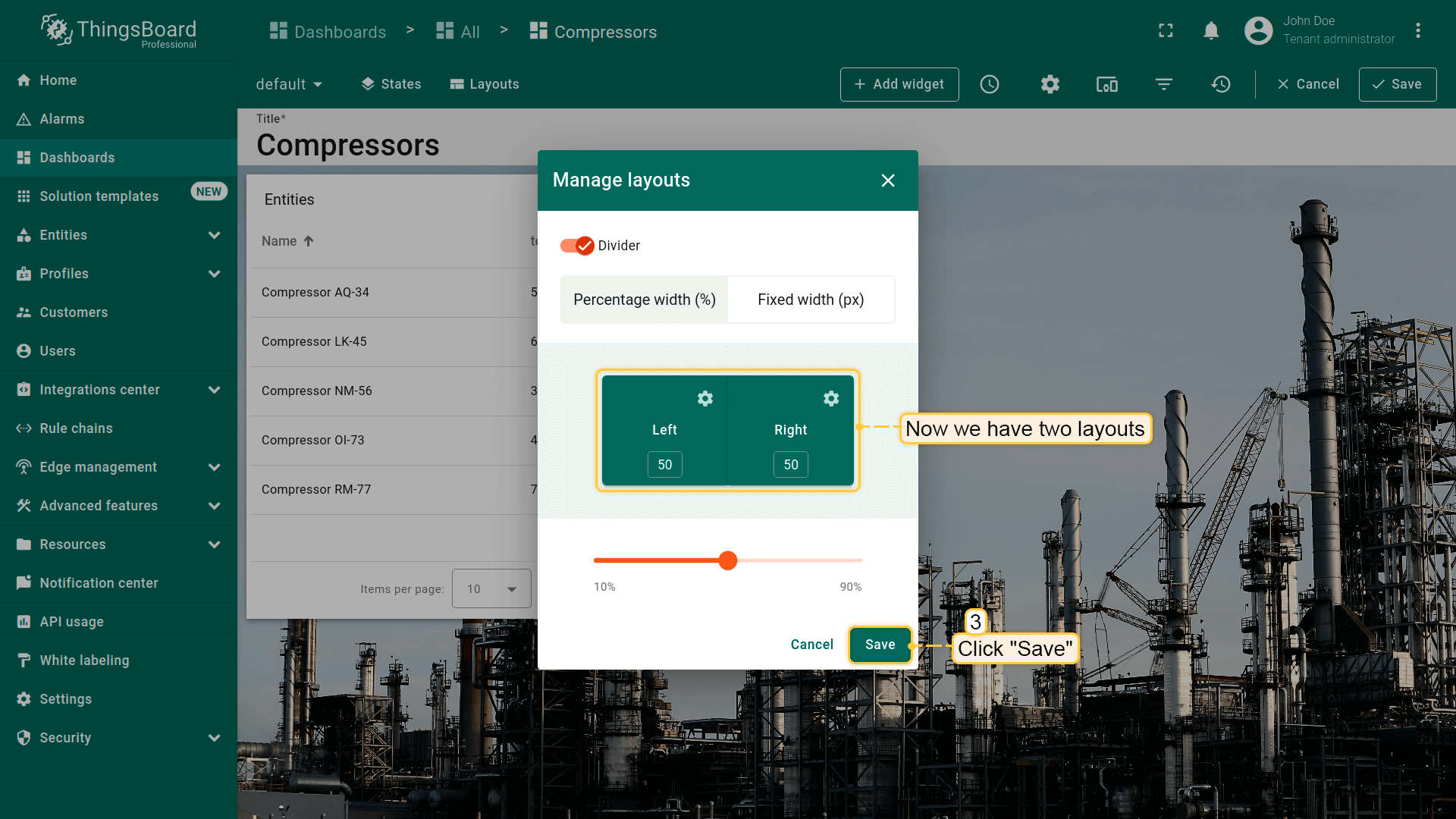 - Now we have two layouts. Optionally, you can adjust the size of the windows in a certain percentage ratio relative to each other. Click "Save";