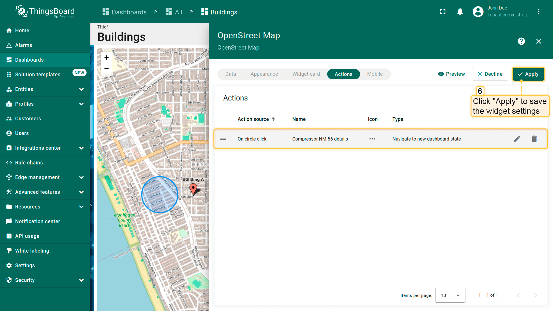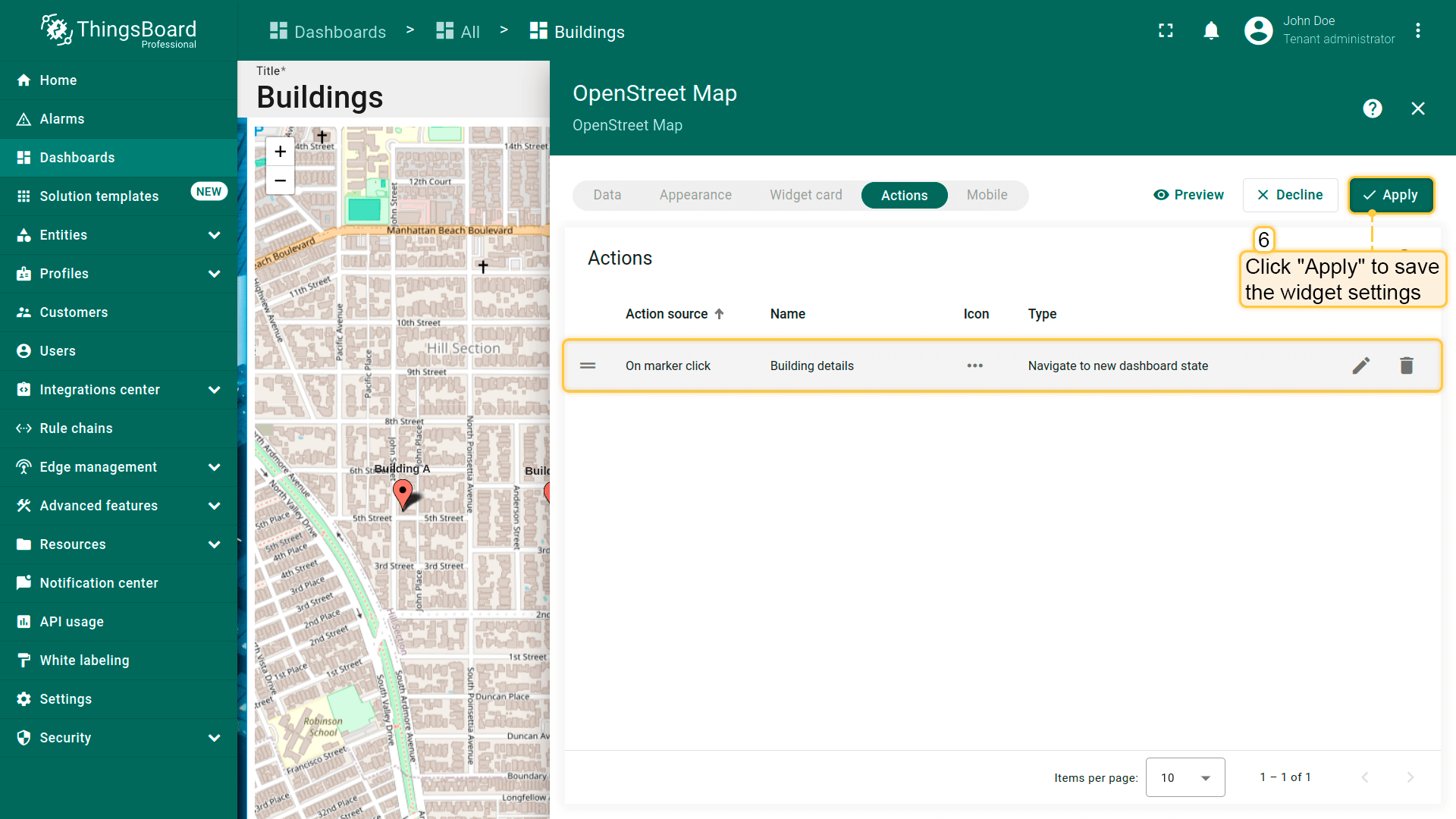 保存后,ThingsBoard会监听该部件中id与已创建action的Name匹配的元素的点击。若匹配,则执行所选action类型(跳转、更新state、custom action等)。