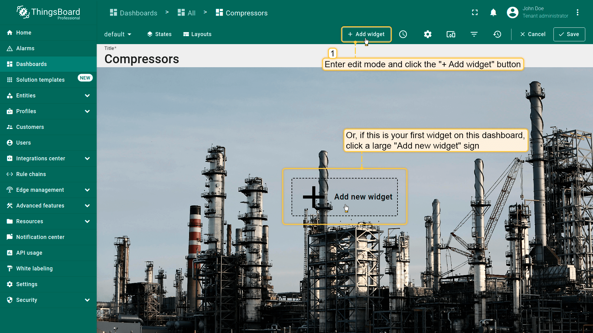 - Enter edit mode of the dashboard and click the "Add new widget" button at the top of the screen;