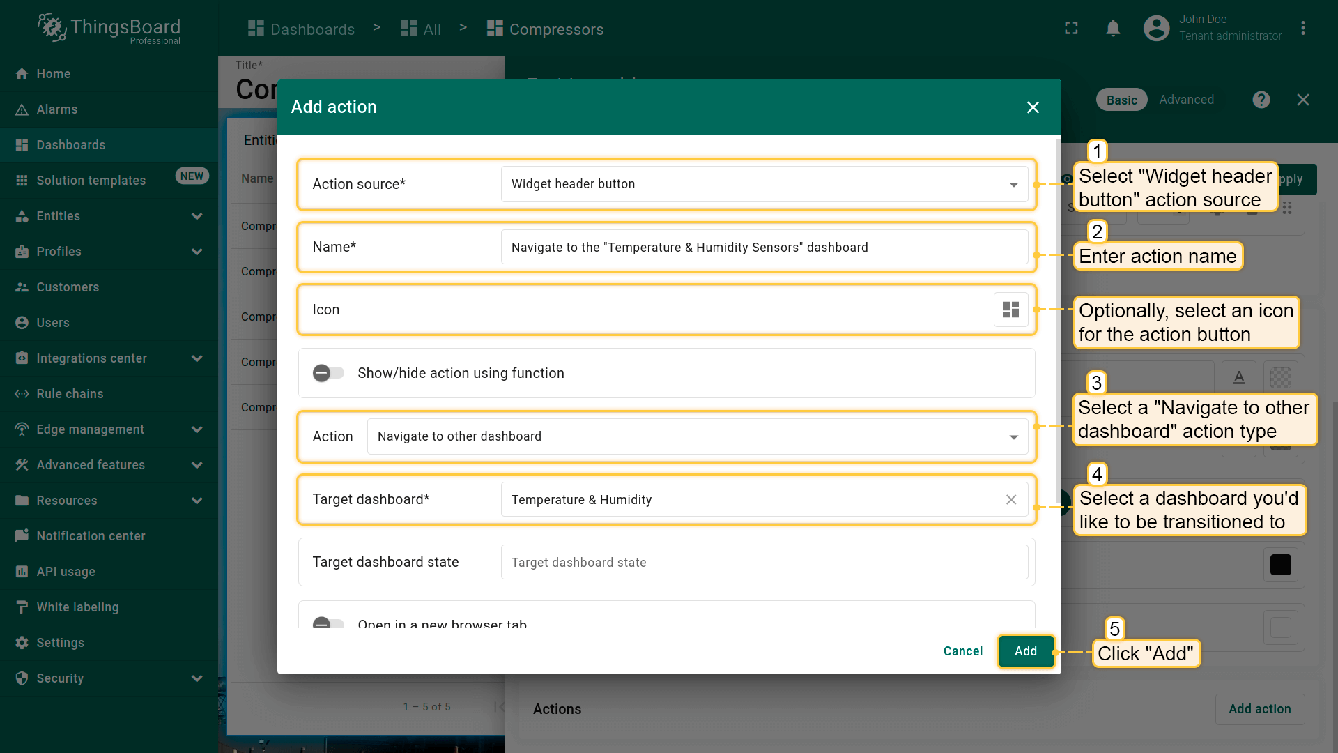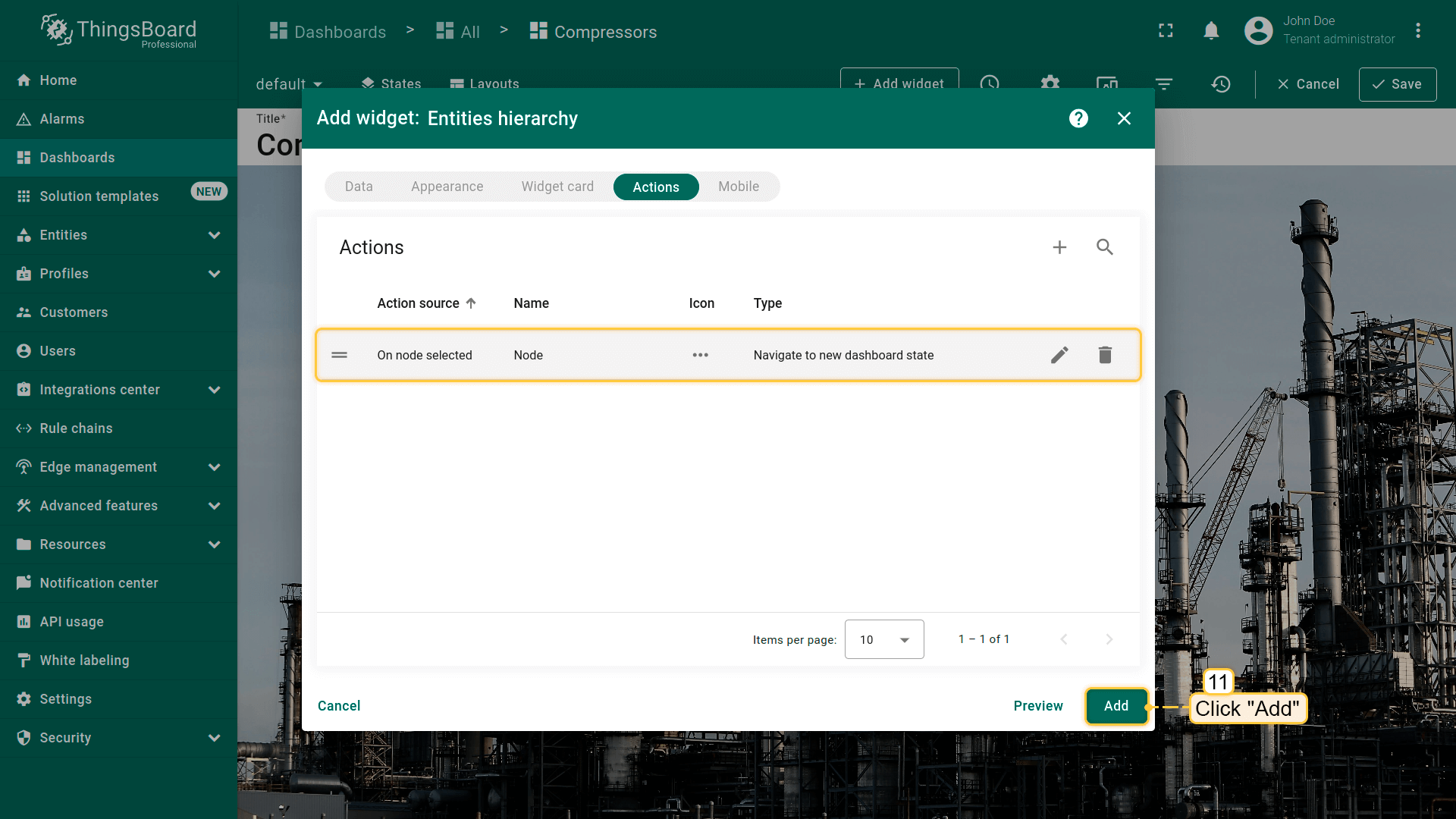- 选择dashboard后,点击“Add action”窗口底部的“Add”按钮;