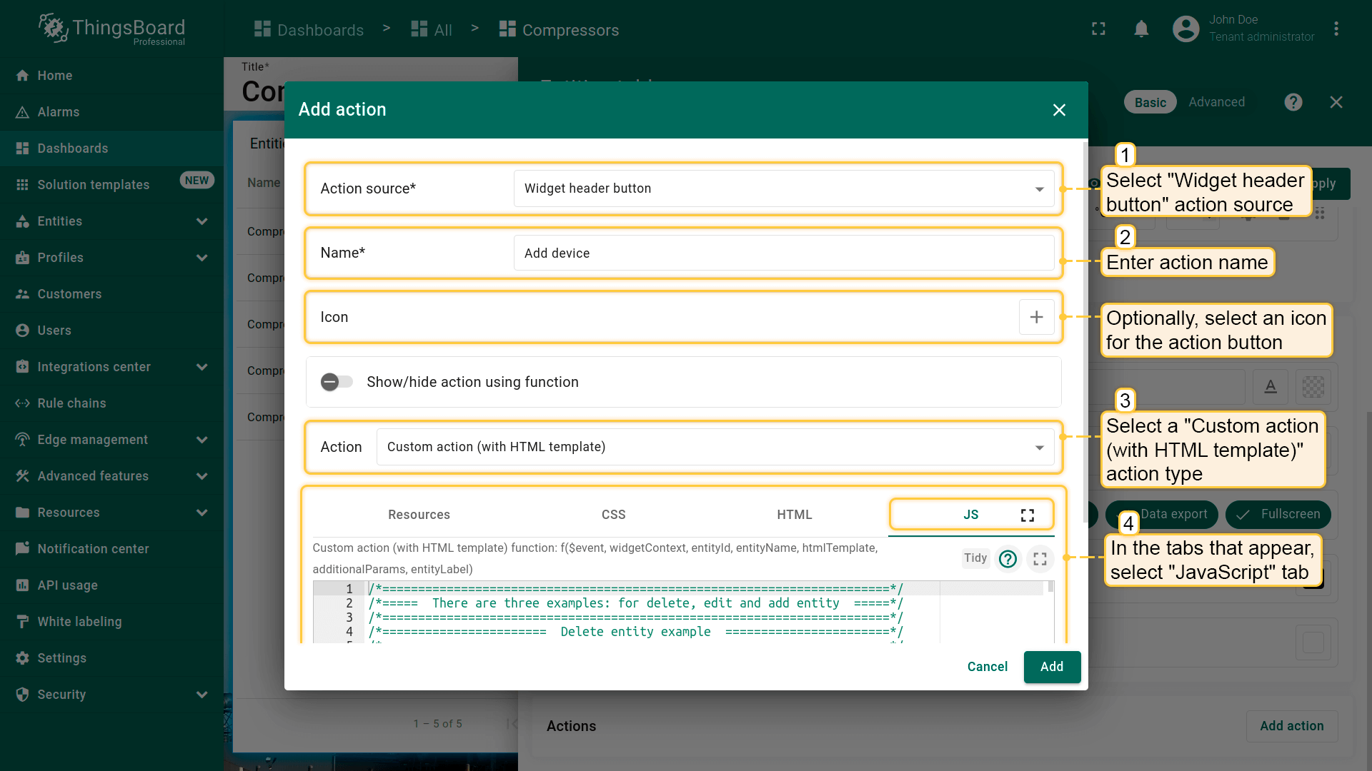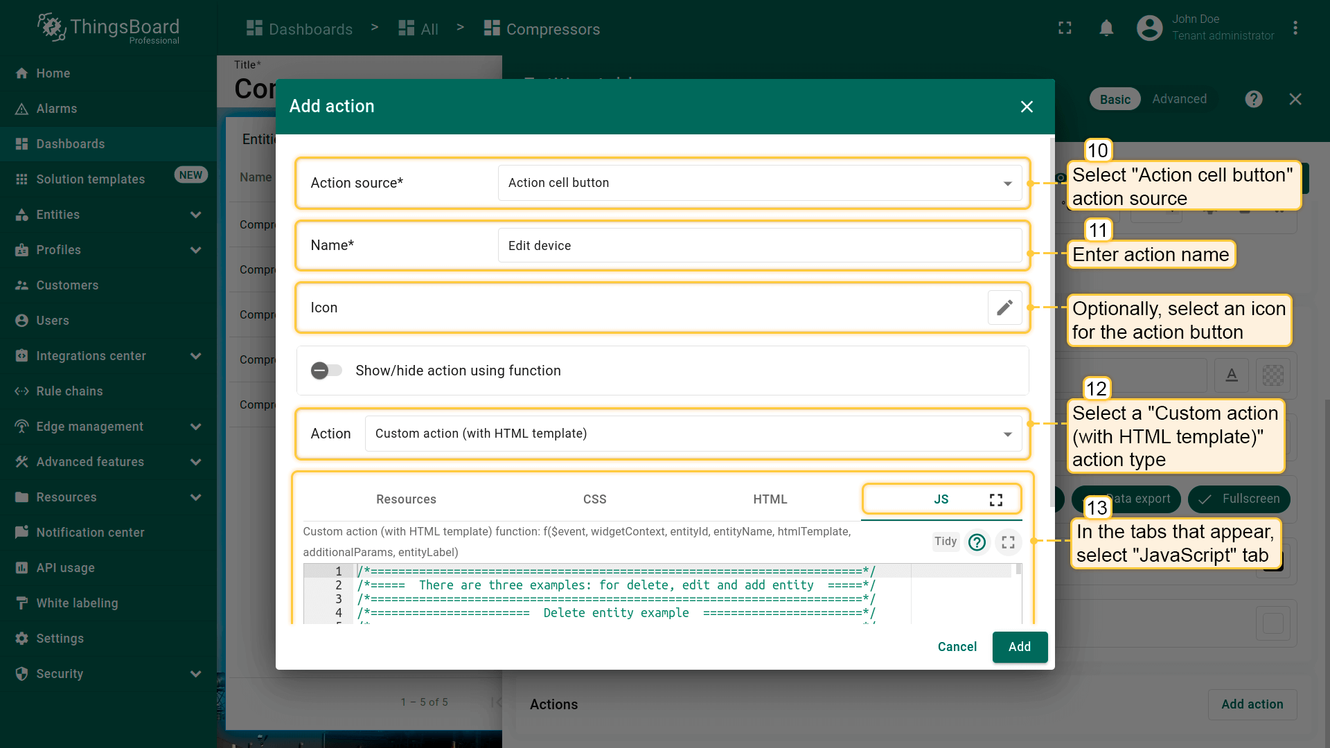 Custom action允许手动配置函数,为部件添加单个action(例如删除列出的设备/资产)。 下面以设备删除为例配置带函数的custom action: