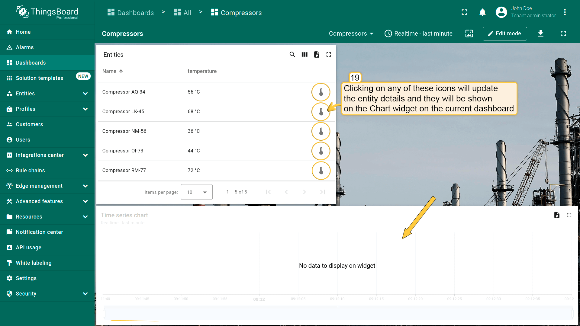 保存后,“Entities table”部件中实体名称旁会显示图标。点击任一图标将更新实体详情,并显示在当前dashboard的“Timeseries Line Chart”部件上。