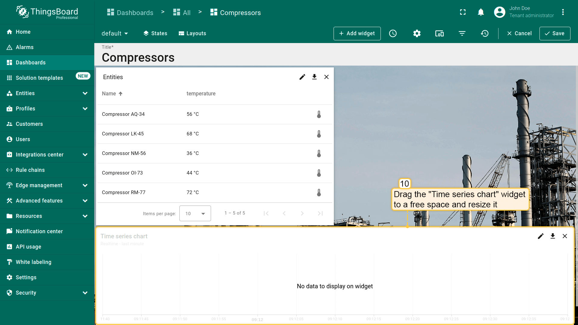 - Drag the "Time series chart" widget to a free space and resize it.