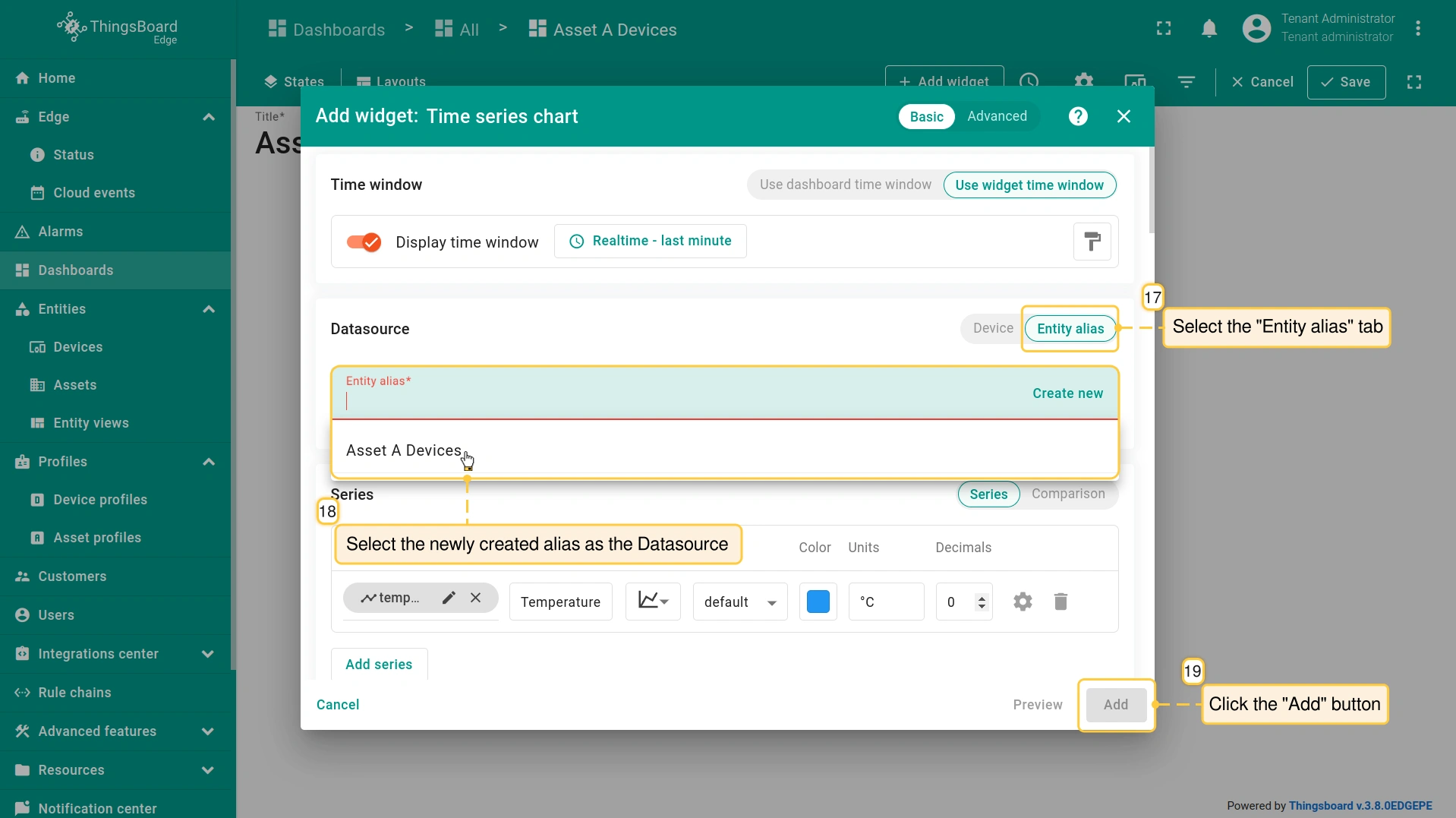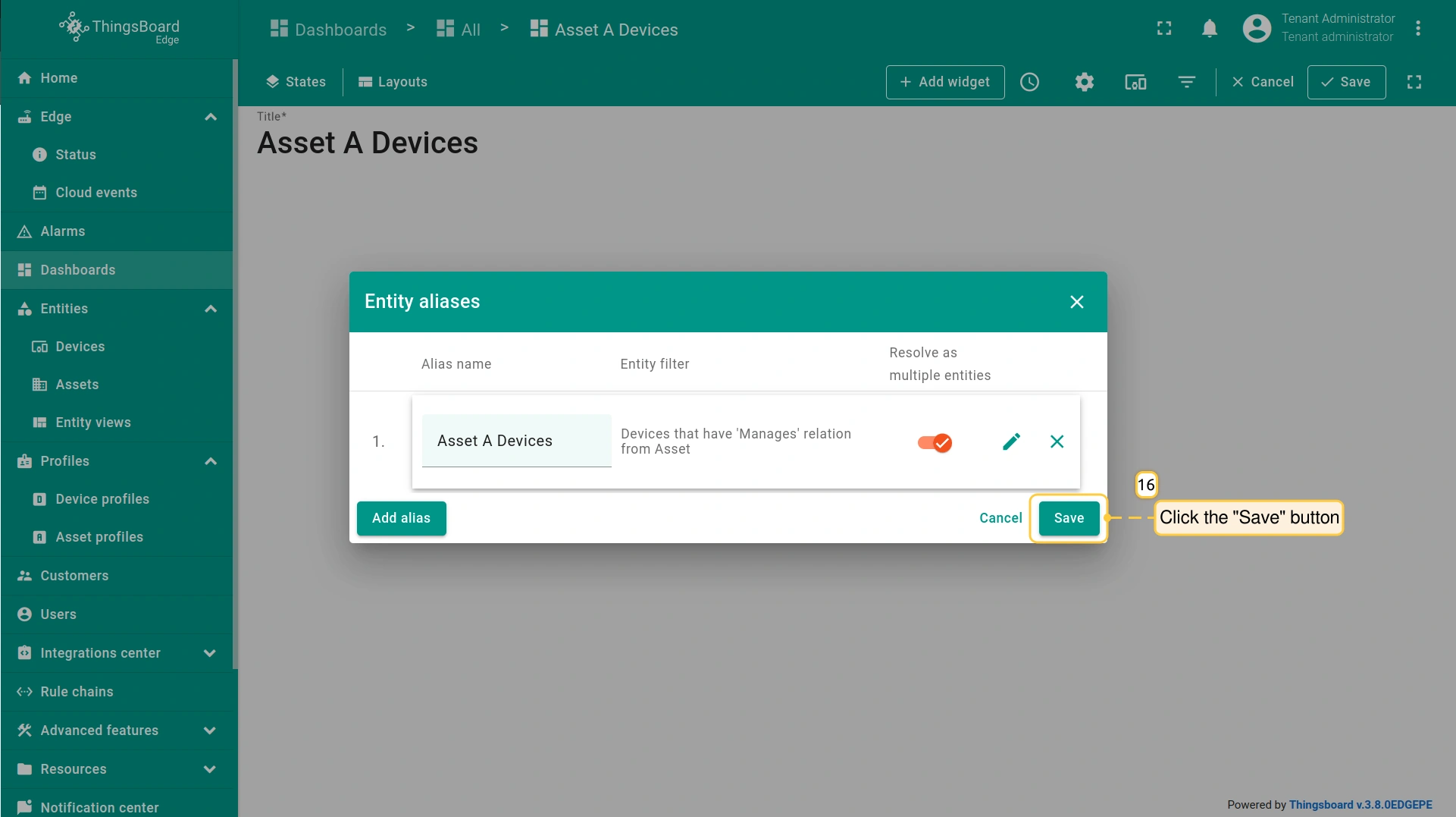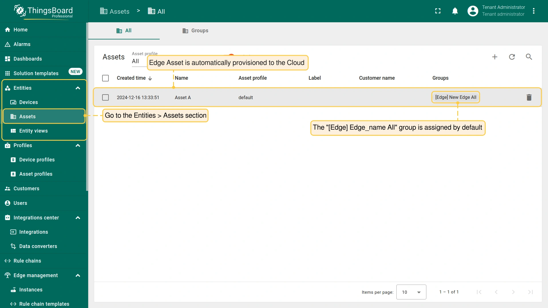 - To verify that the assigned asset is on the Edge, go to the Entities > Assets section.