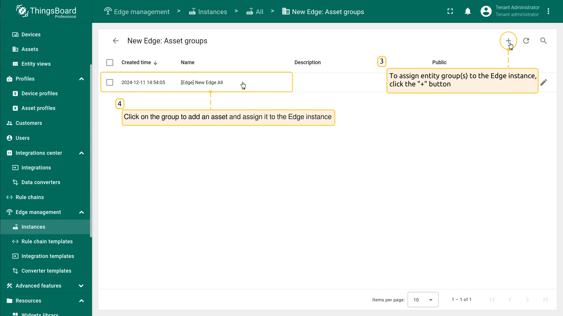 - Once created, the Asset will be automatically provisioned to the Cloud. The "[Edge] Edge_name All" group is assigned by default.